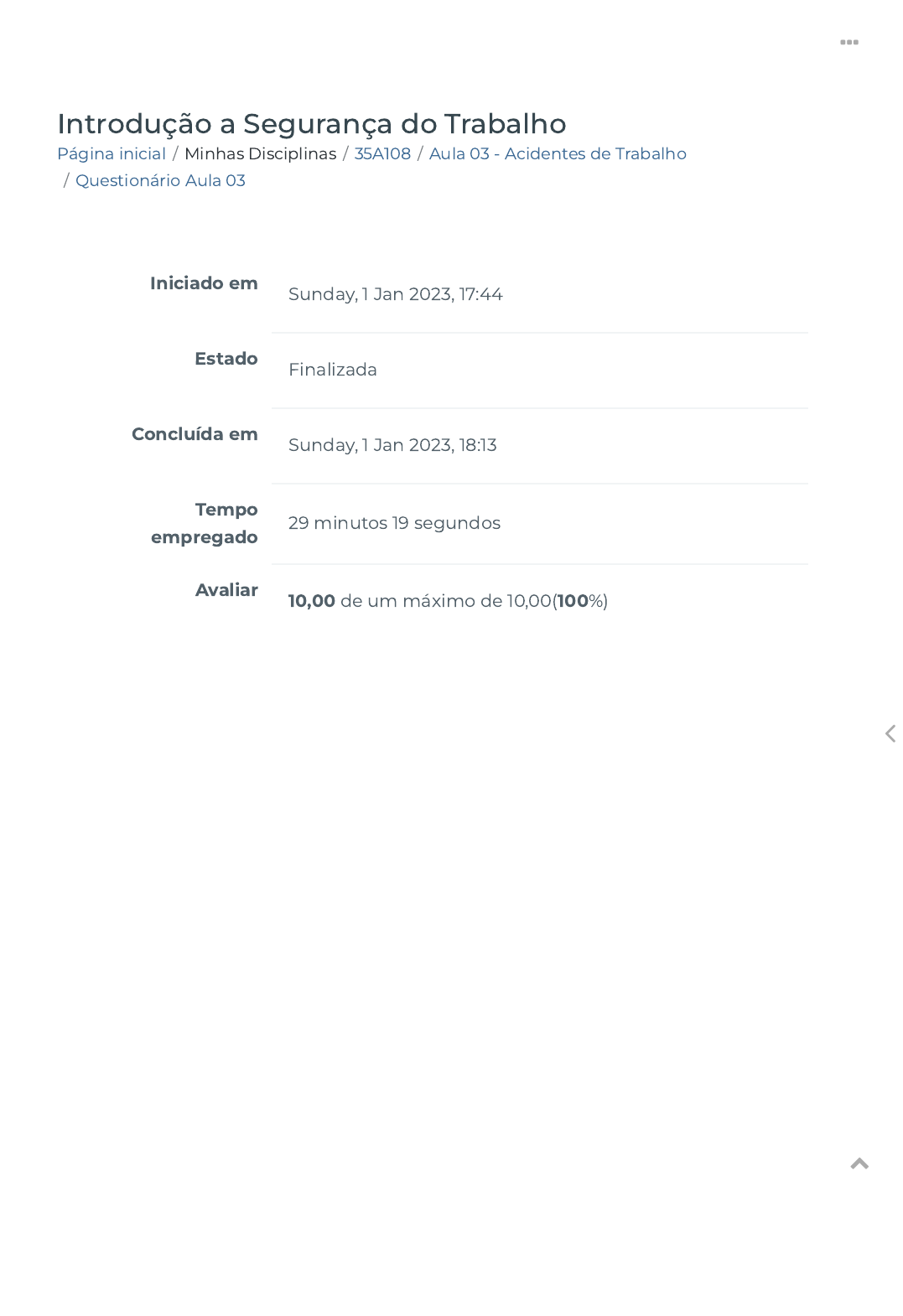01/01/2023 17:14 Questionário Aula 03 https://ava.politecnicabr.com.br/mod/quiz/review.php?attempt=4127978 1/11 Página inicial / Minhas Disciplinas / 35A108 / Aula 03 - Acidentes de Trabalho / Questionário Aula 03 Introdução a Segurança do Trabalho Iniciado em Sunday, 1 Jan 2023, 17:44 Estado Finalizada Concluída em Sunday, 1 Jan 2023, 18:13 Tempo empregado 29 minutos 19 segundos Avaliar 10,00 de um máximo de 10,00(100%) https://ava.politecnicabr.com.br/ https://ava.politecnicabr.com.br/course/view.php?id=1030 https://ava.politecnicabr.com.br/course/view.php?id=1030#section-5 https://ava.politecnicabr.com.br/mod/quiz/view.php?id=25372 https://ava.politecnicabr.com.br/ 01/01/2023 17:14 Questionário Aula 03 https://ava.politecnicabr.com.br/mod/quiz/review.php?attempt=4127978 2/11 Questão 1 Correto Atingiu 1,00 de 1,00 Ao segurado da Previdência Social que �car incapacitado para o trabalho por um determinado período de tempo, em consequência de um acidente de trabalho, é devido um benefício previdenciário denominado Auxílio: Escolha uma opção: a. de Inatividade. b. Complementar. c. Doença. d. Acidente. https://ava.politecnicabr.com.br/ 01/01/2023 17:14 Questionário Aula 03 https://ava.politecnicabr.com.br/mod/quiz/review.php?attempt=4127978 3/11 Questão 2 Correto Atingiu 1,00 de 1,00 Os acidentes do trabalho têm origem complexa, porém existem fatores que favorecem, direta ou indiretamente, sua ocorrência, EXCETO: Escolha uma opção: Questão 3 Correto Atingiu 1,00 de 1,00 Após a cessação do benefício da Previdência Social, o segurado que sofreu acidente de trabalho tem garantida a manutenção do seu contrato de trabalho na empresa por um período mínimo de: Escolha uma opção: a. Condições inseguras. b. Fatores pessoais de insegurança. c. Fatores tecnológicos. d. Atos inseguros. a. 12 (doze) meses. b. 6 (seis) meses. c. 9 (nove) meses. d. 18 (dezoito) meses. https://ava.politecnicabr.com.br/ 01/01/2023 17:14 Questionário Aula 03 https://ava.politecnicabr.com.br/mod/quiz/review.php?attempt=4127978 4/11 Questão 4 Correto Atingiu 1,00 de 1,00 O segurado da Previdência Social que sofreu acidente do trabalho tem garantida, por determinado período de tempo, a manutenção do seu contrato de trabalho após a cessação do benefício previdenciário, independente da percepção de outro benefício. Esse período de tempo é de: Escolha uma opção: a. Pelo prazo mínimo de 10 (dez) meses, a manutenção do seu contrato de trabalho na empresa, após a cessação do auxílio- doença acidentário, independentemente de percepção de auxílio-acidente. b. Não há estabilidade. c. Pelo prazo mínimo de 6 (seis) meses, a manutenção do seu contrato de trabalho na empresa, após a cessação do auxílio- doença acidentário, independentemente de percepção de auxílio-acidente. d. Pelo prazo mínimo de 12 (doze) meses, a manutenção do seu contrato de trabalho na empresa, após a cessação do auxílio- doença acidentário, independentemente de percepção de auxílio-acidente. https://ava.politecnicabr.com.br/ 01/01/2023 17:14 Questionário Aula 03 https://ava.politecnicabr.com.br/mod/quiz/review.php?attempt=4127978 5/11 Questão 5 Correto Atingiu 1,00 de 1,00 O auxílio-doença será devido ao segurado que �car incapacitado para o seu trabalho ou para a sua atividade habitual por mais de: Escolha uma opção: a. 15 (quinze) dias consecutivos. b. 30 (trinta) dias consecutivos. c. 15 (quinze) dias. d. 20 (quinze) dias consecutivos. https://ava.politecnicabr.com.br/ 01/01/2023 17:14 Questionário Aula 03 https://ava.politecnicabr.com.br/mod/quiz/review.php?attempt=4127978 6/11 Questão 6 Correto Atingiu 1,00 de 1,00 A reabilitação pro�ssional compreende, EXCETO: Escolha uma opção: a. A reparação ou a substituição dos aparelhos mencionados anteriormente, desgastados pelo uso normal ou por ocorrência estranha à vontade do bene�ciário. b. Uma alimentação balanceada. c. O fornecimento de aparelho de prótese, órtese e instrumentos de auxílio para locomoção quando a perda ou redução da capacidade funcional puder ser atenuada por seu uso e dos equipamentos necessários à habilitação e reabilitação social e pro�ssional. d. O transporte do acidentado do trabalho, quando necessário https://ava.politecnicabr.com.br/ 01/01/2023 17:14 Questionário Aula 03 https://ava.politecnicabr.com.br/mod/quiz/review.php?attempt=4127978 7/11 Questão 7 Correto Atingiu 1,00 de 1,00 Numa empresa com 900 funcionários, conforme a Lei 8.213, de 24/07/1991, que dispõe sobre os Planos de Benefícios da Previdência Social, qual a porcentagem mínima de vagas que ela deve observar na contratação de Portadores de Necessidades Especiais (PNE)? Escolha uma opção: a. 3% b. 4% c. 5% d. 2% https://ava.politecnicabr.com.br/ 01/01/2023 17:14 Questionário Aula 03 https://ava.politecnicabr.com.br/mod/quiz/review.php?attempt=4127978 8/11 Questão 8 Correto Atingiu 1,00 de 1,00 No conceito prevencionista, as causas de um acidente do trabalho são, na maioria das vezes, complexas, porém há três fatores que diretamente ou indiretamente atuam no desencadeamento de qualquer acidente: Escolha uma opção: a. Agentes mecânicos, agentes da lesão, condição insegura, tipo de acidente, fator pessoal inseguro. b. Agente da lesão, condição insegura, tipo de acidente, ato inseguro e fator pessoal inseguro. c. Agente físico, condição insegura, agente da lesão, tipo de acidente e fator pessoal inseguro. d. Atos inseguros, Condições inseguras e Fator pessoal de insegurança. https://ava.politecnicabr.com.br/ 01/01/2023 17:14 Questionário Aula 03 https://ava.politecnicabr.com.br/mod/quiz/review.php?attempt=4127978 9/11 Questão 9 Correto Atingiu 1,00 de 1,00 Mateus, técnico em Segurança do Trabalho, trabalha numa empresa com 300 funcionários. Conforme a Lei 8.213 de 24/07/1991, que dispõe sobre os Planos de Benefícios da Previdência Social, qual a porcent