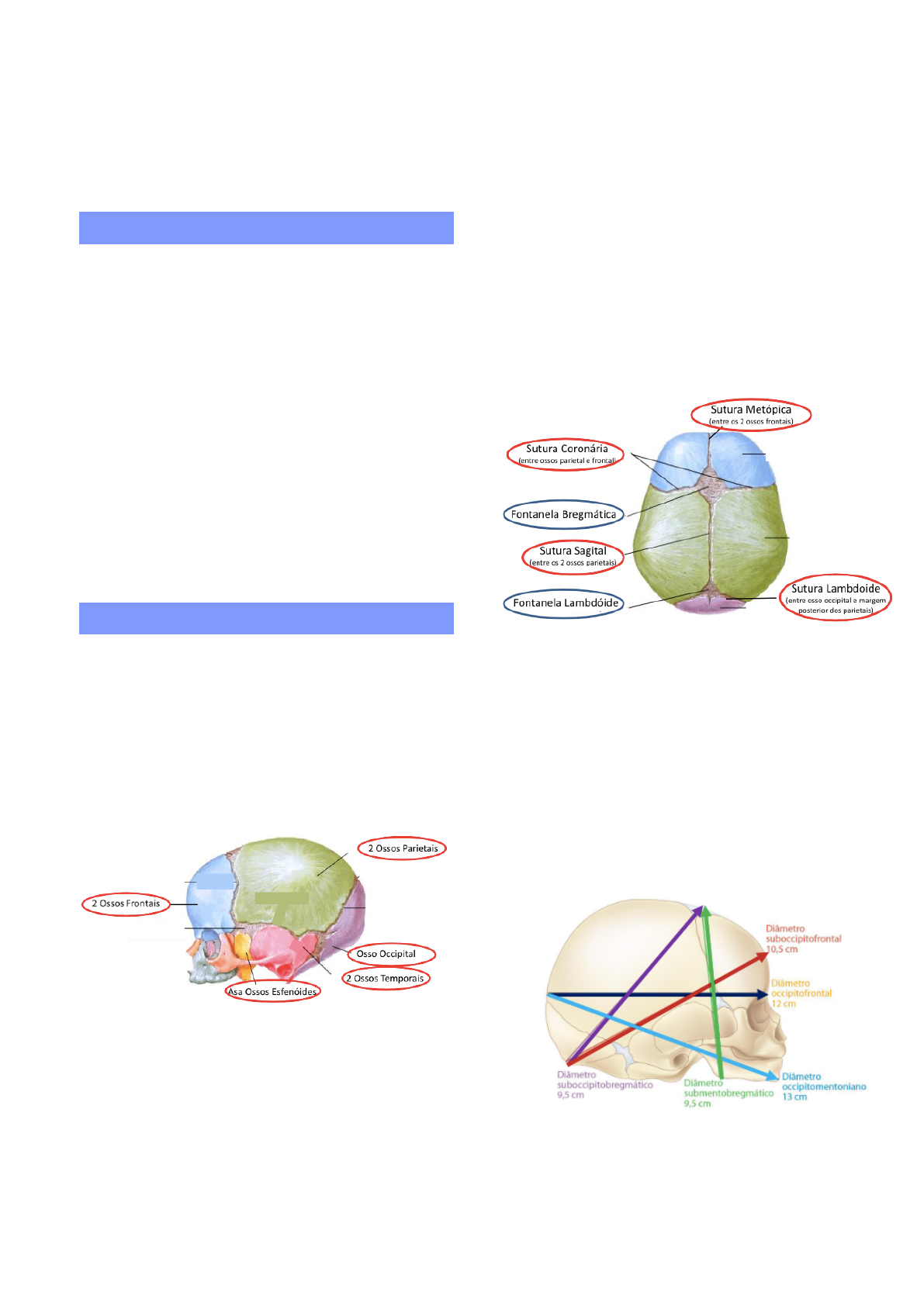 Obstetrícia Catarina Alipio XXIIB Introdução: - Precisamos que 3 fatore trabalhem adequadamente para termos um parto normal: • Motor = contratilidade uterina adequada. • Objeto = posição do feto. • Trajeto = bacia materna. - Desses fatores podemos modificar a contratilidade uterina, e a posição do feto. - A bacia é o único fator que não conseguimos mudar. - RELAÇÕES ÚTERO FETAIS: relação entre o organismo materno e o produto conceptual (feto). Cabeça fetal: - Ossos do crânio: • 2 ossos parietais. • 2 ossos frontais. • Osso occipital. • 2 ossos temporais. • Așa dos ossos esfenóides. - Os ossos são separados por intervalos membranosos (suturas) cujas confluências entre elas delimitam pequenos espaços (fontanelas). • Suturas: - Metópica: entre os 2 ossos frontais. - Coronária: entre ossos parietal e frontal. - Sagital: entre os 2 ossos parietais. - Lambdoide: entre o osso occipital e margem posterior dos parietais. • Fontanelas: - Fontanelas bregmática. - Fontanela lambdóide. Durante o exame de toque procura-se a sutura sagital e a fontanela lambdóide. - Diâmetros da cabeça fetal: • Diâmetro occiptofrontal = 12 cm. • Diâmetro suboccipitofrontal = 10,5 cm. • Diâmetro occipitomentoniano = 13 cm. • Diâmetro submentobregmático = 9,5 cm. • Diâmetro suboccipitobregmático = 9,5 cm. • Conforme o bebê vai passando pelo canal de parto, esses diâmetros vão sendo substituídos. 43 Feto termo e relações uterofetais Dra. Paula - 23/02 Obstetrícia Catarina Alipio XXIIB - Existe um tipo de apresentação que impede que o feto nasce por parto normal. • Diâmetro biparietal (+ importante) = 9,5 cm. • Diâmetro bitemporal = 7,5 cm. • Diâmetro bimalar = 7 cm. Quando ocorre a passagem do diâmetro biparietal pela estreito superior da bacia o bebê se insinuou (“barriga desceu”). - Cintura escapular: • Equivale aos ombros do feto. • Diâmetro biacromial: entre os 2 acrônimos. - Mede 12 cm, mas durante o parto apresenta a redução para 9 cm. - Cintura pélvica: • Equivale ao quadril do feto. • Diâmetro bi-trocantérico: estende-se de um trocânter ao outro. - Mede 9 cm. Relações uterofetais: - ALTITUDE: • Relação das diversas partes fetais entre si. • Na maioria das vezes há flexão generalizada. • Forma oval com 2 extremidades: polo cefálica e pélvico. ‣ A ausência persistente de flexão de todos os membros é anormal e pode significar sofrimento feta grave por perda do tônus muscular. - SITUAÇÃO: • Relação entre o maior eixo fetal e maior eixo da cavidade uterina. - Longitudinal (99,5%): mesmos eixos. - Transversa (0,5%): eixos opostos. - Oblíqua (situação transitória/ passageira). • Pode mudar ao longo da gravidez. - APRESENTAÇÃO: • Região fetal que ocupa o estreito superior da bacia obstétrica e nela vai se insinuar. I. Cefálica (96,5%): situação longitudinal. II. Pélvica (3,0%): situação longitudinal. III. Córmica (0,5%): quando o bebe está em uma situação transversa. 44 Obstetrícia Catarina Alipio XXIIB I. Apresentação cefálica: • Fletida (95,5%): na maioria das vezes está cefálico fletido (queixo encostando no tórax) - posição mais fisiológica. • Defletido corresponde à 1,0%. - Defletido (1º grau). - Defletido (2º grau). - Defletido (3º grau). II. Apresentação pélvica: • Completa (sentado com as coxas sob o abdome) - 2,0%. • Incompleta (1,0%): - Incompleta de nádegas (pernas esticadas). - Incompleta de pés ou joelhos (para fora). III. Apresentação córmica: correspondem a 0,5%. • Dorso anterior. • Dorso posterior. Posição e variedade de posição: - Escola alemã: relação do dorso fetal com o lado materno. • Esquerda = 1ª posição (maioria). • Direita = 2ª posição. - Olhando da paciente em posição ginecológica. - Objetivo: buscar a melhor localização para ausculta do BCF (geralmente onde está o dorso). ‣ Exceção: defletida 3º grau. • Se o bebê estiver cefálico termo (acima de 37 semanas) ausculta abaixo da cicatriz umbilical. • Se o bebê estiver pélvico termo acima da cicatriz umbilical. - VARIEDADE DE POSIÇÃO: relaciona o ponto de referência fetal com o ponto de referência da mãe (ao exame de toque). ‣ 1ª letra: é o ponto de referência da apresentação fetal (ponto de referência da cabeça do bebê): - Cefálico fletido (occipício = O) - occipício é o triângulo da cabeça do bebê. 45 Obstetrícia Catarina Alipio XXIIB - Defletida 1º grau (bregma = B). - Defletida 2º grau (naso / glabela = N). - Defletida 3º grau (mento = M). - Pélvica (sacro = S). - Córmica (acrômio = A). ‣ 2ª letra: lado materno para o qual está voltado o ponto de referência fetal (1ª letra). • D = direita. • E = esquerda. ** lembrar que é ao contrario!! 46 Cefálica fletida = occipício. Defletida 1º grau = bregma. Defletida 2º grau = naso ou glabela. Defletida 3º grau = mento. Pélvica = sacro. Córmica = acrômio. Obstetrícia Catarina Alipio XXIIB ‣ 3ª letra: indica a variedade de posição conforme o feto esteja voltado para o ponto de referência da bacia materna. • Anterior = em direção ao umbigo. • Posterior = em direção ao sacro. - Púbis (P) = púbis. - Anterior (A) = eminência iliopectínea. - Transversa (T) = extremidade do diâmetro transverso. - Posterior (P) = sinestose sacroilíaca. - Sacro (S) = sacro. • Exceção: - Defletido 3º grau (mento): mento e dorso estão ao contrário. 47 Obstetrícia Catarina Alipio XXIIB 48