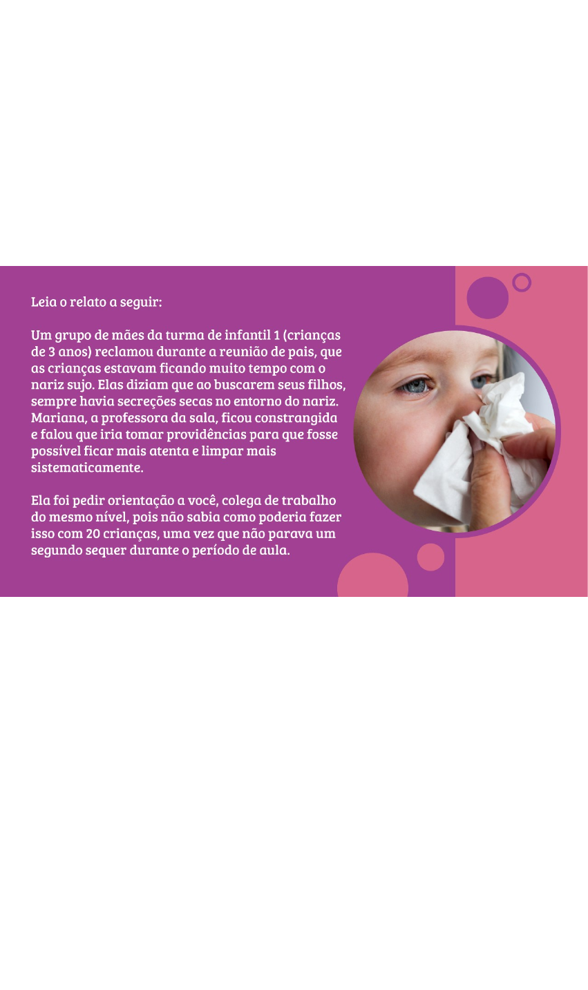 O Cuidar e o Educar na Educação Infantil Desafio Historicamente, a educação infantil surgiu com o objetivo de oferecer cuidados às crianças, de modo que suas mães pudessem se inserir no mercado de trabalho. Estudos realizados, sobretudo pela Psicologia, demonstraram a importância dessa etapa do desenvolvimento das aprendizagens humanas. Com isso, a educação infantil reviu seu papel, passando a ter como objetivos o cuidar e o educar, de maneira integrada Para auxiliar Mariana, responda: a) Qual é o papel do professor de educação infantil, no que diz respeito aos cuidados com a higiene dos educandos? É correto afirmar que cabe ao professor dessa etapa da educação básica apenas educar as crianças? Por quê? b) Que sugestões você daria para que a professora desse conta do que foi solicitado pelos pais? Padrão de resposta esperado a) É papel do professor da educação infantil educar e cuidar das crianças. Sendo assim, os cuidados com a higiene pessoal são de responsabilidade dele. A professora precisa estar mais atenta aos narizes das crianças, sendo auxiliada nessa tarefa por uma estagiária. Ela pode manter uma caixa de lenços de papel na própria sala, para que não tenha que se ausentar sempre que precisar limpar o nariz de alguma criança. b) Como a autonomia deve ser um dos objetivos da educação infantil, a professora pode ensinar as crianças a limpar o nariz, incentivando-as a que façam isso sempre que necessário. Em um primeiro momento, ela precisará supervisionar a tarefa. À medida que as crianças forem mostrando domínio sobre a tarefa, podem realizá-la sozinhas. Infográfico O cuidar e o educar devem fazer parte da rotina das classes de educação infantil. Os cuidados com as crianças devem ser planejados de forma que, com o tempo, estas possam exercer o autocuidado de forma autônoma. Neste Infográfico, você vai encontrar sugestões de como incorporar alguns cuidados na rotina das classes das creches e pré-escolas. Na prática Apesar de as discussões de integração entre os aspectos de cuidar e educar na educação infantil não serem recentes, os professores ainda não se dão conta de como os aspectos relacionados aos cuidados devem ser contemplados por eles. Sendo assim, a formação continuada, a qual ocorre no interior das instituições de ensino, tem um papel importante nessa conscientização. Veja a seguir. Exercícios 1. A instituição de educação infantil tem um papel de grande importância no desenvolvimento infantil. Nesse processo, a mediação do professor se faz fundamental. Diante do exposto, assinale a alternativa que corresponde ao papel da escola e do professor na educação infantil. Você acertou! B. A função da escola e do professor da educação infantil é garantir os cuidados físicos das crianças sob sua responsabilidade, bem como promover avanços no processo de construção de novos conhecimentos. A função da escola e do professor da educação infantil é cuidar e educar as crianças de 0 a 5 anos. As necessidades de nutrição, higiene, descanso, brincadeiras, interação, movimento, expressão, aquisição de habilidades e conhecimentos próprios de cada idade devem ser oportunizados para que a criança se desenvolva integralmente. A brincadeira deve ser um dos eixos estruturantes das práticas pedagógicas. Contudo, além dela, outras experiências e saberes devem ser oportunizados na educação infantil. 2. Durante muito tempo as instituições de educação infantil foram concebidas como espaço de cuidados infantis. Essa concepção foi revista a partir das contribuições da psicologia do desenvolvimento. Desde então: Você acertou! A. a ação pedagógica é caracterizada pela integração entre educar e cuidar. A ação pedagógica na educação infantil é caracterizada pela integração e pela indissociabilidade entre o cuidar e o educar para a promoção das aprendizagens e do desenvolvimento infantil. O desenvolvimento de habilidades cognitivas, linguísticas e psicomotoras se dá pela educação e pelos cuidados, envolvendo a família das crianças e a comunidade escolar. Como os cuidados e a educação devem estar assegurados na escola de educação infantil, essas ações precisam ser planejadas e não devem ocorrer apenas se emergirem do cotidiano infantil. 3. É papel das instituições de educação infantil o cuidar e o educar. Sobre a necessidade de integração entre educar e cuidar no cotidiano dessas instituições, pode-se afirmar que: Você acertou! D. as práticas de cuidado e educação devem ser concebidas como ações complementares e indissociáveis, favorecendo a formação integral da criança. As práticas de cuidado e educação devem ser concebidas como ações complementares e indissociáveis, tanto nas creches como nas pré-escolas. Cabe ao professor integrar essas duas ações, sem delegar o cuidar para os técnicos de ensino. O caráter da educação infantil, tanto nas creches como nas pré-escolas é educacional, e não assistencial. 4. O trabalho pedagógico nas instituições de educação infantil deve contemplar as dimensões do cuidar e do educar. A respeito dessas duas dimensões, assinale a opção correta. Você acertou! B. O cuidar e o educar são duas dimensões indissociáveis das práticas educativas na educação infantil. Cuidar e educar devem fazer parte das ações educativas, tanto nas creches como nas pré-escolas. A escola não é a única responsável pela educação das crianças, assim como a família não é a única responsável pelos cuidados. O desenvolvimento integral das crianças depende da integração dessas duas dimensões da educação infantil. 5. Conforme as Diretrizes Curriculares Nacionais para a Educação Infantil (DCNEI), as instituições de educação infantil devem possibilitar, em suas propostas pedagógicas, práticas e cuidados que promovam a integração entre os aspectos físicos, emocionais, afetivos, cognitivo/