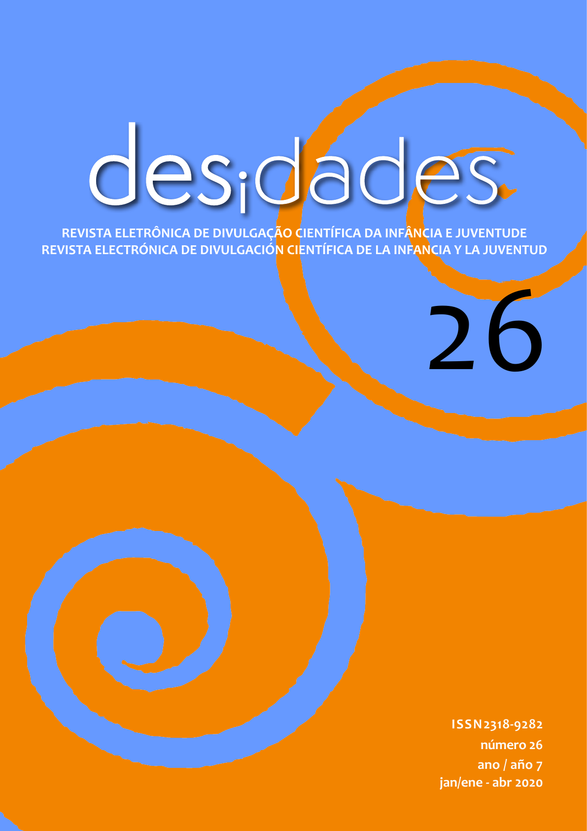 ISSN 2318-9282 número 26 ano / año 7 jan/ene - abr 2020 26 REVISTA ELETRÔNICA DE DIVULGAÇÃO CIENTÍFICA DA INFÂNCIA E JUVENTUDE REVISTA ELECTRÓNICA DE DIVULGACIÓN CIENTÍFICA DE LA INFANCIA Y LA JUVENTUD APOIO/APOYO REALIZAÇÃO/REALIZACIÓN PARCEIROS/INSTITUCIONES ASOCIADAS . número 26 . ano/año 8 . jan/ene - abr 2020 2 temas em destaque 2 INDEXADORES 2 temas em destaque 2 REVISTA ELETRÔNICA DE DIVULGAÇÃO CIENTÍFICA DA INFÂNCIA E JUVENTUDE REVISTA ELECTRÓNICA DE DIVULGACIÓN CIENTÍFICA DE LA INFANCIA Y LA JUVENTUD . número 26 . ano/año 8 . jan/ene - abr 2020 apresentação/presentación DESIDADES é uma revista científica eletrônica na área da infância e juventude latino-americanas, com periodicidade quadrimestral. Publica textos em português ou espanhol. É uma publicação do Núcleo Interdisciplinar de Pesquisa para a Infância e Adolescência Contemporâneas, NIPIAC, da Universidade Federal do Rio de Janeiro. Está comprometida em divulgar a pesquisa científica para além dos muros da Universidade estabelecendo um diálogo com pesquisadores, profissionais, estudantes e demais interessados na área da infância e juventude. A Revista publica originais inéditos de artigos, entrevistas e resenhas desde uma abordagem multidisciplinar da infância e juventude. O título desta revista – DESIDADES – foi cunhado para significar a perspectiva teórica, ética e política que sustenta sua práxis editorial. Assume-se que as idades, como critérios fixos que naturalizam comportamentos, habilidades e modos de existência de acordo com uma temporalização biográfica linear, precisam ser problematizadas de modo a permitir novas abordagens e conceitos sobre as relações entre os grupos geracionais. DESIDADES es una revista científica electrónica en el área de la infancia y juventud latinoamericanas, con periodicidad cuatrimestral. Publica textos en portugués o español. Es una publicación del Núcleo Interdisciplinar de Pesquisa para a Infância e Adolescência Contemporâneas, NIPIAC, de la Universidade Federal do Rio de Janeiro. Está comprometida en divulgar la investigación científica mas allá de los muros de la Universidad estableciendo un diálogo con investigadores, profesionales, estudiantes y demás interesados en el área de la infancia y la juventud. La Revista publica originales inéditos de artículos, entrevistas y reseñas desde un abordaje multidisciplinario de la infancia y la juventud. El título de esta revista – DESIDADES – fue acuñado para significar la perspectiva teórica, ética y política que sustenta su praxis editorial. Se asume que las edades, con criterios fijos que naturalizan comportamientos, habilidades y modos de existencia de acuerdo con una temporalización biográfica linear, precisan ser problematizadas de modo que permitan nuevos abordajes y conceptos sobre las relaciones entre los grupos generacionales. equipe editorial/equipo editorial EDITOR A CHEFE/EDITOR A JEFE Lucia Rabello de Castro CO-EDITOR A Sonia Borges Cardoso de Oliveira EDITORAS ASSOCIADAS/EDITORAS ASOCIADAS Andrea Martello Paula Uglione Renata Alves de Paula Monteiro Renata Tomaz Sabrina dal Ongaro Savegnago EDITORES ASSISTENTES/EDITORES ASISTENTES Adelaide Rezende de Souza Ana Paula Oliveira e Silva Carneiro Antônio Gonçalves Ferreira Júnior Felipe Salvador Grisolia Juliana Siqueira de Lara Karima Oliva Melo Lis Albuquerque Melo Luísa Evangelista Vieira Prudêncio Paula Pimentel Tumolo Renata Tavares da Silva Guimarães Sofia Hengen EQUIPE TÉCNICA/EQUIPO TÉCNICO Gabriela Fernandes Castro Julia Oliveira Moraes Julia Page Leticia Rosa Machado Luana Papelbaum Micmacher Maria Clara Teldeschi Maryssol Monteiro Fernandes do Nascimento Melly Meireles Michelle Rodrigues Simões Nahan Rios Natália Belarmino Túlio Ferreira Fialho REVISOR Welton Pereira e Silva TR ADUTOR AS/TR ADUCTOR AS Flavia Ferreira dos Santos Karima Oliva Bello Sofia Hengen . número 26 . ano/año 8 . jan/ene - abr 2020 CONSELHO CIENTÍFICO NACIONAL / CONSEJO CIENTÍFICO NACIONAL Alfredo Veiga-Neto Universidade Federal do Rio Grande do Sul Alexandre Simão de Freitas Universidade Federal de Pernambuco Ana Cristina Coll Delgado Universidade Federal de Pelotas Ana Maria Monteiro Universidade Federal do Rio de Janeiro Angela Alencar de Araripe Pinheiro Universidade Federal do Ceará Angela Maria de Oliveira Almeida Universidade de Brasília Anna Paula Uziel Universidade Estadual do Rio de Janeiro Carmem Lucia Sussel Mariano Universidade Federal de Mato Grosso Clarice Cassab Universidade Federal de Juiz de Fora Claudia Mayorga Universidade Federal de Minas Gerais Cristiana Carneiro Universidade Federal do Rio de Janeiro Diana Dadoorian Universidade Federal do Rio de Janeiro Dorian Monica Arpini Universidade Federal de Santa Maria Elisete Tomazetti Universidade Federal de Santa Maria Fernanda Costa-Moura Universidade Federal do Rio de Janeiro Flavia Pires Universidade Federal da Paraíba Gizele de Souza Universidade Federal do Paraná Heloísa Helena Pimenta Rocha Universidade Estadual de Campinas Iolete Ribeiro da Silva Universidade Federal do Amazonas Jader Janer Moreira Lopes Universidade Federal Fluminense Jaileila de Araújo Menezes Universidade Federal de Pernambuco Jailson de Souza e Silva Universidade Federal Fluminense Jane Felipe Beltrão Universidade Federal do Pará Juarez Dayrell Universidade Federal de Minas Gerais Juliana Prates Santana Universidade Federal da Bahia Leandro de Lajonquière Universidade de São Paulo Leila Maria Amaral Ribeiro Universidade Federal do Rio de Janeiro Lila Cristina Xavier Luz Universidade Federal do Piauí Marcos Cezar de Freitas Universidade Federal de São Paulo Marcos Ribeiro Mesquita Universidade Federal de Alagoas Maria Alice Nogueira Universidade Federal de Minas Gerais Maria Aparecida Morgado Universidade Federal de Mato Grosso Maria Cristina Soares de Gouvea Universidade Federal de Minas Gerais Maria Helena Oliva Augusto Universidad