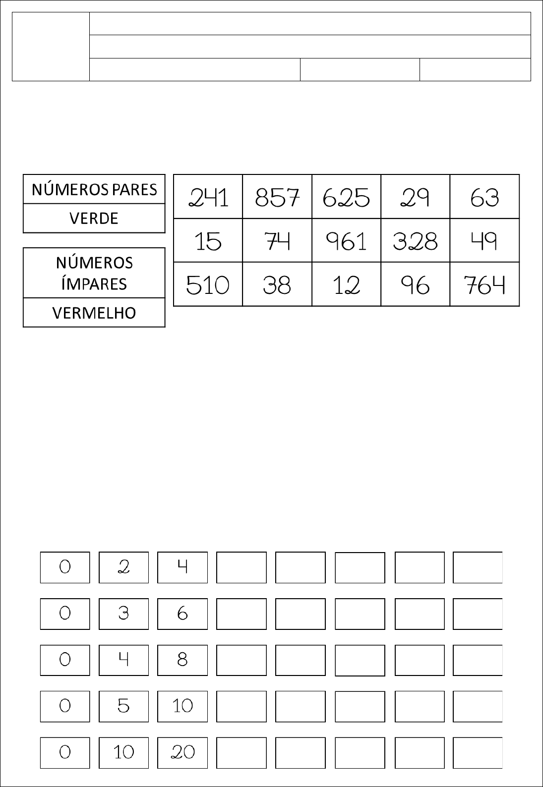 ESCOLA NOME: PROFESSOR(A): TURMA: NOTA: AVALIAÇÃO DE MATEMÁTICA 1. OBSERVE O QUADRO ABAIXO, PINTE OS NÚMEROS CONFORME A LEGENDA E DEPOIS RESPONDA: A) QUAL É O MAIOR NÚMERO PAR QUE VOCÊ PINTOU? __________________________ B) QUAL É O MAIOR NÚMERO ÍMPAR QUE VOCÊ PINTOU? ________________________ C) QUAL É O MENOR NÚMERO PAR QUE VOCÊ PINTOU? _________________________ D) QUAL É O MENOR NÚMERO ÍMPAR QUE VOCÊ PINTOU? _______________________ E) ORGANIZE OS NÚMEROS PARES EM ORDEM CRESCENTE: _______________________________________________________________________ 2. CONTINUE AS SEQUÊNCIAS: 3. SEU ZÉ LEVOU 87 OVOS PARA SEREM VENDIDOS NA FEIRA. ELE CONSEGUIU VENDER APENAS 56. QUANTOS OVOS RESTARAM? 4. UM CARTEIRO ENTREGOU 452 CARTAS DE MANHÃ E 175 A TARDE. QUANTAS CARTAS ELE ENTREGOU NESSE DIA? 5. ARME E EFETUE AS CONTINHAS: