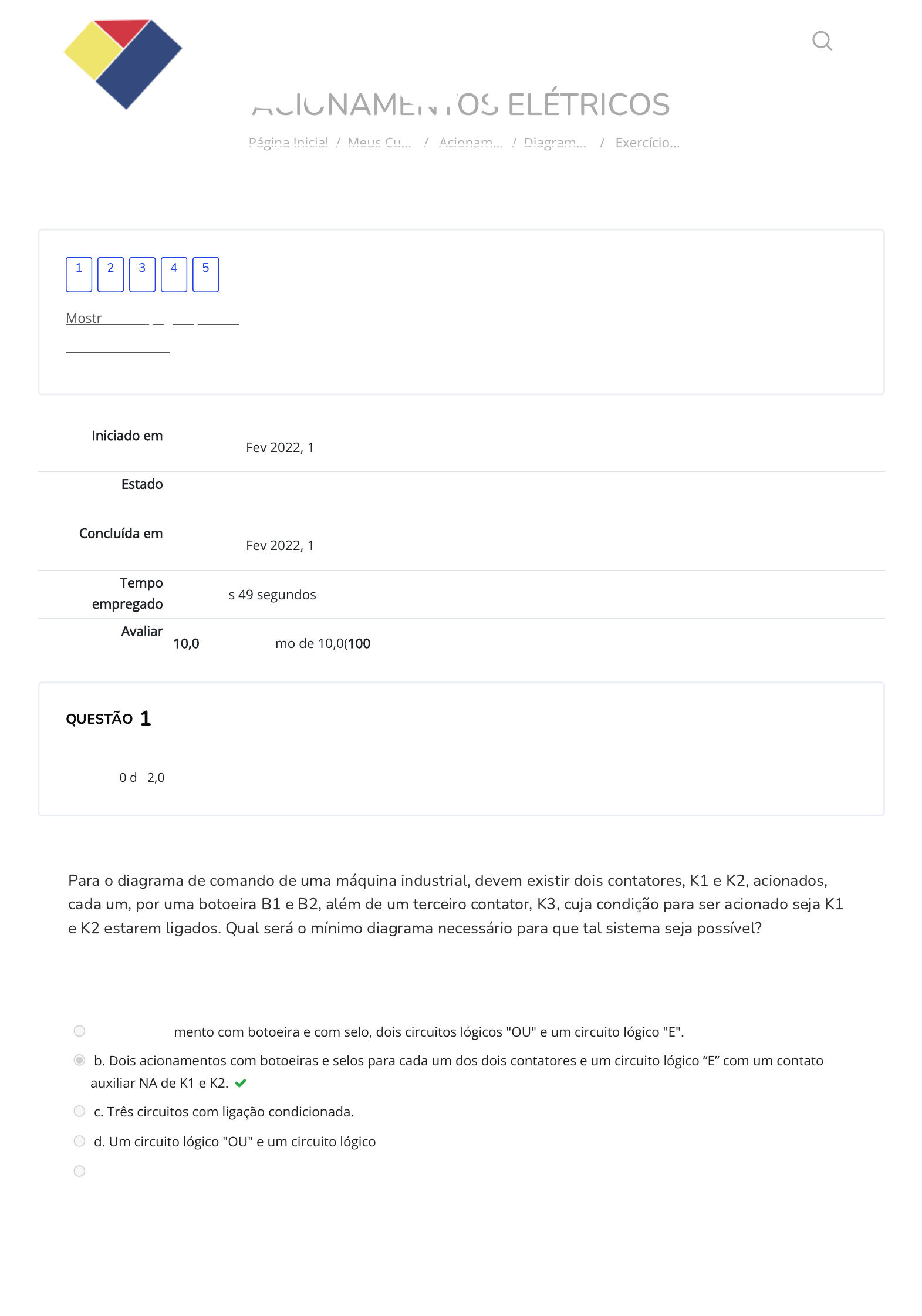 01/01/2023 12:01 Exercício de Fixação - Diagramas de comando: Revisão da tentativa https://cpetead.com.br/mod/quiz/review.php?attempt=1953860&cmid=52400 1/6 ACIONAMENTOS ELÉTRICOS Página Inicial / Meus Cu… / Acionam… / Diagram… / Exercício… Iniciado em domingo, 6 Fev 2022, 14:09 Estado Finalizada Concluída em domingo, 6 Fev 2022, 14:19 Tempo empregado 9 minutos 49 segundos Avaliar 10,0 de um máximo de 10,0(100%) QUESTÃO Correto Atingiu 2,0 de 2,0 Mostrar uma página por vez Terminar revisão 1 2 3 4 5 1 Para o diagrama de comando de uma máquina industrial, devem existir dois contatores, K1 e K2, acionados, cada um, por uma botoeira B1 e B2, além de um terceiro contator, K3, cuja condição para ser acionado seja K1 e K2 estarem ligados. Qual será o mínimo diagrama necessário para que tal sistema seja possível? Escolha uma opção: a. Um acionamento com botoeira e com selo, dois circuitos lógicos "OU" e um circuito lógico "E". b. Dois acionamentos com botoeiras e selos para cada um dos dois contatores e um circuito lógico “E” com um contato auxiliar NA de K1 e K2. c. Três circuitos com ligação condicionada. d. Um circuito lógico "OU" e um circuito lógico "E". e. Circuito intertravamento entre os três contatores. Sua resposta está correta. A resposta correta é: Dois acionamentos com botoeiras e selos para cada um dos dois contatores e um circuito lógico “E” com um contato auxiliar NA de K1 e K2. https://cpetead.com.br/ https://cpetead.com.br/course/view.php?id=2092 https://cpetead.com.br/mod/quiz/view.php?id=52400 https://cpetead.com.br/mod/quiz/review.php?attempt=1953860&cmid=52400&showall=0 https://cpetead.com.br/mod/quiz/view.php?id=52400 https://cpetead.com.br/ 01/01/2023 12:01 Exercício de Fixação - Diagramas de comando: Revisão da tentativa https://cpetead.com.br/mod/quiz/review.php?attempt=1953860&cmid=52400 2/6 QUESTÃO Correto Atingiu 2,0 de 2,0 2 Na planta de uma indústria, existe a necessidade de se criar uma esteira que funcione para frente e para trás. Qual das alternativas a seguir indica uma estratégia para evitar o curto-circuito na rede em uma partida que atenda a função dessa esteira? Escolha uma opção: a. Colocar proteção térmica. b. Intertravamento entre os contatores. c. Realizar selo nas botoeiras de comando. d. Fazer um circuito lógico "E" com as duas botoeiras de comando. e. Ligações condicionadas. Sua resposta está correta. A resposta correta é: Intertravamento entre os contatores. 01/01/2023 12:01 Exercício de Fixação - Diagramas de comando: Revisão da tentativa https://cpetead.com.br/mod/quiz/review.php?attempt=1953860&cmid=52400 3/6 QUESTÃO Correto Atingiu 2,0 de 2,0 3 As lógicas de comando podem ser criadas para diferentes propósitos. Muitas vezes, são realizadas estratégias de acordo com a necessidade de operação. Dessa forma, foi realizado o diagrama apresentado na �gura a seguir para que satisfaça uma função básica. Qual é essa função? Escolha uma opção: a. Partida estrela-triângulo. http://lrq.sagah.com.br/uasdinamicas/uploads/layouts/497153989_15707372965d5f8fa9e55bf1872e62c4af1765382f07d6c370.jpg 01/01/2023 12:01 Exercício de Fixação - Diagramas de comando: Revisão da tentativa https://cpetead.com.br/mod/quiz/review.php?attempt=1953860&cmid=52400 4/6 b. Partida compensada. c. Acionamento de portão eletrônico com temporizador. d. Partida direta com retorno de partida. e. Pisca-pisca. Sua resposta está correta. A resposta correta é: Pisca-pisca. 01/01/2023 12:01 Exercício de Fixação - Diagramas de comando: Revisão da tentativa https://cpetead.com.br/mod/quiz/review.php?attempt=1953860&cmid=52400 5/6 QUESTÃO Correto Atingiu 2,0 de 2,0 4 Os diagramas de comando comumente utilizados para demonstrar lógicas de contatores apresentam, muitas vezes, estratégias especí�cas para cada máquina. Dessa forma, interprete o comportamento do diagrama de comando da �gura e responda o que aconteceria se fosse retirado o selo de K1: Escolha uma opção: http://lrq.sagah.com.br/uasdinamicas/uploads/layouts/1762424542_1570737296a8c7dec3d0c8848d47d1e885b81366efd23b8cb3.jpg 01/01/2023 12:01 Exercício de Fixação - Diagramas de comando: Revisão da tentativa https://cpetead.com.br/mod/quiz/review.php?attempt=1953860&cmid=52400 6/6 QUESTÃO Correto Atingiu 2,0 de 2,0 a. Sem o selo de K1, K2 não pode ser acionado. b. O selo de K1 não faz diferença alguma no diagrama. c. Sem o selo de K1, o diagrama inteiro não pode ser acionado. d. É preciso apertar S2 e S4 juntos para acionar K2 se não houver selo em K1. e. Sem o selo de K1, S1 perde sua função. Sua resposta está correta. A resposta correta é: É preciso apertar S2 e S4 juntos para acionar K2 se não houver selo em K1. 5 Em alguns sistemas de comando realizados para adequar máquinas à NR 12, é necessário tomar algumas precauções em relação à con�ança e à segurança do circuito. Qual das alternativas a seguir é utilizada para aumentar a con�ança em circuitos de comando? Escolha uma opção: a. Colocar um relé térmico a mais. b. Colocar botoeiras de comando em redundância. c. Liberar os botões de acionamento por meio de selos. d. Proporcionar um circuito de comando remoto para os acionamentos. e. Redundância de contatos auxiliares. Sua resposta está correta. A resposta correta é: Redundância de contatos auxiliares. ◄ Saiba + Seguir para... Conteúdo de Estudo - Chaves de partida ► Quem somos Cursos Certi�cação Unidades Contato Copyright © 2021 CPET - Centro de Pro�ssionalização e Educação Técnica https://cpetead.com.br/mod/url/view.php?id=79216&forceview=1 https://cpetead.com.br/mod/lti/view.php?id=52409&forceview=1 https://www.cpet.com.br/quem-somos-cpet-cursos-tecnicos-a-distancia-ead/ https://www.cpet.com.br/course-cat/cursos/cursos-online/ https://www.cpet.com.br/certificacao-cpet/ https://www.cpet.com.br/unidades-cpet/ https://www.cpet.com.br/contato/ https://www.facebook