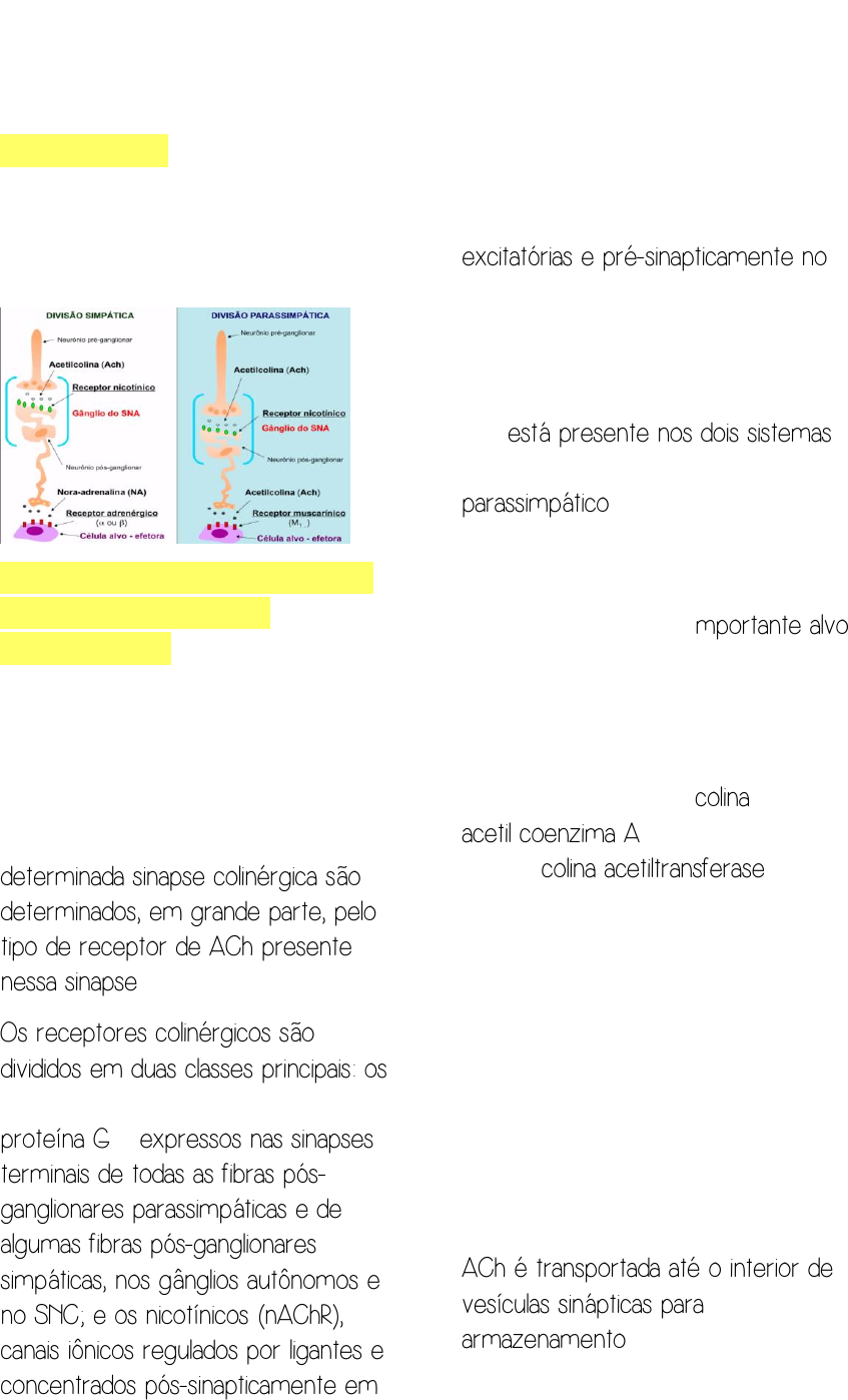 INTRODUÇÃO A farmacologia colinérgica trata das propriedades do neurotransmissor acetilcolina (ACh) BIOQUÍMICA E FISIOLOGIA DA NEUROTRANSMISSÃO COLINÉRGICA A síntese, o armazenamento e a liberação da acetilcolina obedecem a uma sequência semelhante de etapas em todos os neurônios colinérgicos. Os efeitos específicos da ACh em determinada sinapse colinérgica são determinados, em grande parte, pelo tipo de receptor de ACh presente nessa sinapse. Os receptores colinérgicos são divididos em duas classes principais: os muscarínicos (mAChR), ligados à proteína G e expressos nas sinapses terminais de todas as fibras pós- ganglionares parassimpáticas e de algumas fibras pós-ganglionares simpáticas, nos gânglios autônomos e no SNC; e os nicotínicos (nAChR), canais iônicos regulados por ligantes e concentrados pós-sinapticamente em numerosas sinapses autônomas excitatórias e pré-sinapticamente no SNC.. Por este motivo, a modulação dos receptores nicotínicos a nível ganglionar não é uma estratégia farmacológica interessante, uma vez que está presente nos dois sistemas autônomos: simpático e parassimpático A acetilcolinesterase (AChE), enzima responsável pela degradação da acetilcolina, é também importante alvo farmacológico SÍNTESE DA ACETILCOLINA A acetilcolina é sintetizada em uma única etapa a partir da colina e da acetil coenzima A (acetil-CoA) pela enzima colina acetiltransferase (ChAT). A etapa limitadora de velocidade na síntese de ACh não é mediada pela colina acetiltransferase, mas pela disponibilidade do substrato colina, que depende da captação de colina no neurônio ARMAZENAMENTO E LIBERAÇÃO DA ACETILCOLINA Uma vez sintetizada no citoplasma, a ACh é transportada até o interior de vesículas sinápticas para armazenamento. A energia necessária para esse processo é fornecida por COLINÉRGICOS E ANTI-COLINÉRGICOS uma ATPase que bombeia prótons para dentro da vesícula. O transporte de prótons para fora dela (i. e., a favor do gradiente de concentração de H+) está acoplado à captação de ACh para dentro da vesícula (i. e., contra o gradiente de concentração de ACh) por meio de um canal antiportador de ACh-H+ . Este representa um alvo para alguns fármacos anticolinérgicos, como o vesamicol, e sua inibição resulta em déficit de armazenamento e liberação subsequente de ACh A liberação de ACh na fenda sináptica ocorre por meio da fusão da vesícula sináptica com a membrana plasmática. O processo depende da despolarização da terminação axônica e da abertura dos canais de cálcio dependentes de voltagem. O aumento na concentração intracelular de Ca 2+ facilita a ligação da sinaptotagmina às proteínas do complexo SNARE, que, em seu conjunto, medeiam a fixação e a fusão da vesícula à membrana. Como resultado, o conteúdo da vesícula é liberado na forma de separados “quanta” na fenda sináptica. OBS: O compartimento de “reserva” serve para repor o compartimento de depósito, à medida que este está sendo utilizado. RECEPTORES COLINÉRGICOS Uma vez liberada na fenda sináptica, a ACh liga-se a uma de duas classes de receptores, localizados habitualmente sobre a superfície da membrana da célula pós-sináptica. Os receptores muscarínicos (mAChR) são acoplados à proteína G (GPCR) com sete domínios transmembrana, enquanto os receptores nicotínicos (mAChR) são canais iônicos regulados por ligantes RECEPTORES MUSCARÍNICOS A transmissão colinérgica muscarínica ocorre principalmente nos gânglios autônomos, em órgãos-alvo inervados pela divisão parassimpática do sistema nervoso autônomo e no SNC. Os receptores muscarínicos fazem transdução de sinais através da membrana celular e interagem com proteínas de ligação de GTP. A ativação da proteína G pela ligação de agonista aos receptores muscarínicos pode exercer vários efeitos diferentes sobre as células, entre eles inibição da adenilciclase (por meio da Gi) e estimulação da fosfolipase C (por meio da Gq), ambas mediadas por uma subunidade α da proteína G. A ativação muscarínica também influencia os canais iônicos por meio de moléculas de segundos mensageiros. Nas células, foram detectados e isolados cinco cDNA distintos para os receptores muscarínicos humanos, denominados M1-M5. Esses tipos de receptores formam dois grupos funcionalmente distintos. Os receptores M1, M3 e M5 estão acoplados a proteínas Gq, responsáveis pela estimulação da fosfolipase C. Por outro lado, os receptores M2 e M4 estão acoplados a proteínas Gi, responsáveis pela inibição da adenilciclase e pela ativação dos canais de K+. Em geral, o receptor M1 é expresso nos neurônios corticais e gânglios autônomos; os receptores M2, no músculo cardíaco, e os receptores M3, em músculo liso e tecido glandular. Como a estimulação de M1, M3 e M5 facilita a excitação da célula, enquanto a estimulação de M2 e M4 suprime a excitabilidade celular, existe uma correlação previsível entre o subtipo de receptor e o efeito da ACh sobre a célula. OBS: A participação dos receptores M4 e M5 ainda é incerta RECEPTORES NICOTÍNICOS A transmissão colinérgica nicotínica resulta da ligação da ACh ao nAChR. Esse fenômeno é conhecido como condutância direta regulada por ligante. Os canais abertos do nAChR ativado são igualmente permeáveis aos íons K+ e Na + . Entretanto, a existência de permeabilidade relativamente pequena aos íons Ca 2+ resulta em elevações significativas da [Ca 2+ ] intracelular. Por conseguinte, quando abertos, esses canais produzem uma corrente efetiva de entrada de Na + que despolariza a célula. A estimulação de múltiplos nAChR pode despolarizar a célula o suficiente para produzir potenciais de ação e abrir os canais de cálcio dependentes de voltagem. Esta última ação e a entrada direta de Ca 2+ através do poro do nAChR podem acarretar a ativação de diversas vias de sinaliza