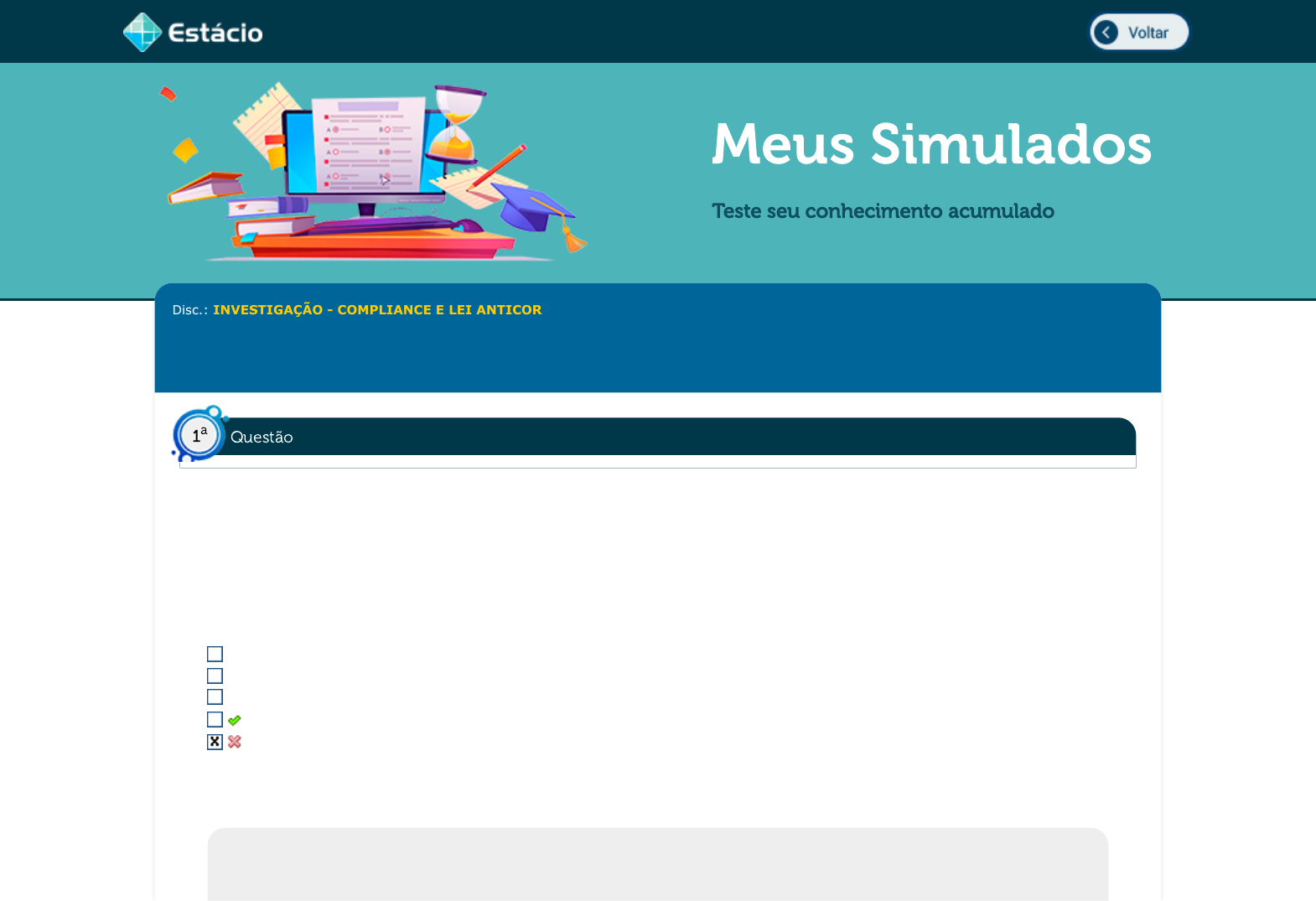 11/01/2023 12:58 Estácio: Alunos https://simulado.estacio.br/bdq_simulados_avaliacao_parcial_resultado.asp?cod_hist_prova=302019085&cod_prova=6000616292&f_cod_disc= 1/8 Meus Simulados Teste seu conhecimento acumulado Disc.: INVESTIGAÇÃO - COMPLIANCE E LEI ANTICORRUPÇÃO Aluno(a): MÁRCIO MACHADO LISBOA DE ALMEIDA 202104105223 Acertos: 9,0 de 10,0 11/01/2023 Acerto: 0,0 / 1,0 Sobre o "Compliance", fazemos as seguintes afirmações: I - Empresas com setor de Compliance tendem a contratar outras empresas que também tenham este setor; II - A Administração Pública tem exigido em licitações que as empresas candidatas tenham um setor de "Compliance" em sua estrutura; III - O "Compliance" é um instrumento que torna a empresa menos competitiva. Diante do exposto, é correto dizer que: Apenas as assertivas I e II estão erradas. Apenas as assertivas II e III estão erradas. Apenas a assertiva II está errada. Apenas a assertiva III está errada. Todas as assertivas estão erradas. Respondido em 11/01/2023 12:20:13 Explicação: Como visto na aula 1, empresas com setor de Compliance, por exemplo, tendem a contratar outras empresas que também tenham este setor. Ou seja, isso é um instrumento que torna a empresa mais competitiva. Por último, a Administração Pública tem exigido em Questão1 a https://simulado.estacio.br/alunos/inicio.asp javascript:voltar(); 11/01/2023 12:58 Estácio: Alunos https://simulado.estacio.br/bdq_simulados_avaliacao_parcial_resultado.asp?cod_hist_prova=302019085&cod_prova=6000616292&f_cod_disc= 2/8 licitações que as empresas candidatas tenham tal setor em sua estrutura. Considerando que algumas empresas têm os órgãos públicos como principal cliente, há uma forte expectativa de crescimento deste setor. Acerto: 1,0 / 1,0 Por que estudar a Lei Anticorrupção? Selecione [Verdadeiro] ou [FALSO] para as assertivas abaixo: A - A Lei Anticorrupção é o diploma legal no qual o Compliance está explicitamente colocado e é nele também que os benefícios legais são elencados B - Compliance é desenhado exclusivamente para prevenir crimes dentro de uma empresa C - Trata-se de um importante instrumento para o gerenciamento de riscos, vazamento de informações estratégicas,implementação de valores éticos etc D - Compliance é aplicado às situações da Lei Anticorrupção E - A Lei Anticorrupção menciona a palavra corrupção em seu texto Estão corretas apenas as assertivas A , C Estão corretas apenas as assertivas A, C, D Estão corretas apenas as assertivas B , C , D Estão corretas apenas as assertivas C, D , E Todas as assertivas estão corretas Respondido em 11/01/2023 12:24:59 Explicação: A - A Lei Anticorrupção é o diploma legal no qual o Compliance está explicitamente colocado e é nele também que os benefícios legais são elencados [VERDADEIRO] B - Compliance é desenhado exclusivamente para prevenir crimes dentro de uma empresa [FALSO] C - Trata-se de um importante instrumento para o gerenciamento de riscos, vazamento de informações estratégicas,implementação de valores éticos etc [VERDADEIRO] D - Compliance é aplicado às situações da Lei Anticorrupção [VERDADEIRO] E - A Lei Anticorrupção menciona a palavra corrupção em seu texto [FALSO] Acerto: 1,0 / 1,0 COMPLIANCE - Processo Administrativo de Responsabilização - PAR Sobre o PAR (Processo Administrativo de Responsabilização), selecione abaixo apenas a assertiva correta A investigação preliminar visa apenas à produção de indícios, não se formando nenhum juízo de valor sobre a autoria da infração Questão2 a Questão3 a 11/01/2023 12:58 Estácio: Alunos https://simulado.estacio.br/bdq_simulados_avaliacao_parcial_resultado.asp?cod_hist_prova=302019085&cod_prova=6000616292&f_cod_disc= 3/8 A investigação preliminar se presta à identificação de autoria da infração A investigação preliminar (PAR) se presta à produção de provas Na investigação preliminar (PAR) forma-se juízo de valor sobre a autoria da infração No PAR a defesa é realizada apenas mediante a apresentação de argumentos jurídicos Respondido em 11/01/2023 12:25:58 Explicação: Solução / Correções A investigação preliminar visa apenas à produção de indícios, não se formando nenhum juízo de valor sobre a autoria da infração A investigação preliminar se presta apenas para produzir indícios suficientesde que houve a infração e de quem supostamente a cometeu. Veja que estaetapa preliminar não visa à produção de provas Visa apenas à produção de indícios, de maneira que não se forma nenhum juízo de valor sobre a autoria da infração ou mesmo a sua existência No PAR a defesa não é feita apenas com argumentos jurídicos, mas, principalmente, com provas e elementos que possam inocentar o réu ou mesmo implicar em penas menores ...devemos entender o PAR como o momento em que a empresa pode se defender amplamente. Acerto: 1,0 / 1,0 Compliance no Sistema Americano Em linhas gerais, as US Sentencing Guidelines possuem sete elementos principais que, quando adotados, demonstram a seriedade e efetividade do programa de Compliance. Selecione a opção abaixo que relaciona corretamente quatro deste elementos principais: Monitorar os whistleblowers, Treinar os Monitores, Comprometimento Contábil-Administrativas , Ações Retro-ativas Externalidades, Segurança Ativa, Reciclagem e Comunicação , Ações Pró-ativas Comprometimento do Alto Escalão, Monitoramento, Treinamento e Comunicação, Ação Corretiva Comprometimento dos Stakeholders, Monitoramento, Treinamento e Comunicação , Ação Pró-Ativa Disciplina Contábil, Chaveamento de Informações, Criptografia Ativa , Ação pró-corretiva Respondido em 11/01/2023 12:26:26 Explicação: Comprometimento do Alto Escalão, Monitoramento, Treinamento e Comunicação , Ação Corretiva Questão4 a 11/01/2023 12:58 Estácio: Alunos https://simulado.estacio.br/bdq_simulados_avaliacao_parcial_resultado.asp?cod_his