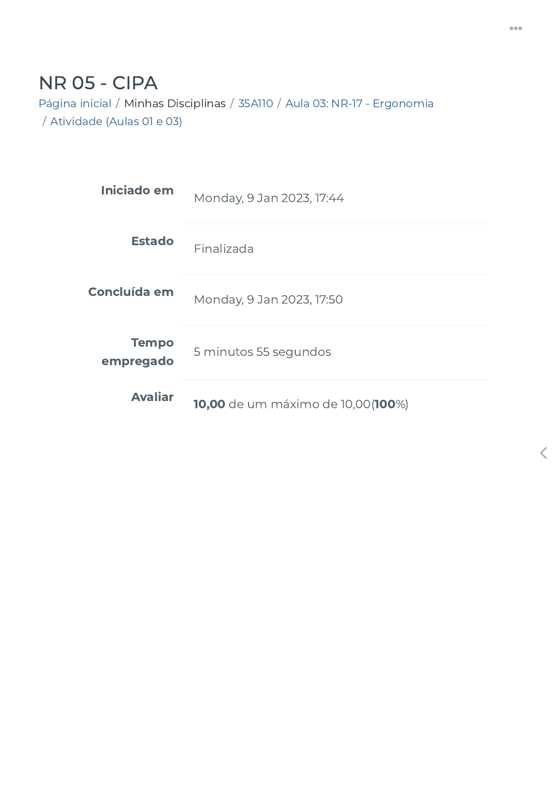 09/01/2023 17:50 Atividade (Aulas 01 e 03) https://ava.politecnicabr.com.br/mod/quiz/review.php?attempt=4168177 1/7 Página inicial / Minhas Disciplinas / 35A110 / Aula 03: NR-17 - Ergonomia / Atividade (Aulas 01 e 03) NR 05 - CIPA Iniciado em Monday, 9 Jan 2023, 17:44 Estado Finalizada Concluída em Monday, 9 Jan 2023, 17:50 Tempo empregado 5 minutos 55 segundos Avaliar 10,00 de um máximo de 10,00(100%) https://ava.politecnicabr.com.br/ https://ava.politecnicabr.com.br/course/view.php?id=1032 https://ava.politecnicabr.com.br/course/view.php?id=1032#section-4 https://ava.politecnicabr.com.br/mod/quiz/view.php?id=25894 https://ava.politecnicabr.com.br/ 09/01/2023 17:50 Atividade (Aulas 01 e 03) https://ava.politecnicabr.com.br/mod/quiz/review.php?attempt=4168177 2/7 Questão 1 Correto Atingiu 2,00 de 2,00 A NR 17 visa estabelecer as diretrizes e os requisitos que permitam a adaptação das condições de trabalho às características psico�siológicas dos trabalhadores, de modo a proporcionar: Marque V para verdadeiro e F para falso. ( ) Conforto ( ) Segurança e Saúde. ( )Desempenho e�ciente no trabalho. Escolha uma opção: a. F, F, V. b. V, V, V. c. V, F, F. d. V, F, V. e. F, F, F. https://ava.politecnicabr.com.br/ 09/01/2023 17:50 Atividade (Aulas 01 e 03) https://ava.politecnicabr.com.br/mod/quiz/review.php?attempt=4168177 3/7 Questão 2 Correto Atingiu 2,00 de 2,00 Acerca das funções do Cipeiro, assinale (V) Verdadeiro e (F) Falso. ( ) Também é responsabilidade do cipeiro colaborar com a empresa na conscientização e �scalização dos funcionários no tocante ao uso de equipamentos e procedimentos de segurança. ( ) A função do cipeiro é defender os interesses dos trabalhadores, indicar propostas de melhorias de segurança e cobrar das em- presas prazos para solução de irregularidades. ( ) deve conhecer profundamente suas atividades, as normas de segurança, a localização dos equipamentos, os tipos de EPI que devem ser utilizados pelos emprega- dos e o mapa de risco de acidentes. Escolha uma opção: a. V, V, F. b. F, F, V. c. F, F, F. d. V, V, V. e. F, V, F. https://ava.politecnicabr.com.br/ 09/01/2023 17:50 Atividade (Aulas 01 e 03) https://ava.politecnicabr.com.br/mod/quiz/review.php?attempt=4168177 4/7 Questão 3 Correto Atingiu 2,00 de 2,00 Julgue os itens a seguir de acordo com o disposto na aula referente à Ergonomia, marque (V) Verdadeiro ou (F) Falso. ( ) Não carregue, em nenhuma hipótese, peso na cabeça. Essa prática é extremamente prejudicial, pois pressiona os discos da coluna cervical, levando-os à degeneração. ( ) Para avaliar a adaptação das condições de trabalho às características psico�siológicas dos trabalhadores, cabe ao empregador realizar a análise ergonômica do trabalho, devendo a mesma abordar, no mínimo, as condições de trabalho, conforme estabelecido nesta Norma Regulamentadora. Escolha uma opção: a. F, F. b. F, V. c. V, V. d. V, F. https://ava.politecnicabr.com.br/ 09/01/2023 17:50 Atividade (Aulas 01 e 03) https://ava.politecnicabr.com.br/mod/quiz/review.php?attempt=4168177 5/7 Questão 4 Correto Atingiu 2,00 de 2,00 Com base na NR 17, a organização deve realizar Análise Ergonômica do Trabalho - AET da situação de trabalho quando: Marque a alternativa correta. Escolha uma opção: a. Observada a necessidade de uma avaliação mais aprofundada da situação; b. Identi�cadas inadequações ou insu�ciência das ações adotadas; c. Sugerida pelo acompanhamento de saúde dos trabalhadores, nos termos do Programa de Controle Médico de Saúde Ocupacional - PCMSO e da alínea “c” do subitem 1.5.5.1.1 da NR 01; ou d. Indicada causa relacionada às condições de trabalho na análise de acidentes e doenças relacionadas ao trabalho, nos termos do Programa de Gerenciamento de Riscos – PGR. e. Todas as alternativas estão corretas. https://ava.politecnicabr.com.br/ 09/01/2023 17:50 Atividade (Aulas 01 e 03) https://ava.politecnicabr.com.br/mod/quiz/review.php?attempt=4168177 6/7 Questão 5 Correto Atingiu 2,00 de 2,00 A obrigação legal de instalação da CIPA nas empresas passou a integrar com a Consolidação das Leis do Trabalho (CLT), por força de qual instrumento legal? Escolha uma opção: a. Decreto-Lei 229, de 26 de fevereiro de 1967, modi�cando profunda- mente o texto do capítulo V, Título II, da CLT. b. Lei 6.514, de 22 de dezembro de 1977 - altera o Capítulo V do Título II da Consolidação das Leis do Trabalho, relativo à Segurança e Medicina do Trabalho. c. Decreto 7.036 de 10 de novembro de 1944 e, passando o�cialmente a ser obrigatória, nas empresas regidas pela Consolidação das Leis do Trabalho (CLT). d. A Portaria 3.214, de 8 de junho de 1978. Entre em Contato https://www.politecnicabr.com.br 0800 084 2627 Links Úteis Dicas da nossa Diretora Acadêmica Planner de Estudos https://www.politecnicabr.com.br/ https://soundcloud.com/user-501638417/sets/escola-politecnica-brasileira https://storage.googleapis.com/sirius-pubstore/semestre_plannerdeestudo%20poli.pdf https://ava.politecnicabr.com.br/ 09/01/2023 17:50 Atividade (Aulas 01 e 03) https://ava.politecnicabr.com.br/mod/quiz/review.php?attempt=4168177 7/7 © 2022 - Escola Politécnica Brasileira 0800 084 2627 Declaração de Matrícula Orientações do AVA Abertura de Ticket Fale com o Tutor Cronograma de Estudos Manual de Estágio Manual de Competência Siga-nos nas redes sociais https://ava.politecnicabr.com.br/mod/quiz/0 https://storage.googleapis.com/sirius-pubstore/declaracao_matricula.pdf https://storage.googleapis.com/sirius-pubstore/orientacoes_ava.pdf https://storage.googleapis.com/sirius-pubstore/abertura_ticket.pdf https://storage.googleapis.com/sirius-pubstore/fale_com_tutor.pdf https://storage.googleapis.com/sirius-pubstore/cronograma_estudos.pdf https://storage.googleapis.com/sirius-pubstore/manual_estagio.pdf https://storage.googleapis.com/sirius-pubstore/manual_competencia.pdf https://www.facebook.com/politec