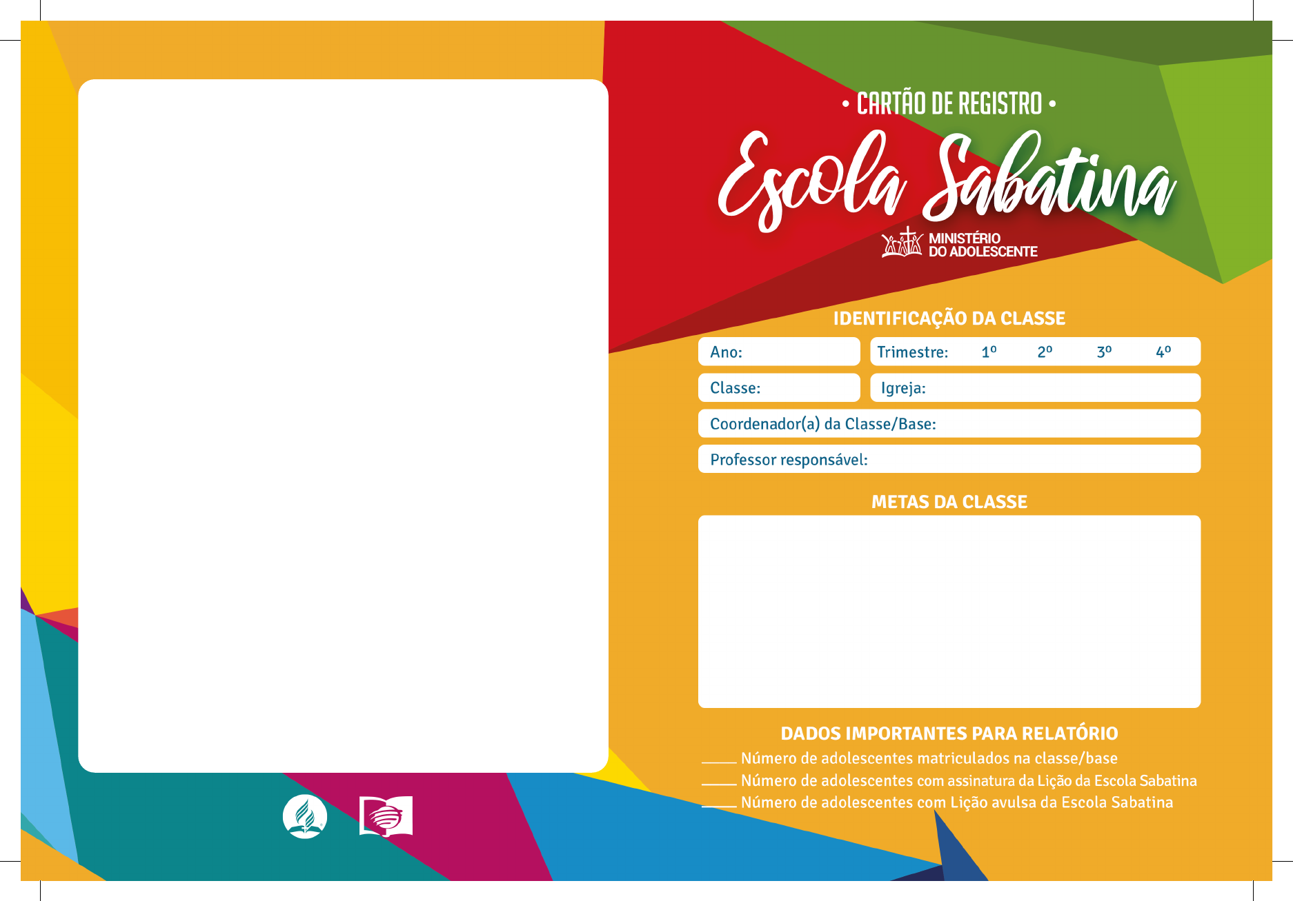 Comunhão ___% de alunos estudando diariamente a Bíblia por meio da lição da Escola Sabatina. Relacionamento ___% de alunos presentes nas classes de Escola Sabatina. ___% de alunos participando de um Pequeno Grupo. Missão ___% de adolescentes pessoalmente envolvidos na salvação de alguém. Autoavaliação do professor (a) • Tenho minha comunhão pessoal com Deus a cada dia? • Comprometo-me e crio estratégias para que meus alunos adquiram a Lição da Escola Sabatina? • Uso algum método criativo para incentivar meus adolescentes a estuda rem a Bíblia e a Lição? • Interesso-me, oro e mantenho contato com minha equipe e adolescentes? • Tenho um grupo de apoio aos pais, via WhatsApp ou outro meio? • Visito os adolescentes da classe e faço atividades extraclasse com esse grupo? • Desafio os pais a assumirem seu papel de fazer de seus filhos discípulos de Jesus? • Tenho vivido e promovido a missão entre os adolescentes? • Tenho realizado e incentivado atividades comunitárias com meus alunos e suas famílias? • Como professor (a), organizo classe de estudo bíblico e Pequenos Grupos para adolescentes? • Tenho participado de encontros de capacitação para professores, trimestrais e outros. Participo e incentivo minha classe nas celebrações e projetos da igreja tais quais: *Dez Dias de Oração/Jornada Espiritual *Semana Santa *Impacto Esperança * Semana da Esperança (Batismo da Primavera) Relatório Integrado - registrar no relatório do Ministério da Criança. O coordenador(a) da Escola Sabatina dos adolescentes deve preencher no final de cada trimestre e informar à Secretaria da igreja. Leia e responda, na perspectiva do(a) professor(a) de sua igreja: • ___Número de programas e projetos como Impacto Esperança, Ação Comunitá- ria, Dez Dias de Oração, Jorna da Espiritual entre outros, com a participação dos adolescentes. . • ___Número de capacitações realizadas para líderes e professores. • Possui um projeto de discipulado em funcionamento? *Pegadas *Conectados *Outros • Possui um(a) coordenador(a) do Ministério do Adolescente? *Sim *Não • ___Número de adolescentes envolvidos na Escola Cristã de Férias (total). • ___Número de adolescentes adventistas envolvidos na Escola Cristã de Férias. • ___Número de Pequenos Grupos. Adolescente/Professor 1o 3o 5o 7o 9o 11o 13o2o 4o 6o 8o 10o 12o 14oAniversário Amigo de oração 1o Oferta Missionária Alvo de cada sábado: _____ 1°___ 2°___ 3°___ 4°___ 5°___ 6°___ 7°___ 8°___ 9°___ 10°___ 11°___ 12°___ 13°___ 14°___ Registros da Classe Comunhão – Quantos estudaram a lição diariamente? Comunhão – Quantos estudaram a Bíblia diariamente? Relacionamento – Quantos participaram do Pequeno Grupo? Missão – Quantos se envolveram em projetos de missão? Missão – Quantos deram ou acompanharam o amigo em estudos bíblicos? 3o 5o 7o 9o 11o 13o2o 4o 6o 8o 10o 12o 14o Média Missão envolve ações individuais e coletivas que apresentem a Jesus, como: o desenvolvimento de amizades intencionais, convite aos amigos não adventistas para irem à igreja, estudo bíblico com outros, distribuição de livros e folhetos missionários, divulgação de imagens cristocêntricas nas redes sociais, ajuda aos necessitados, etc.