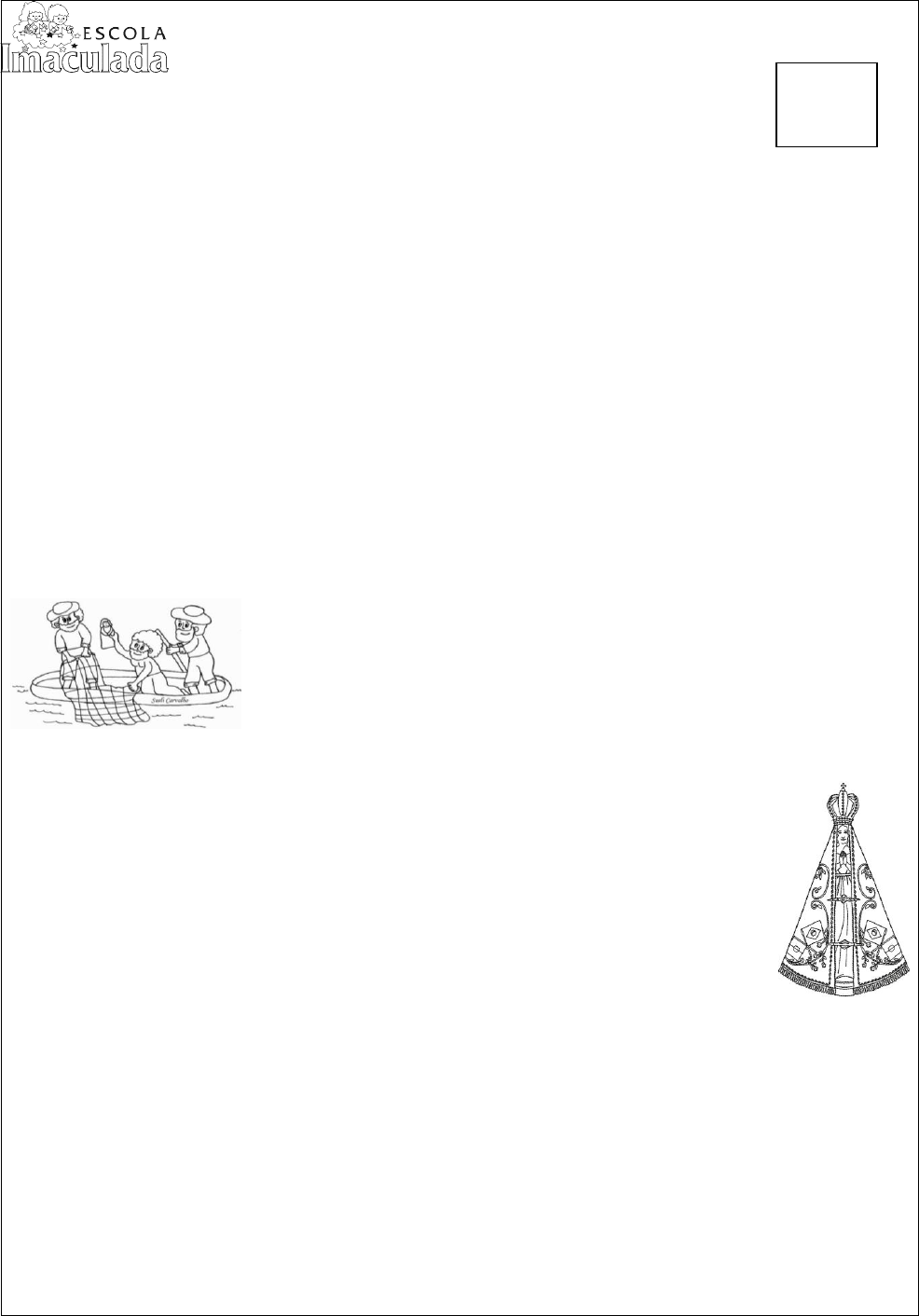 Fraternidade e vida: dom e compromisso Goiânia, _______ de ____________________________________de 2020. Nome: ______________________________________________________ Ano: 1º Turno: _____________________ Valor: 10,0 _____________________________________________________________________ ATIVIDADE AVALIATIVA DE ENSINO RELIGIOSO Leia com muita atenção. Esta é a história de Nossa Senhora Aparecida. Domingos, Felipe e João eram pescadores e moravam às margens do Rio Paraíba, em Guaratinguetá. Um dia, saíram para pescar, mas não conseguiam pegar nenhum peixe. Depois de longas horas de espera e várias tentativas, lançaram a rede mais uma vez e, quando a retiraram da água, viram o corpo de uma imagem. Navegaram mais um pouco e lançaram a rede novamente. Tiveram uma surpresa! Pegaram uma cabeça que se encaixou perfeitamente no corpo da imagem. Embrulharam as duas partes em um pano e guardaram, com muito cuidado, no fundo da canoa. Desde aquele momento, foi tão grande a pescaria que, em pouco tempo, encheram a canoa e tiveram que suspender a pesca para não afundarem. Foi assim que a imagem de Nossa Senhora da Conceição foi encontrada, nas águas do Rio Paraíba, e passou a ser chamada Nossa Senhora da Conceição de Aparecida. 1 – Responda às questões sobre o texto: a) Quais os nomes dos três pescadores? (0,5) ___________________________________________________________ b) Escreva o nome do rio onde eles pescavam. (0,5) ___________________________________________________________ c) Cite o que os pescadores encontraram. (0,5) ____________________________________________________________ Nota ______________________________________________________________ d) Marque a alternativa correta. Qual era essa imagem? (0.5) ( ) Nossa Senhora de Fátima ( ) Nossa Senhora da Conceição e) Ela passou a ser chamada: (0,5) ___________________________________________________________ 2 – Escreva o nome da maior festa do cristianismo. (1,0) ___________________________________________________________ 3 – Que comemoramos nessa festa? (1,0) ___________________________________________________________ 4 – Complete as frases com as palavras do quadro: (2,1) Jesus bebê Maria animais estrela jumentinho José __________ e __________ saíram de Nazaré e foram a Belém para o recenseamento. Maria estava grávida, nos dias de ganhar o bebê. Foram de _____________________. O Natal é a maior festa do cristianismo. É nessa data que comemoramos o nascimento de Jesus. É o tempo propício para reflexões, no qual o amor de Deus fica acima de todos os sentimentos, fazendo com que a esperança renasça no coração dos homens. As hospedarias estavam lotadas. Encontraram um lugar onde os __________________ dormiam. Entraram e José fez uma caminha para o _____________. ____________ nasceu! Os anjos desceram para louvá-lo. Uma ________________ no céu guiou os Reis Magos até onde Jesus estava. 5 - Faça a correspondência numérica dos símbolos do Natal com o seu significado. (2,5) 1 – velas de Natal 2 – presépio 3 – sinos 4 – árvore de Natal 5 – bolas coloridas Simbolizam a presença de Cristo como luz do mundo. Elas representam a nossa fé em Jesus. Enfeitam o pinheirinho, significam os frutos daquela árvore viva que é Jesus. Elas deixam a árvore mais bonita e alegre. Símbolo da vida, por isso nós a enfeitamos para receber a verdadeira vida: Jesus. Lança mensagens no ar. O nascimento de Jesus é a grande mensagem que precisa ser anunciada e comunicada a todos. São Francisco de Assis foi o primeiro a montá-lo. Simboliza o momento e o ambiente em que Jesus Cristo nasceu. 6 – Encontre, no diagrama abaixo, as palavras em destaque. (0,9) Feliz Natal! N U A L I M E N T O A P S A F G J K H O A M O R A M O R O U P A S R L O Ú I Q D H C A S A O Q T D G D B J Q R Y M Z M E E O S F A M Í L I A A Ç X S B V R U P Q Ç A T Ã B R I N Q U E D O S X O Obrigado (a), Senhor, pelo alimento, pela saúde, pela casa, pela família, por meus brinquedos, por meus amigos, por minhas roupas, por tudo que criou. Obrigado (a) por seu imenso amor e proteção.
