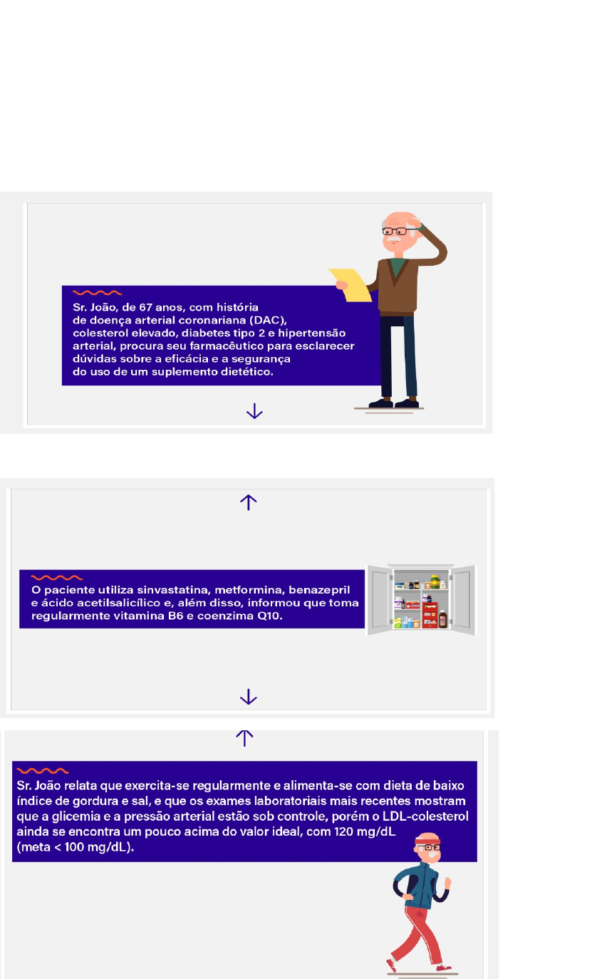 Um fator de risco importante no uso de fitoterápicos, plantas medicinais e suplementos alimentares é a ausência de testes adequados sobre a avaliação de possíveis interações com medicamentos. Porém, o uso de suplementos alimentares, fitoterápicos e plantas medicinais concomitante à terapia medicamentosas pode apresentar riscos significativos para os pacientes. Portanto, é extremamente importante que o farmacêutico, no ato da dispensação dos medicamentos, tenha informações não somente dos medicamentos que o paciente está utilizando, mas também se ele faz uso de fitoterápicos, plantas medicinais ou suplementos alimentares. Preocupado com os níveis de colesterol e possíveis efeitos colaterais ou interações medicamentosas, o paciente pergunta: A. O uso de suplemento de alho ajudaria a reduzir o LDL-colesterol para um valor abaixo de 100 mg/dL? É seguro o uso do suplemento de alho junto com os medicamentos que ele faz uso contínuo? B. O uso da coenzima Q10 e vitamina B6 é eficaz no tratamento da doença arterial coronariana? C. É verdade que alguns suplementos podem aumentar o risco de sangramento quando tomados junto com ácido acetilsalicílico? Você, farmacêutico, como responderá ao Sr. João? Padrão de resposta esperado A.Não há comprovação de que o alho seja capaz de reduzir de forma significativa o LDL-colesterol. Demonstrou-se que ele produz um pequeno, mas significativo, efeito redutor do colesterol total, mas apenas quando não há controle dietético estabelecido. Há poucas evidências de que o alho reduz a carga de placas ateromatosas em pacientes com doença arterial coronariana (DAC). No entanto, aconselha-se o monitoramento da pressão arterial durante duas semanas depois de se iniciar a suplementação com alho, visto que o paciente está em uso de medicamentos para hipertensão, pois o alho possui efeitos diuréticos. Também há estudos que relatam que o alho tem efeito antiagregante plaquetário, o que pode causar risco de sangramento uma vez que o paciente faz uso contínuo de ácido acetilsalicílico. B. Estudos têm demonstrado que baixos níveis séricos de coenzima Q10 e vitamina B6 predispõem o paciente ao risco de doença arterial coronariana e, portanto, a suplementação poderia ser benéfica ao paciente. No entanto, os dados corroborando benefícios do uso de coenzima Q10 em pacientes com doença arterial coronariana são preliminares e limitados a estudos em indivíduos com infarto prévio do miocárdio. Por outro lado, existem evidências de que as estatinas podem reduzir os níveis de coenzima Q10 e, portanto, justifica-se o uso no paciente que está fazendo o uso de sinvastatina. C. Diversos suplementos nutricionais (alho, ginkgo e ginseng) têm efeito antiagregante plaquetário que pode ser aditivo ao do ácido acetilsalicílico. Se esse paciente também estiver sendo tratado com varfarina, é possível que ocorram interações adicionais com coenzima Q10 (estrutura semelhante à da vitamina K), erva-de-são-joão (indutor do citocromo P450) e melatonina (redução in vitro do tempo de protrombina), ocasionando redução do efeito da varfarina.