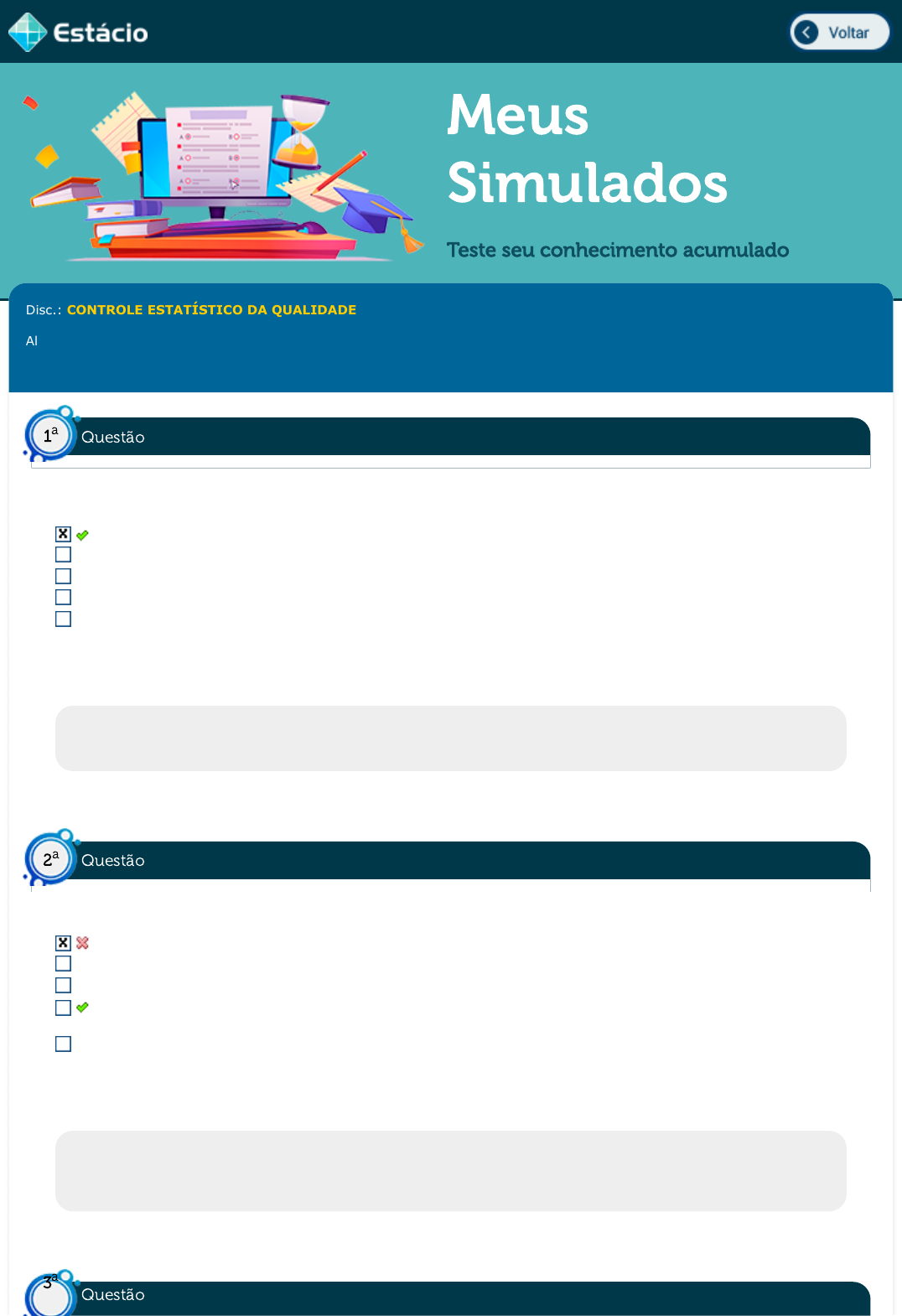Meus Simulados Teste seu conhecimento acumulado Disc.: CONTROLE ESTATÍSTICO DA QUALIDADE Aluno(a): ELITON PEREIRA DA SILVA 202103100996 Acertos: 6,0 de 10,0 12/01/2023 Acerto: 1,0 / 1,0 Desempenho, características do produto ou serviço, confiabilidade, utilidade, durabilidade, aparência e atendimento ao cliente são: Dimensões da qualidade. Dimensões da produção. Dimensões organizacionais. Dimensões do marketing. Dimensões da gestão. Respondido em 12/01/2023 11:12:38 Explicação: A resposta certa é: Dimensões da qualidade. Acerto: 0,0 / 1,0 Qual o conceito de Sistema de Gestão? Conjunto de responsabilidades, autoridades e relações. Conjunto de elementos/órgãos inter-relacionados. Pessoas ou grupo de pessoas que dirige uma organização. Conjunto de elementos inter-relacionados, definidos pela alta administração, para dirigir e controlar uma organização. Grupo de instalações e pessoas com um conjunto de responsabilidades, autoridades e relações. Respondido em 12/01/2023 11:15:39 Explicação: A resposta certa é: Conjunto de elementos inter-relacionados, definidos pela alta administração, para dirigir e controlar uma organização. Acerto: 1,0 / 1,0 Questão1 a Questão2 a Questão 3 a https://simulado.estacio.br/alunos/inicio.asp javascript:voltar(); TSE 2012. Para n = 250 e q = 1,5%, sendo q a probabilidade de sucesso, a média da distribuição de Poisson (µ) é 6,25 5,25. 4,85. 3,75. 1,50. Respondido em 12/01/2023 11:15:16 Explicação: A resposta certa é: 3,75. Acerto: 1,0 / 1,0 (FCC 2014.) De acordo com a norma sobre os planos de amostragem e procedimentos na inspeção por atributos, o plano que determina o número de unidades de produto de cada lote a ser inspecionado (tamanho da amostra ou série de tamanhos de amostra) e o critério para a aceitação do lote (números de aceitação e de rejeição) recebe o nome de: Planejamento de Produção Seriada. Plano de Amostragem. Plano de Produto. Programa de Qualidade. Plano Operacional. Respondido em 12/01/2023 11:17:44 Explicação: A resposta certa é: Plano de Amostragem. Acerto: 0,0 / 1,0 Na indústria de copiadoras, uma medida da aceitabilidade de uma cópia é a quantidade de partículas de toner de fundo que aderem à parte da cópia que se destina a ser branca. Minimizar o toner residual em áreas brancas é um objetivo de "menos é o melhor". Foi determinado que aproximadamente metade dos clientes não tolerará um nível de fundo além de 1,2 unidades de fundo. Além disso, uma chamada de serviço é feita em um custo de $ 200 mais o custo do tempo de inatividade da copiadora: $ 150 por hora. Se o tempo médio de inatividade da copiadora é de 2,5 horas, qual é a função de perda associada? 380,57 399,30 420,58 410,50 350,00 Respondido em 12/01/2023 11:19:19 Explicação: A resposta correta é: 399,30 Questão4 a Questão5 a Acerto: 1,0 / 1,0 (FCC, 2010) Com relação à qualidade e à produtividade nas organizações, considere as afirmativas abaixo. I. A produtividade só é obtida se os processos tiverem qualidade em seus insumos e operações, pois de nada adianta qualidade sem produtividade. II. A Qualidade Total é muito abrangente e se dedica a estudar a satisfação dos clientes externos e dos clientes internos. III. A produtividade não deve ser entendida somente como razão entre resultados e recursos, mas sim de uma forma mais ampla, levando em conta todas as variáveis existentes nos processos, focando nas necessidades de todas as partes interessadas no negócio e buscando melhorias e resultados relevantes para todos. IV. No início da era industrial, a preocupação dos gestores estava voltada para os volumes de produção. Com o aumento da competitividade surgiu a medição da produtividade, que até a Segunda Guerra Mundial era entendida como razão entre o volume produzido e o tempo gasto para esta produção. V. Uma das formas mais abrangentes de se definir produtividade, atualmente, é como sendo razão entre a saída, ou o resultado final, de um processo e a entrada, que representa os recursos necessários à obtenção da saída. Está correto o que se afirma em: II, III, IV, apenas. III, IV e V, apenas. I, II e III, apenas. I, II, III e IV, apenas. I, II, III, IV e V. Respondido em 12/01/2023 11:20:40 Explicação: A resposta correta é: I, II, III, IV e V. Acerto: 0,0 / 1,0 A curva OC possui as propriedades a seguir. I. A curva OC de um plano de amostragem de aceitação mostra a capacidade do plano para distinguir entre lotes bons e ruins. II. A curva OC com tamanho de amostra fixa é mais íngreme. Isso significa que o plano tem maior poder de discriminação. III. A curva OC para um tamanho de amostra variável é mais íngreme. Isso significa que o plano com uma aceitação de números menores tem mais poder de discriminação. IV. As curvas OC com tamanhos de amostra fixos fornecem à qualidade constante proteção, enquanto as curvas OC com tamanhos de amostra relativos fornecem diferentes proteções de qualidade. Está(ão) INCORRETA(S) as afirmativas: II e III IV somente I e II III e IV I e IV Respondido em 12/01/2023 11:23:28 Explicação: Questão6 a Questão7 a A resposta certa é: II e III Acerto: 1,0 / 1,0 Uma gráfica imprime 750 folhas de sulfite por hora e para monitoramento do processo são examinadas três páginas a cada hora. Esse processo tem em média produzido quatro não conformidades a cada página impressa. Qual a probabilidade de encontramos durante o processo de impressão menos de quatro não conformidades? 15% 12% 0,23% 23% 0,15% Respondido em 12/01/2023 11:23:26 Explicação: A resposta certa é: 0,23% Acerto: 1,0 / 1,0 A seguir temos uma amostra de 24 dados referentes a concentração (gr/l) de um determinado produto. Sobre este processo é correto o que se afirma em: O processo apresenta 4 causas especiais. O processo não apresenta causas especiais. O processo apresenta 1 causa especial. O processo apresenta 8 causas especiais. O pro