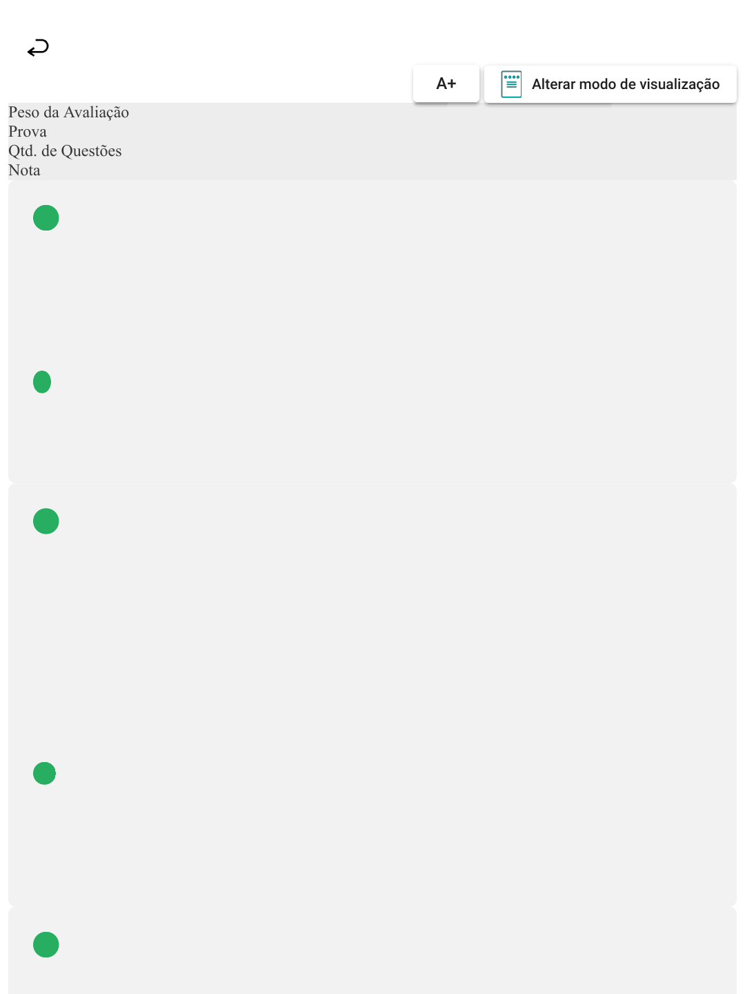 Prova Impressa GABARITO | Avaliação da Disciplina (Cod.:644861) Peso da Avaliação 10,00 Prova 59794491 Qtd. de Questões 20 Nota 10,00 Existem alguns instrumentos de avaliação do desenvolvimento motor. Assinale a alternativa que relacione três deles. A Escala de Glasgow, BPM de Vitor da Fonseca, e a Escala Motora Infantil de Alberta (AIMS). B Escala de Glasgow, SF – 36 e BPM de Vitor da Fonseca. C Teste de Triagem do Desenvolvimento Denver II, BPM de Vitor da Fonseca, e a Escala Motora Infantil de Alberta (AIMS). D Teste de Triagem do Desenvolvimento Denver II, BPM de Vitor da Fonseca e a Escala de Glasgow. A Matriz SWOT é utilizada pelas organizações a fim de potencializar suas forças, eliminar as fraquezas, reduzir as ameaças e aproveitar as oportunidades. Sobre os itens que compõe a Matriz SWOT, analise as sentenças abaixo: I – As FORÇAS são as características da organização que a fortalecem, são vantagens competitivas. II – As FRAQUEZAS são os aspectos externos que representam riscos à organização. III – As OPORTUNIDADES são aspectos externos positivos que promovem melhorias na organização. IV – As AMEAÇAS são as fragilidades da organização, suas desvantagens. Sobre as sentenças acima, assinale a alternativa correta: A As sentenças II e IV estão corretas. B As sentenças I e III estão corretas. C As sentenças I, II e IV estão corretas. D As sentenças I, II e III estão corretas. VOLTAR A+ Alterar modo de visualização 1 2 3 Avaliação da Disciplina https://ava2.uniasselvi.com.br/subject/grades-and-tests/answer-book/e... 1 of 8 12/01/2023 18:18 Nós humanos processamos mentalmente de forma que diferentes estruturas cerebrais trabalham em conjunto. A atividade mental surge da cooperação de unidades funcionais. Um grande pesquisador as dividiu em três unidades funcionais. Este pesquisador chama-se: Assinale a alternativa correta: A Luria. B Wallon. C Vigotsky. D Piaget. A somatognosia trata da percepção que temos do nosso próprio corpo. É fundamental principalmente para o processo de aprendizagem da escrita. Sobre a somatognosia, analise as afirmações a seguir: I. É o mesmo que noção corporal.II. Pode ser cinestésica e de autoimagem. III. Não depende dos fusos musculares. Assinale a alternativa correta: A Apenas as afirmações II e III estão corretas. B Apenas a afirmação I é correta. C Apenas a afirmação IIII é correta. D Apenas as afirmações I e II estão corretas. 4 Avaliação da Disciplina https://ava2.uniasselvi.com.br/subject/grades-and-tests/answer-book/e... 2 of 8 12/01/2023 18:18 O SNC é o responsável por conseguirmos nos integrar com o meio que nos cerca. Isso ocorre por intermédio das nossas sensações, movimentos, pensamentos etc. Associe as principais funções desse sistema. I. Sensorial.II. Motora.III. Homeostase. ( ) Nossos músculos dependem de seu controle para contrair ou relaxar, mesmo inconscientemente. ( ) Promove a estabilidade interna do organismo. ( ) Controla todas as sensações, desde as mais simples, até as especiais. Assinale a alternativa que apresenta a sequência correta: A II – I - III. B II – III - I. C III – II - I. D I – II - III. Sabe-se da necessidade de uma base neuroanatômica para psicomotricidade, bem como da importância de entendermos o SN participante. Assim sendo, é correto afirmar que: A As divisões do SNC se definem apenas na 42º semana de vida intrauterina do feto. B O SN só é funcional após os três anos de idade. C O SN advém de um folheto embrionário denominado ectoderma, proveniente da placa neural. D O SN central está relacionado ao esqueleto apendicular; nervos e gânglios e o SN periférico está contido no canal vertebral e crânio. Conforme vamos nos desenvolvendo primeiramente apresentamos nossos telerreceptores e depois nossos proprioceptores. Há uma progressão gradual do nosso controle motriz. A aprendizagem dos nossos movimentos ocorre por uma hierarquização de padrões motores. Assinale a alternativa que apresenta as fases do desenvolvimento motor de forma cronológica. A Movimentos genéricos - movimento reflexo - movimentos especializados. B Movimento reflexo - movimentos especializados - movimentos genéricos. C Movimento reflexo - movimentos genéricos - movimentos especializados. D Movimentos especializados - movimentos genéricos - movimento reflexo. 5 6 7 Avaliação da Disciplina https://ava2.uniasselvi.com.br/subject/grades-and-tests/answer-book/e... 3 of 8 12/01/2023 18:18 A capacidade muscular de, em repouso, poder se contrair, estabilizar e promover movimentação corporal é chamada de Tônus muscular. Sobre o tônus, analise as sentenças que seguem, classificando-as como verdadeiras (V) ou falsas (F): ( ) Promove a capacidade da criança em passar das posições de sentar para engatinhar e futuramente para a posição bípede. ( ) Não é importante para o desenvolvimento motor e psicológico da criança. ( ) É um dos elementos da motricidade humana, importantes para o desenvolvimento neuropsicomotor humano. Assinale a alternativa que apresenta a sequência correta: A V – F – V. B V – F – F. C F – F – V. D F – V – V. Em nosso cérebro encontramos locais e estruturas específicas que participam de diversas funções. Tais estruturas se comprometidas podem alterar tanto nosso cognitivo, como o emocional e o motor. Temos uma região cerebral que tem a função de retransmissão de impulsos nervosos para o córtex cerebral. Relaciona-se com alterações emocionais decorridas não só da própria atividade, mas também de conexões com outras estruturas do sistema límbico. De qual região estamos falando? A Giro do cíngulo. B Medula. C Tálamo. D Cerebelo. Quando a criança organiza seu sentir quanto a ela em relação com o meio que a cerca; já se conscientiza de seu esquema corporal, podemos afirmar que se trata do... Assinale a alternativa que completa corretamente a frase: A Elemento da motr