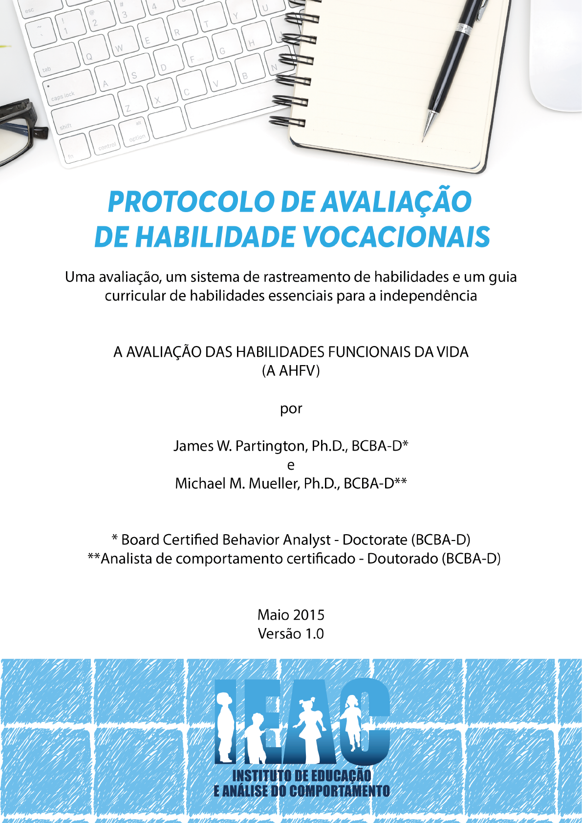 A Avaliação das Habilidades Funcionais para a Vida Protocolo de avaliação de competências profissionais Uma avaliação, sistema de rastreamento de habilidades e guia curricular para habilidades essenciais para a independência. James W. Partington, Ph. D., BCBA –D Michael M. Mueller, Ph. D., BCBA-D Aprendiz Data de Nascimento Data da Avaliação Idade Assistente Índice 1.Aviso sobre a segurança do aluno e do cuidador................................04 2. Visão Geral da AHFV...........................................................................05 3. Visão Geral do Módulo de Habilidades Profissionais.........................07 4. Considerações especiais de pontuação.................................................10 5. Os Repertórios de Habilidades Vocacionais........................................11 6. Procura de Emprego...............................................................................11 7. Entrevista................................................................................................11 8. Habilidades básicas................................................................................12 9. Relações com colegas de trabalho..........................................................12 10. Segurança no local de trabalho.............................................................12 11. Competências de atividade para Conserto..........................................13 12. Cautela e limpeza..................................................................................13 13. Lavanderia............................................................................................13 14. Varejo.......................................................................................................14 15. Apoio.......................................................................................................14 16. Habilidades de escritório.....................................................................14 17. Habilidades informáticas....................................................................15 18. Habilidades com Restaurante..............................................................15 19. Cozinha de Restaurante.......................................................................15 20. Armazém..................................................................................................15 21Ferramentas...........................................................................................16 22. Comércio e Construção.......................................................................16 23. Jardinagem...........................................................................................16 24. Notas de Avaliação.............................................................................17 25. Procura de Emprego.............................................................................18 26. Entrevista.............................................................................................25 27. Habilidades básicas..............................................................................32 28. Relações com colegas de trabalho......................................................43 29. Segurança no local de trabalho........................................................47 30. Habilidades de Conserto...................................................................56 31. Cautela e limpeza..................................................................................58 32. Lavanderia............................................................................................68 33. Varejo.......................................................................................................71 34. Apoio Pessoal......................................................................................76 35. Habilidades de escritório...................................................................78 36. Habilidades de Computador.............................................................85 37. Habilidades com Restaurante...........................................................92 38. Cozinha de Restaurante....................................................................98 39. Armazém..................................................................................................103 40.Ferramentas.......................................................................................106 41. Comércio e Construção.....................................................................112 42. Jardinagem.........................................................................................119 LEIA ESTE AVISO POR FAVOR É muito importante que o usuário deste protocolo de avaliação leia o Guia do AHFV antes das tentativas de avaliar ou ensinar qualquer uma das habilidades lis- tadas neste protocolo. Todos enfrentam alguns riscos inerentes ao realizar a maio- ria das atividades diárias. Entramos em contato com situações que requerem julga- mento rápido, “lendo” em poucos segundos as fontes de informação disponíveis ao tomar decisões em situações complexas e pesando riscos a fim de evitar o perigo. Desde o momento em que acordamos pela manhã até o momento em que vamos para a cama à noite, o risco e o perigo constantes estão presentes, mas são evitados para a maioria de nós por nossa experiência, treinamento e habilidades cognitivas. Indivíduos com autismo e atrasos no desenvolvimento enfrentam maiores riscos de lesões porque podem não estar cientes, não entender ou não manter a aten- ção focada em situações potencialmente perigosas ou ao realizar certas atividades. Como tal, os cuidadores devem sempre ser responsáveis por garantir a segurança de indivíduos com atrasos no desenvolvimento. Algumas das atividades que estão incluídas nos protocolos de avaliação podem não ser seguras para avaliar direta- mente alguns indivíduos. Além disso, as tentativas de avaliar o