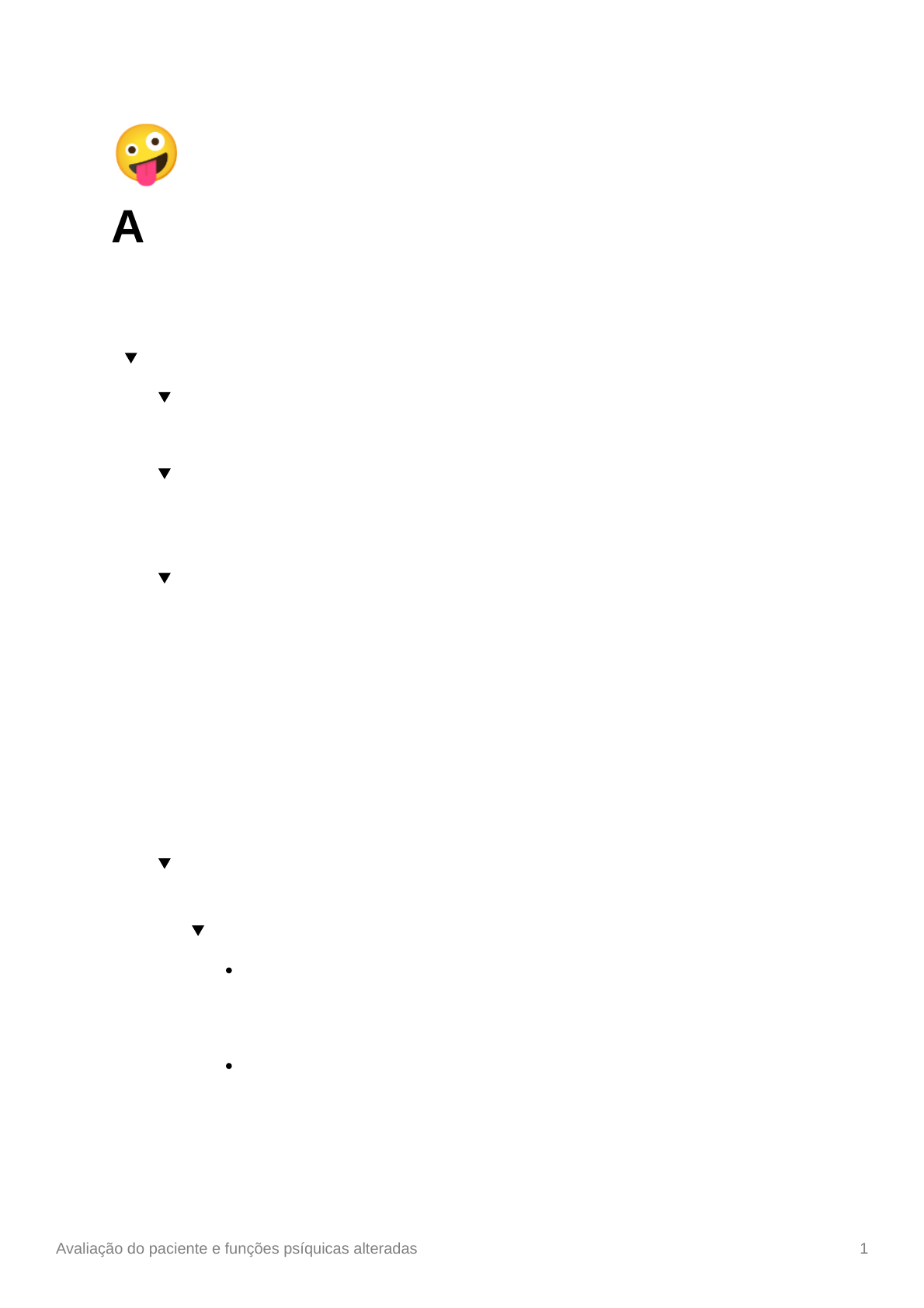Avaliação do paciente e funções psíquicas alteradas 1 🤪 Avaliação do paciente e funções psíquicas alteradas Avaliação psicopatológica Qual o principal instrumento de conhecimento da psicopatologia A entrevista e uma observação cuidadosa do paciente O que a entrevista possibilita ao psicólogo Informações para o diagnóstico clínico, para o conhecimento da dinâmica afetiva do paciente, para o planejamento terapêutico Quais os dois principais aspectos da avaliação que a entrevista psicopatológica permite 1. Anamnese: Histórico dos sinais e dos sintomas que o paciente apresenta ao longo de sua vida, seus antecedentes pessoais e familiares, assim como de sua família e meio social 2. O exame psíquico, também chamado exame do estado mental atual. (Avaliar: cognição, regulação emocional ou comportamento, refletindo disfunção nos processos psicológicos, biológicos ou de desenvolvimento subjacentes ao funcionamento mental.) Quais os aspectos considerados mais relevantes sobre a técnica de entrevista em psicopatologia Avaliação física: O exame físico não possui muita diferença entre os indivíduos que contem transtornos e os que não tem, entretanto é importante levar em consideração que: Pacientes com transtornos psiquiátricos apresentam morbidade (conjunto de causas capazes de produzir uma doença) física mais frequente que a população geral, motivo que reforça a necessidade de avaliação somática (anamnese e exame físico cuidadoso) Avaliação do paciente e funções psíquicas alteradas 2 Os distúrbios e doenças físicas são “subdiagnosticos”, não reconhecidos e tratados nos pacientes ditos psiquiátricos Avaliação neurológica Depende de da anamnese e de exame neurológico objetivo, permitindo uma identificação topográfica de alguma lesão ou disfunção no sistema nervoso central e ou periférico Baseia-se no exame neurológico, onde ocorre a busca de sinais neurológicos de patologias, pesquisando as alterações sensitivas (tato, dolorosa, vibratória, térmica, etc.) Psicodiagnóstico Testes de personalidade e os rastreamentos (screening) Exames complementares Exames laboratoriais, neurofisiológicos e de neuroimagem, de sangue e biópsias Entrevista com o paciente Quais os atributos fundamentais para realizar entrevistas Técnica e a habilidade A habilidade é em parte aprendida e em outra intuitiva Como se revela a habilidade do entrevistador Pelas perguntas que formula, por aquelas que evita formular e pela decisão de quando e como falar ou apenas calar. Quais as atitudes que o profissional deve evitar Posturas rígidas e estereotipadas Atitude excessivamente neutra ou fria Reações exageradamente emotivas ou artificialmente calorosas Julgamento ou comentários valorativos Procedimento nas primeiras entrevistas Os primeiros três minutos da entrevista são extremamente significativos, sendo muitas vezes úteis tanto para a identificação do perfil dominante de Avaliação do paciente e funções psíquicas alteradas 3 sintomas do paciente como para a formulação da hipótese diagnóstica final. Após a fase de exposição livre, ele fará as perguntas que faltam para completar e esclarecer os pontos importantes da história e da anamnese de modo geral. Aspecto global do paciente A aparência do paciente, suas vestes, seu olhar, sua postura; revela muito de seu estado mental interior e é recurso fundamental para o diagnóstico. Transferência e contratransferência A transferência ocorre em todo o processo terapêutico A transferência compreende atitudes e sentimentos cuja origem são basicamente inconscientes para o paciente. Inclui tanto sentimentos positivos (como confiança, amor e carinho) quanto negativos (como raiva, hostilidade, inveja, etc.). ex de transf: ódio // contratransf: acolhimento, amor é possível que o profissional faça a contratrans. daqueles conteúdos que não resolveu consigo As funções psíquicas elementares e suas alterações São: consciência, atenção, sensopercepção, orientação, memória, inteligência, afetividade, pensamento, conduta e linguagem→ são constructos aproximativos da psicologia e da psicopatologia que permitem um melhor entendimento Não existem funções psíquicas isoladas e alterações psicopatológicas compartimentalizadas desta ou daquela função. É sempre a pessoa na sua totalidade que adoece. As funções perturbadas fazem pressentir transtornos subjacentes, ligados à personalidade inteira, atingida na sua estrutura e em seu modo de existir. Em que encontro a psicopatologia é fundamentada Avaliação do paciente e funções psíquicas alteradas 4 fundamentada em determinado encontro de, pelo menos, dois seres humanos. O que conta não são os sinais e os sintomas, mas, sobretudo, o fundo mental e inter-humano do qual eles procedem e no qual se realizam, e que, afinal, determinam a sua significação, o seu sentido. Qual a psicopatologia que Minkowski critica As funções perturbadas fazem pressentir transtornos subjacentes, ligados à personalidade inteira, atingida na sua estrutura e em seu modo de existir. A psicopatologia geral dos manuais que Minkowski (1966) critica seria apenas a descrição mecânica e irrefletida dos sintomas, um exercício classificatório vazio, sem indicar o essencial, ou seja, a significação dos fenômenos A partir do que a psicopatologia se desenvolve Psicopatologia centrada na pessoa humana: Parte de determinadas síndromes (psicopatologia sindrômica) Psicopatologia sintomática: Semiologia psiquiátrica rudimentar. Qual a relação dialética da psicopatologia uma relação dialética fundamental entre o conhecimento do elementar e o do global, da inserção de estruturas básicas em estruturas totalizantes que redimensionam constantemente o sentido de tais estruturas básicas. Eugen Bleuler Em um ato psíquico, apenas pode ocorrer uma separação teórica, não uma separação real, entre as distintas qualid