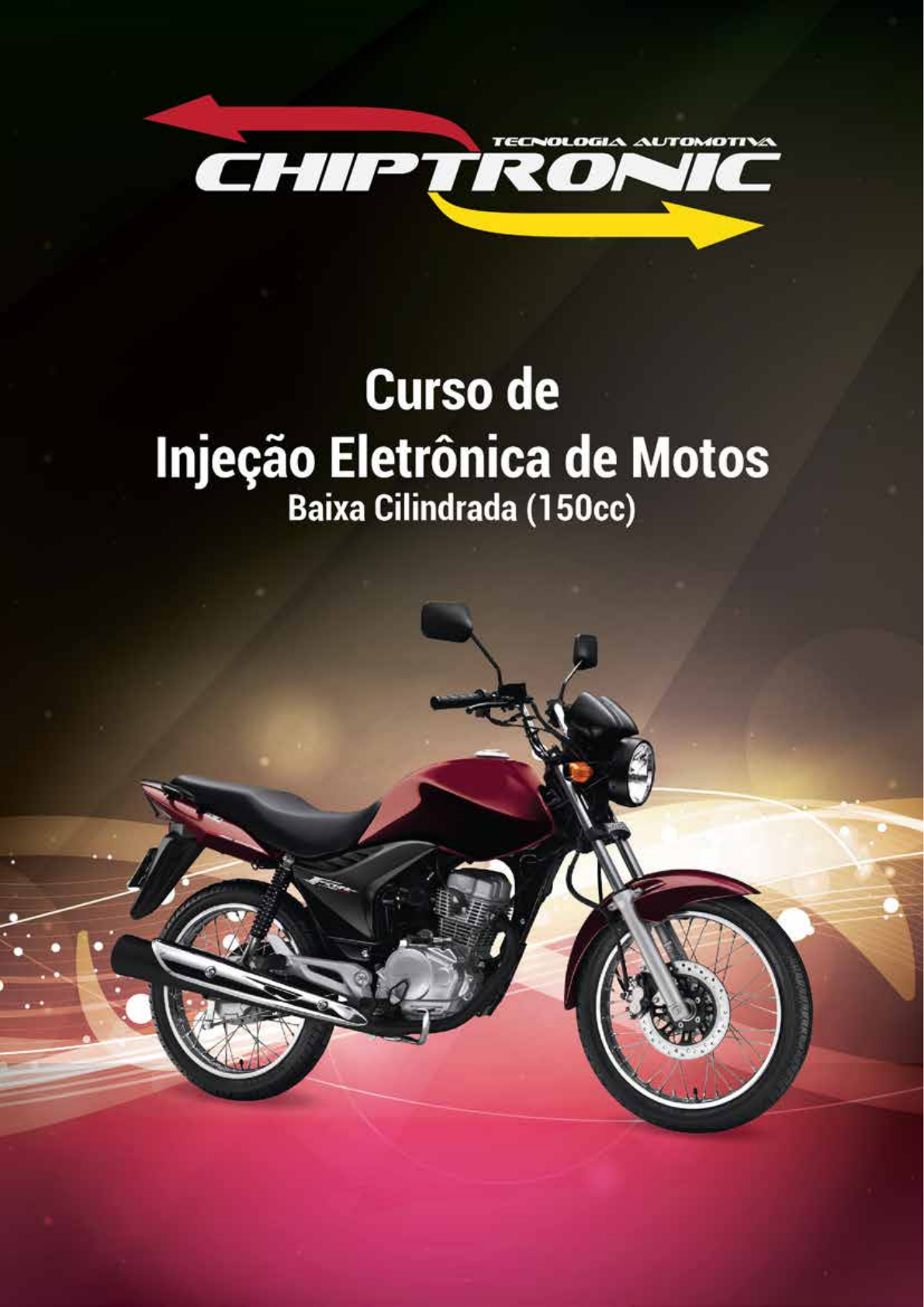 ________________________________________________________________________________ WWW.CHIPTRONIC.COM.BR injeção eletrônica para Motos - Módulo 1 2 Injeção eletrônica em motocicletas Índice: 1- Introdução .................................................................... 3 2- Conceitos básicos da eletricidade ...................................... 3 3- Grandezas elétricas ........................................................ 3 4- Fórmulas para relação de grandezas elétricas (Lei de Ohm). .. 4 5- Utilizando o multímetro ................................................... 5 6- Utilizando o osciloscópio ................................................... 6 7- Siglas: Linha +15, +30 e +50 .......................................... 6 8- Módulo de Controle do motor (ECM) .................................. 7 9- Módulo de amplitude do TI (Tempo de Injeção) .................. 8 10- Sensores e atuadores (Funções) ..................................... 9 11- Sensores: 11.1- Sensor de temperatura do motor (EOT) ................... 9 11.2- Sensor de rotação (CKP) ...................................... 10 11.3- Sensor de oxigênio (O2 – Sonda lambda) ............... 10 11.4- Sensor MAP (Hibrido) .......................................... 11 11.5- Sensor IAT de temperatura do ar (Hibrido) ............. 12 11.6- SensorTPS do Corpo de Borboleta (Hibrido) ............ 12 11.7- Sensor de inclinação do chassi .............................. 15 12- Atuadores: 12.1- Válvula corretora de marcha lenta (IACV) ............... 16 12.2- Eletro-injetor ..................................................... 17 12.3- Bomba de combustível ......................................... 18 12.4- Bobina de ignição ............................................... 19 13- Componentes do sistema injetado e suas localizações ....... 20 14- Sistema de desaceleração-Cut-off .................................. 21 15- Aterramento do chassi ................................................. 21 16- Códigos de defeitos ..................................................... 21 17- Seqüências de inspeção e Tabela Geral de testes...............22 18- Diagrama elétrico. ........................................................ 23 ................................... MOTODIAG.................................... ________________________________________________________________________________ WWW.CHIPTRONIC.COM.BR injeção eletrônica para Motos - Módulo 1 3 1 - Introdução. Com a chegada do sistema de injeção eletrônica no mercado de motocicletas Brasileiro, para muitos mecânicos trouxe preocupações e para outros a esperança de ter um serviço mais valorizado. Para que isto aconteça o mecânico tem que estar apto, investindo em cursos e equipamentos, pois a era de vendas de motos carburadas está definitivamente chegando ao fim pelo fato de ter entrado em vigor a nova lei PROMOT 3 (Programa de Controle da Poluição do Ar por Motociclos e Veículos Similares) que visa diminuir o índice de emissão de gases poluentes, hoje a necessidade de diminuir a poluição, tornou-se prioridade nos meios de transportes com motores movidos por combustão. 2 - Conceitos básicos da eletricidade. Eletricidade é um fenômeno físico originado por cargas elétricas estáticas ou em movimento (dinâmica). Esta interação ocorre através de: Átomos: Todas as substâncias sejam elas sólidas ou liquidas são formadas de pequenas partículas chamadas átomos. Elétron: O elétron é uma partícula sub-atômica de carga negativa e é responsável pela criação de campos magnéticos e elétricos. Próton: O próton é uma partícula sub-atômica de carga positiva e também é responsável pela criação de campos magnéticos e elétricos. 3 - Grandezas elétricas. Tensão: é a pressão elétrica causada pelo excesso e falta de elétron, por sua vez da origem corrente elétrica. Corrente elétrica: é o movimento ordenado de elétrons livres em condutor devidamente alimentado. Resistência: é a dificuldade que certos materiais oferecem a passagem da corrente elétrica. Potência: é a força posta em serviço a partir da circulação da corrente em um determinado componente elétrico ou eletrônico. Ex: a lâmpada (exerce força luminosa quando alimentada). Grandeza Símbolo Unidade Tensão U ou V Volt (V) Corrente I Ampère (A) Resistência R Ohm (Ω) Potência P Watt (W) ________________________________________________________________________________ WWW.CHIPTRONIC.COM.BR injeção eletrônica para Motos - Módulo 1 4 4 – Fórmulas para relação de grandezas elétricas (Lei de Ohm). Aproveitando parte do estudo da lei de ohm (descoberta pelo alemão George Simon Ohm), utilizaremos fórmulas que relacionam valores de grandezas para cálculo de corrente consumida da bateria por lâmpadas e atuadores no sistema elétrico da motocicleta. Os triângulos abaixo servirão como base de relação de valores práticos. Ex: Voltagem, resistência e potência. U ou V=Tensão I=Corrente R=Resistência P=Potência Ilustração: Sistema hidráulico X Circuito elétrico ________________________________________________________________________________ WWW.CHIPTRONIC.COM.BR injeção eletrônica para Motos - Módulo 1 5 5 - Utilizando o multímetro. Funções mais utilizadas: DCV: Utilizada para medição de tensão continua. ACV: Utilizada para medição de tensão alternada. Resistência: Valores em ohms, Kilo ohms e Mega ohms. Ampères: Utilizada para medição de correntes elétricas. Continuidade: Utilizada para checagens de fios rompidos. ________________________________________________________________________________ WWW.CHIPTRONIC.COM.BR injeção eletrônica para Motos - Módulo 1 6 6 - Utilizando o osciloscópio. 1. Entrada do carregador. 2. Porta serial. 3. Porta USB. 4. Luz do display (on/off). 5. Botão de Liga/desliga o aparelho. 6. Botão de medidas em Ampére (Multimetro). 7. Botão de medidas em Volts (Multimet