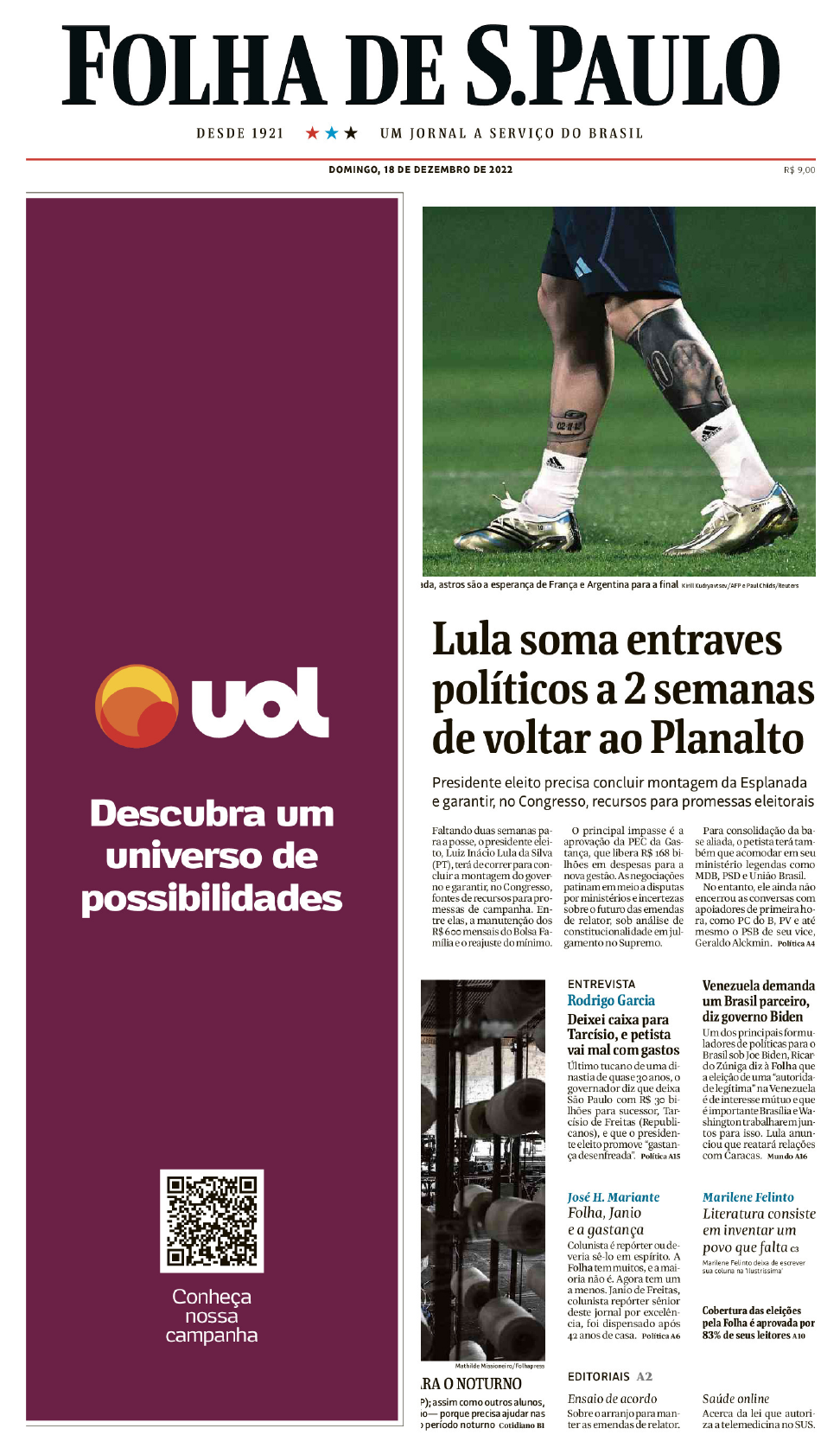 Domingo, 18 DE DEzEmbro DE 2022 D E S D E 1 9 2 1 UM J O R NA L A S E RV I Ç O D O B R A S I L ANO 102 ┆ Nº 34.227 R$ 9,00 ISSN 1414-5723 9 771414 572018 34227 copa 2022 Ensaio de acordo Saúde online Sobreoarranjoparaman- terasemendasderelator. Acerca da lei que autori- zaa telemedicinanoSUS. editoriais A2 Lula soma entraves políticos a 2 semanas de voltar aoPlanalto Presidente eleito precisa concluirmontagemda Esplanada e garantir, no Congresso, recursos para promessas eleitorais Faltandoduas semanaspa- raaposse,opresidenteelei- to, Luiz Inácio Lula da Silva (PT),terádecorrerparacon- cluir amontagemdogover- noegarantir,noCongresso, fontesderecursosparapro- messas de campanha. En- tre elas, a manutenção dos R$600mensaisdoBolsaFa- míliaeoreajustedomínimo. O principal impasse é a aprovação da PEC da Gas- tança. As negociações pa- tinam em meio a disputas porministérios—serão 37, disseontemofuturominis- troRuiCosta (CasaCivil)— eincertezassobreasemen- dasderelator,sobanálisede constitucionalidadeemjul- gamentono Supremo. Para consolidação da ba- sealiada,opetistaterátam- bémque acomodar emseu ministério legendas como MDB, PSDeUniãoBrasil. Noentanto, eleaindanão encerrouas conversas com apoiadoresdeprimeiraho- ra, como PC do B, PV e até mesmo o PSB de seu vice, GeraldoAlckmin. PolíticaA4 Rodrigo Garcia entrevista Deixei caixa para Tarcísio, e petista vai mal com gastos Últimotucanodeumadi- nastiadequase30anos,o governadordizquedeixa São Paulo com R$ 30 bi- lhões para sucessor, Tar- císio de Freitas (Republi- canos), e que o presiden- teeleitopromove“gastan- çadesenfreada”. PolíticaA15 Croácia (3º) e Marrocos (4º) vão a novo patamar P. 4 Colunistas da Folha elegema seleção do torneio P. 6 Cobertura das eleições pela Folha é aprovada por 83% de seus leitores A10 GustavoPontes, 17, trabalhaemtecelagememMiraestrela (sP); assimcomooutrosalunos, elenão frequentaoensino integraldesuacidade—aúnicaopção—porqueprecisaajudarnas contas de casa e, por isso, viajamais de40 kmpara estudar no período noturno Cotidiano B1 ensino integral empurraalunos paraonoturno Mathilde Missioneiro/Folhapress A. Schwartsman Canto deHaddad até agora não seduziu ninguém Nãoésurpresaqueomer- cado não se encante com aspromessasdofuturomi- nistro.Nãobastaproferir “novo arcabouço fiscal” três vezes a cada discur- so.Atos,nãopalavras,tra- rãocontroledogasto, au- sênciaatéagora. OpiniãoA3 Mbappé e companhia eMessi maradoniano duelam pelo tri EnquantoaFrançasuperadesfalquesecontacomainte- ligênciadeGriezmanneobrilhodeMbappé,aArgentina aposta no incansável De Paul e no inspiradoMessi para a final daCopa. Em jogo, o tricampeonatomundial. P. 1 Antonio Prata Festadeargentinos com ‘abuela’ na rua é das coisasque fazemavida ter graça B2 Marilene Felinto Literatura consiste em inventar um povo que falta C3 Marilene Felinto deixa de escrever sua coluna na ‘Ilustríssima’ Venezuela demanda umBrasil parceiro, diz governoBiden Umdosprincipaisformu- ladoresdepolíticasparao BrasilsobJoeBiden,Ricar- doZúnigadizàFolhaque aeleiçãodeuma“autorida- delegítima”naVenezuela édeinteressemútuoeque éimportanteBrasíliaeWa- shingtontrabalharemjun- tos para isso. Lula anun- ciou que reatará relações comCaracas. MundoA16 KylianMbappé (à esq.), 23, e LionelMessi, 35, durante treino; artilheiros da Copa com 5 gols cada, astros são a esperança de França e argentina para a final Kirill Kudryavtsev/aFP e Paul Childs/reuters dIsPuta dE 3º lugar FINal Cro x Mar 2 1 arG x Fra 12h*, Globo *Horário de Brasília José H.Mariante Folha, Janio e a gastança Colunistaérepórteroude- veria sê-lo em espírito. A Folhatemmuitos,eamai- oria não é. Agora temum amenos. JaniodeFreitas, colunista e repórter sêni- or deste jornal por exce- lência,foidispensadoapós 42anosdecasa. PolíticaA6 Escritora Nélida Piñonmorre aos 85 anos em Lisboa Autora,cujacausadamor- tenãofoi informada, foia primeira mulher a presi- dir a Academia Brasileira deLetras (ABL), em 1996. Premiada, a escritora era um dos nomes mais in- ternacionaisda literatura brasileira. Ilustrada B4 nélida Piñon em junho desteano eduardoanizelli/Folhapress Morre em SP, aos 78, o jornalista Carlos Brickmann Internadodesdeoutubro, o jornalista não resistiu a quadro infeccioso. Em 59 anos de carreira, traba- lhou na Folha por quase 30emtrêsperíodos.Foio primeirorepórteracobrir a campanha das Diretas Já pelo jornal. CotidianoB4 a eee opinião A2 Domingo, 18 DE DEzEmbro DE 2022 UM JORNAL A S ERV I ÇO DO bRAS I L a Publicado desde 1921 – Propriedade da Empresa Folha daManhã S.A. editoriais@grupofolha.com.br editoriais Ensaio de acordo Saúde online Em arranjo de última hora, vota- do numa sexta-feira (16), dia em geralvazioemBrasília,oCongres- soaprovouresoluçãoquevisadar sobrevidaaoinstitutodeemendas definidaspelo relator-geral doOr- çamento, ora sob julgamento do SupremoTribunal Federal. Taisemendascompartilhamde- feitos de outras modalidades de despesascriadasporparlamenta- res,bancadasoucomissõesdoLe- gislativo. Faltamcritérios dedefi- niçãodeprioridadesecontrolede eficiência do gasto. Nas emendas de relator, há o agravante da falta detransparênciaquantoàautoria e acompanhamentoda execução ComodisseaministraRosaWe- ber,presidentedoSupremoTribu- nal Federal, a experiênciamostra que,emvezdedaraoscongressis- tasaoportunidadedeatenderrei- vindicaçõesmais urgentes da po- pulação, emendasparlamentares vêmservindoao“proveitodeinte- ressesdecunhoprivatísticoeelei- toral,muitasvezesenvolvendoes- quemasde corrupção”. Nocasosobjuízo, trata-sedesa- berseasemendasderelatorestão previstaspelaCartade1988(literal- mente, não estão) e se atendema princípiosdetransparência,publi- cidadeeimpessoalidade.ParaRosa Weber, não. A votação do caso foi suspensanaquinta-feira(15),com placarde5a4contraasemendas. AindanãovotaramRicardoLewan- dowski eGilmarMendes. CasooSTFderrube