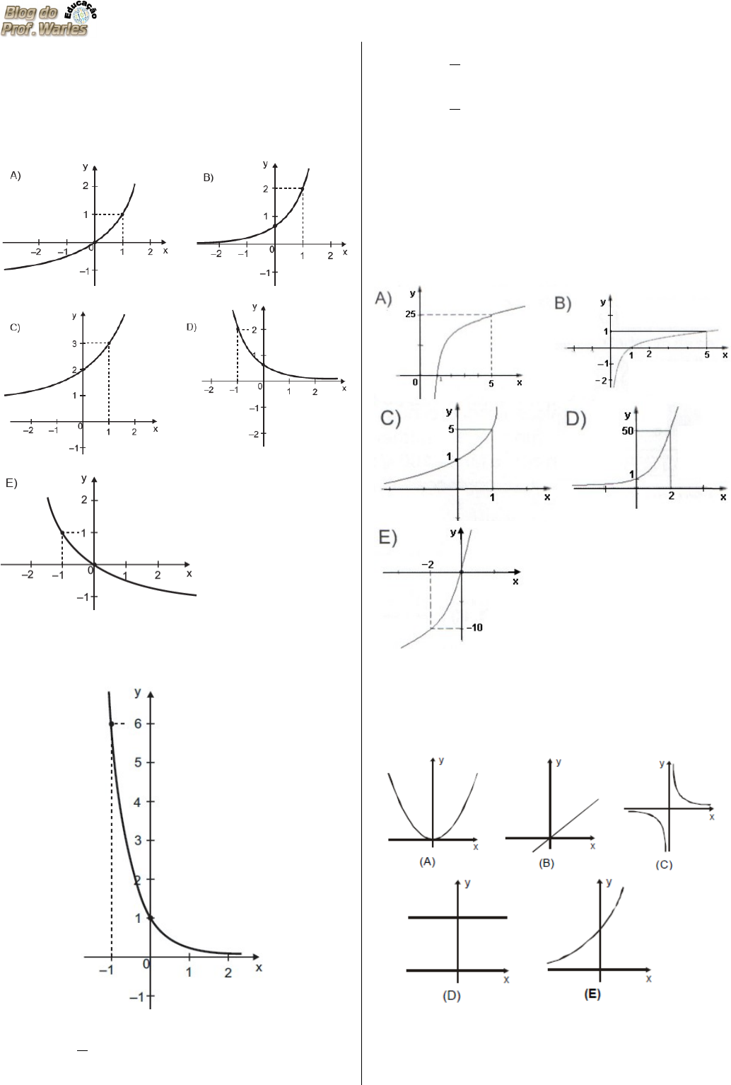 D27 – Identificar a representação algébrica e/ou gráfica de uma função exponencial. ------------------------------------------------------------------- (SEAPE). O gráfico que representa a função exponencial definida por y = 2x – 1 com , é (Resp. A) ------------------------------------------------------------------- (SEAPE). Observe abaixo o gráfico de uma função exponencial Qual é a lei de formação dessa função? A) B) C) D) E) ------------------------------------------------------------------- (SAEPE). O gráfico que pode representar a função é: Resp. C ------------------------------------------------------------------- Entre os seguintes gráficos, aquele que representa adequadamente a função é: (E) ------------------------------------------------------------------- Se a altura de planta dobra a cada mês, durante certo período de sua vida e sua altura inicial é de 1cm. A função representa esta situação, onde x é a altura da planta. O gráfico que melhor ilustra o crescimento da planta em função do tempo é: RESP. A ------------------------------------------------------------------- Abaixo estão relacionadas algumas funções. Entre elas, a função exponencial crescente é: (A). (B) (C) (D) (E) ------------------------------------------------------------------- A população P de certa cidade cresce de acordo com a função , onde t significa o tempo, em anos. O gráfico que melhor representa essa função é (Resp. B) ------------------------------------------------------------------- (SEAPE). O gráfico abaixo representa uma função real no plano cartesiano. Qual é a representação algébrica dessa função? A) y = 2x B) C) D) E) ------------------------------------------------------------------- (SAEPE). Qual é o gráfico que representa a função exponencial , definida por ? (Resp. E) ------------------------------------------------------------------- (SAEPE). Observe abaixo o gráfico de uma função exponencial. Qual é a expressão algébrica que representa essa função? A) y = 2x B) y = 2– x C) y = (– 2)x D) y = (– 2)– x E) y = – 2x ------------------------------------------------------------------- (SAEPE). No gráfico abaixo está representada uma função exponencial . A representação algébrica dessa função é A) y = 5x B) y = 4x + 1 C) y = 3x + 1 D) y = 2x + 3 E) y = 2x ------------------------------------------------------------------- (SAEPE). Em um experimento de laboratório, uma equipe de pesquisadores observou, durante um certo período, a evolução da população de um inseto, fazendo a contagem da quantidade de insetos a cada semana. O quadro abaixo mostra o resultado desse experimento. Y = 1000 . 2^x A partir da observação desse quadro, verificou-se que essa evolução pode ser modelada pela função , em que y representa a população de insetos e x o número de semanas decorridas desde o início do experimento. O gráfico que corresponde à evolução descrita nesse experimento é (Resp. A) ------------------------------------------------------------------- (SAEPE). Veja o gráfico abaixo da função , com a R. Esse gráfico representa a função A) , a > 1 B) , a > 1 C) , 0< a <1 D) , a >1 E) , 0 < a < 1 ------------------------------------------------------------------- (SAEPE). Luciana representou no plano cartesiano a função dada por . A representação gráfica dessa função é (Resp. B) ------------------------------------------------------------------- x y 5 = x x f ) 1 , 0 ( ) ( = x x f 10 ) ( = x x f ) 5 , 0 ( ) ( = t t P ) 01 , 1 ( 000 . 56 ) ( = x y ÷ ø ö ç è æ = 2 1 x y × = 2 1 2 x y = 2 1 ÷ ø ö ç è æ = x y * : + ® R R f 1 3 ) ( + = x x f x y 7 = * : + ® R R f x y 2 1000 × = * : + ® R R f x a y = 1 + = x a y 1 + = x a y 1 log + = x y a x y a log = * : + ® R R f 1 2 + = x y x x H 2 ) ( = x x f - = 5 ) ( 2 2 3 ) ( ÷ ÷ ø ö ç ç è æ = x f