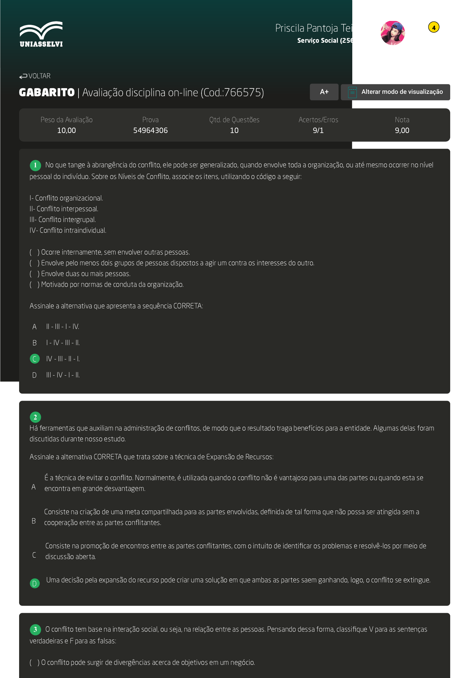GABARITO | Avaliação disciplina on-line (Cod.:766575) Peso da Avaliação 10,00 Prova 54964306 Qtd. de Questões 10 Acertos/Erros 9/1 Nota 9,00 No que tange à abrangência do conflito, ele pode ser generalizado, quando envolve toda a organização, ou até mesmo ocorrer no nível pessoal do indivíduo. Sobre os Níveis de Conflito, associe os itens, utilizando o código a seguir: I- Conflito organizacional. II- Conflito interpessoal. III- Conflito intergrupal. IV- Conflito intraindividual. ( ) Ocorre internamente, sem envolver outras pessoas. ( ) Envolve pelo menos dois grupos de pessoas dispostos a agir um contra os interesses do outro. ( ) Envolve duas ou mais pessoas. ( ) Motivado por normas de conduta da organização. Assinale a alternativa que apresenta a sequência CORRETA: A II - III - I - IV. B I - IV - III - II. C IV - III - II - I. D III - IV - I - II. Há ferramentas que auxiliam na administração de conflitos, de modo que o resultado traga benefícios para a entidade. Algumas delas foram discutidas durante nosso estudo. Assinale a alternativa CORRETA que trata sobre a técnica de Expansão de Recursos: A É a técnica de evitar o conflito. Normalmente, é utilizada quando o conflito não é vantajoso para uma das partes ou quando esta se encontra em grande desvantagem. B Consiste na criação de uma meta compartilhada para as partes envolvidas, definida de tal forma que não possa ser atingida sem a cooperação entre as partes conflitantes. C Consiste na promoção de encontros entre as partes conflitantes, com o intuito de identificar os problemas e resolvê-los por meio de discussão aberta. D Uma decisão pela expansão do recurso pode criar uma solução em que ambas as partes saem ganhando, logo, o conflito se extingue. O conflito tem base na interação social, ou seja, na relação entre as pessoas. Pensando dessa forma, classifique V para as sentenças verdadeiras e F para as falsas: ( ) O conflito pode surgir de divergências acerca de objetivos em um negócio. VOLTAR A+ Alterar modo de visualização 1 2 3 Priscila Pantoja Teixeira Serviço Social (2568401) 4 ( ) A existência de ideias diferentes pode levar ao conflito. ( ) Um conflito pode ser criado com uma ação, mesmo que não haja reação. Assinale a alternativa que apresenta a sequência CORRETA: A F - F - V. B V - V - F. C V - F - F. D F - V - V. Na administração de conflitos, existem duas técnicas que tratam de Alterações de Variáveis: a Alteração de Variáveis Humanas e a Alterações de Variáveis Estruturais. Assinale a alternativa CORRETA que trata sobre a técnica de Alteração de Variáveis Estruturais: A A pessoa envolvida na administração usa sua autoridade formal para resolver o conflito e depois comunica seu desejo às partes envolvidas. B Utilização de técnicas de mudança comportamental com o objetivo de modificar atitudes e comportamentos praticados pelas partes que possam estar causando o conflito. C Consiste em cada uma das partes abrir mão de algo valioso em prol de atingir uma situação em que ambas ainda saiam satisfeitas. D Pode ser necessário um redesenho na estrutura, transferências ou reacomodações, e pode ser utilizada em conflitos mais sérios no ambiente de trabalho. Algumas competências são importantes para um negociador poder gerenciar da melhor forma um momento de conflito. Sobre tais competências, analise as afirmativas a seguir: I- Ter jogo de cintura. II- Saber subornar pessoas. III- Saber lidar com situações difíceis. IV- Se manter firme ao seu objetivo, sem se colocar no lugar da outra parte. V- Descobrir outras possibilidades de desfechos para a negociação. Assinale a alternativa CORRETA: A As afirmativas I, II e V estão corretas. B As afirmativas II, III e IV estão corretas. C As afirmativas II, IV e V estão corretas. D As afirmativas I, III e V estão corretas. Algumas técnicas já foram formuladas e testadas para auxiliar na administração de conflitos, resultando em consequências benéficas às entidades e profissionais que se utilizam delas. Assinale a alternativa CORRETA que trata sobre a técnica de Suavização: A A pessoa envolvida na administração usa sua autoridade formal para resolver o conflito e depois comunica seu desejo às partes envolvidas. 4 5 6 Priscila Pantoja Teixeira Serviço Social (2568401) 4 B Técnica de minimizar as diferenças entre as partes envolvidas na situação de conflito, de modo a enfatizar seus interesses comuns. C Consiste em cada uma das partes abrir mão de algo valioso em prol de atingir uma situação em que ambas ainda saiam satisfeitas. D Utilização de técnicas de mudança comportamental com o objetivo de modificar atitudes e comportamentos praticados pelas partes que possam estar causando o conflito. Chiavenato (2014) elaborou um esquema analisando cinco técnicas de administração de conflitos, de acordo com dois tipos de graus diferentes. Quais são esses dois graus? FONTE: Chiavenato, I. Introdução à Teoria Geral da Administração. 9. ed. São Paulo: Manole, 2014. A Grau de gestão e Grau de funcionalismo. B Grau tangível e Grau intangível. C Grau de cooperação e Grau de assertividade. D Grau diário e Grau esporádico. A compreensão dos cinco estágios de uma situação de conflito auxilia em uma tomada de decisão propícia e tempestiva. Com isso, aumenta- se a chance de uma resolução que traga benefícios à entidade. Assinale a alternativa CORRETA que trata do estágio da INTENÇÃO: A Estágio no qual aparecem as condições e os fatores para o surgimento do conflito. B Estágio no qual condições anteriores levam ao conflito caso uma ou mais partes envolvidas tenha sido afetada e esteja consciente disso. C Estágio no qual a parte coloca em prática o que decidiu fazer para lidar com a oposição. D Estágio em que há a decisão de agir de uma determinada maneira. Entre as três abordagens possíveis para o administrador lidar com um conflito existente, há a