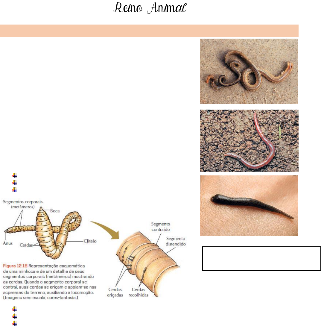 Biologia Anelídios Características Gerais: • Triblásticos • Celomados (esquizocelomados) • Tubo digestivo completo • Protostômios • Segmentados (metameria) • Corpo cilíndrico e alongado • Simetria bilateral • Sistema circulatório fechado • Sistema excretor – metanefrídios • Respiração cutânea ou branqueal • Encontrados nos ambientes aquáticos, doce ou salgada, e em ambientes terrestres úmidos. Principais Grupos: Oligochaeta São os anelídeos com poucas cerdas As cerdas são projeções rígidas, constituídas por quitina. Auxiliam na locomoção Apresentam grande diversidade de tamanho A mais conhecida minhoca de terra firme é a Pheretima hawayana As mais conhecidas da classe são as minhocas → Possuem papel importante na reciclagem de materiais orgânicos → Auxiliam na fertilização do solo → Auxiliam no processo de decomposição de materiais orgânicos → Geram fezes ricas em Nitrogênio → Húmus da minhoca → Escavam túneis → favorece a penetração de água no solo → Carne com alto teor de proteína Heritemas: Manchas vermelhas no corpo, oriundas do sangue “pizado” Polychaeta Possuem a presença de inúmeras cerdas Recebem o nome de Parápodes Possuem uma cabeça diferenciada → vários apêndices sensoriais Vivem principalmente no ambiente marinho São predadores Hirudinea Não possuem cerda nem parápodes Corpo levemente achatado dorsoventralmente Maioria vive na água doce, no mar, brejos ou pântanos. Conhecidos como sanguessugas Anatomia e Fisiologia dos Anelídios Possui Sistema digestório completo • Digestão exclusivamente extracelular • Possui a Moela que faz a função de digestão mecânica → Tritura o alimento (com o auxílio da terra) • Protostômio: projeção musculosa equivalente a um lábio usado para cavar • Protostômio → faringe → papo → Moela → intestino • Alimentam-se de matéria vegetal em decomposição • Tiflossole e Cecos Intestinais: aumentar a área de contato com os produtos da digestão e facilitar sua absorção. • Material não absorvido é liberado pelo ânus. Sistema Circulatório e Respiratório • Sistema circulatório fechado • Possui hemoglobina • Possui a respiração cutânea indireta →uso de sangue na respiração Sistema Excretor • Excreção por metanefrídios • Metanefrídios: retira as excretas diretamente do sangue • Nefridiósporos: realizam a excreção • Principal produto excretado: amônia + fezes → fertilização do solo Sistema Nervoso e Sistema Sensorial • Gânglios nervosos constituídos por gânglios cerebrais → localizados sobre a faringe • Feito também por dois cordões nervosos ventrais • Possui sistema sensorial pouco desenvolvido • Células epidérmicas especializadas em captar estímulos mecânicos, térmicos, e químicos formam seu sistema sensorial • Percebem se está claro ou escuro Reprodução dos Anelídios • Reprodução sexuada • Fecundação externa • Desenvolvimento indireto • Trocófora: ovo do qual surge a larva dos poliquetos • Oligoquetos e hirudíneos são monoicos e possuem desenvolvimento direto