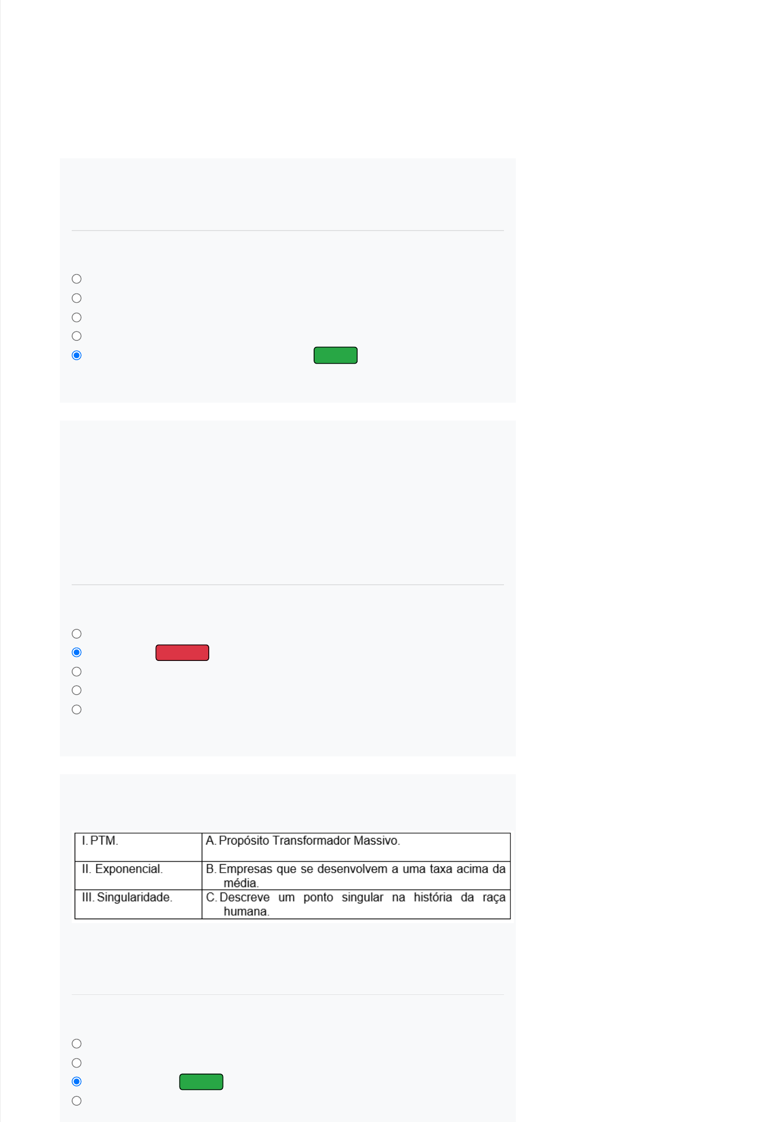 16/01/23, 11:57 Cosmos · Cosmos https://kroton.platosedu.io/lms/m/aluno/disciplina/index/2807505/5965324 1/4 Organizações exponenciais Professor(a): Renato Cividini Matthiesen (Mestrado acadêmico) 1) 2) 3) Prepare-se! Chegou a hora de você testar o conhecimento adquirido nesta disciplina. A Avaliação Virtual (AV) é composta por questões objetivas e corresponde a 100% da média final. Você tem até cinco tentativas para “Enviar” as questões, que são automaticamente corrigidas. Você pode responder as questões consultando o material de estudos, mas lembre-se de cumprir o prazo estabelecido. Boa prova! A transformação ____________ é uma____________ fundamental para uma ____________ que entrega ____________ a seus ____________. Assinale a alternativa que apresente os termos corretos para as lacunas: Alternativas: Código da questão: 62501 Sobre a transformação digital, há um(alguns) ponto(s) importante(s): I. A transformação digital refere-se à mudança cultural, organizacional e operacional de uma organização. II. Nosso mundo não é digital, e esperamos que a tecnologia funcione para nós de forma integrada. III. Traz um impacto acelerado em toda a sociedade de forma estratégica, focando em mudanças presentes e futuras. São verdadeiras: Alternativas: Código da questão: 62490 O que faz empresas como Amazon, Uber, Airbnb, Spotify e Netflix, todas com modelos de negócios muito diferentes, destacarem-se da concorrência? Assinale a alternativa que traz a associação correta entre as duas colunas: Alternativas: Analógica; alteração; organização; valor; fornecedores. Analógica; mudança; empresa; preço; clientes. Analógica; alteração; empresa; preço; clientes. Digital; alteração; empresa; preço; fornecedores. Digital; mudança; organização; valor; clientes. CORRETO I e III, apenas. I e II, apenas. INCORRETO II, apenas. I, apenas. III, apenas. I – B; II – A; III – C. I – C; II – A; III – B. I – A; II – B; III – C. CORRETO I – B; II – C; III – A. 16/01/23, 11:57 Cosmos · Cosmos https://kroton.platosedu.io/lms/m/aluno/disciplina/index/2807505/5965324 2/4 4) 5) 6) 7) Código da questão: 62482 As partes interessadas no negócio, como os sócios e os investidores, também anseiam pelo ponto de crescimento, pois isso significa mais: Assinale a alternativa que completa adequadamente a frase acima: Alternativas: Código da questão: 62499 As organizações lineares, como o próprio nome já sugere, funcionam de maneira previsível e: Assinale a alternativa que completa adequadamente a frase acima: Alternativas: Código da questão: 62485 É um pensamento metódico, analítico, racional e lógico. Estamos falando do: Assinale a alternativa que completa adequadamente a frase anterior: Alternativas: Código da questão: 62506 A transformação digital pode ser um processo desafiador, complexo e caro, sendo fácil errar. Muitos dos desafios inerentes à transformação digital decorrem de sua execução inadequada. Essas armadilhas incluem: Assinale as afirmativas a seguir com V (verdadeiro) ou F (falso): ( ) Não estabelecer uma meta clara e realista. ( ) Não ter a liderança certa. ( ) Não ter foco na experiência do cliente. ( ) Contar com uma comunicação interna ineficaz. ( ) Ter uma estratégia e uma orientação adequadas. Assinale a alternativa que traga a sequência correta: I – A; II – C; III – B. Clientes e alternativas. Visibilidade e lucros. Oportunidades e clientes. Negócios e visibilidade. Negócios e lucros. CORRETO Descomunal. Imensa. Burocrática. CORRETO Orgânica. Imprevisível. Pensamento incremental. Pensamento sequencial. Pensamento não linear. Pensamento exponencial. Pensamento linear. CORRETO 16/01/23, 11:57 Cosmos · Cosmos https://kroton.platosedu.io/lms/m/aluno/disciplina/index/2807505/5965324 3/4 8) 9) 10) Alternativas: Código da questão: 62488 O Propósito Transformador Massivo (PTM) demonstra o que a empresa fará, e não o que ela realmente faz, o que também é conhecido como propósito da empresa. Sobre o PTM, assinale a alternativa correta: Alternativas: Código da questão: 62479 Para manter certa escala de demanda e oferta, é necessário oferecer promoções. Por exemplo, o Airbnb oferece códigos promocionais aos usuários a fim de construir a fidelidade do cliente (de modo que não haja necessidade de readquirir um cliente a cada seis meses). Nesse sentido, estamos tratando do: Assinale a alternativa correta. Alternativas: Código da questão: 62493 Os seis pilares da transformação digital são experiências, pessoas, mudança, inovação, liderança e cultura. Sobre o assunto, associe corretamente as colunas a seguir: Assinale a alternativa que apresenta a associação correta entre as duas colunas: Alternativas: F – V – F – V – F. V – V – V – F – F. F – V – F – F – F. V – V – V – V – F. CORRETO V – V – F – V – F. Trata-se de uma cooperação. Trata-se de uma resolução. Trata-se de uma transformação. CORRETO Trata-se de uma conversão. Trata-se de uma digitalização. Processo de transação simples. Engajamento constante dos usuários. CORRETO Desenvolvimento de uma cultura de confiança. Agrupamento, dentro de uma plataforma, de proprietários e requerentes. Acesso em vez de propriedade. I – B; II – A; III – C. I – A; II – C; III – B. I – C; II – A; III – B. I – B; II – C; III – A. I – A; II – B; III – C. CORRETO 16/01/23, 11:57 Cosmos · Cosmos https://kroton.platosedu.io/lms/m/aluno/disciplina/index/2807505/5965324 4/4 Código da questão: 62503 Arquivos e Links