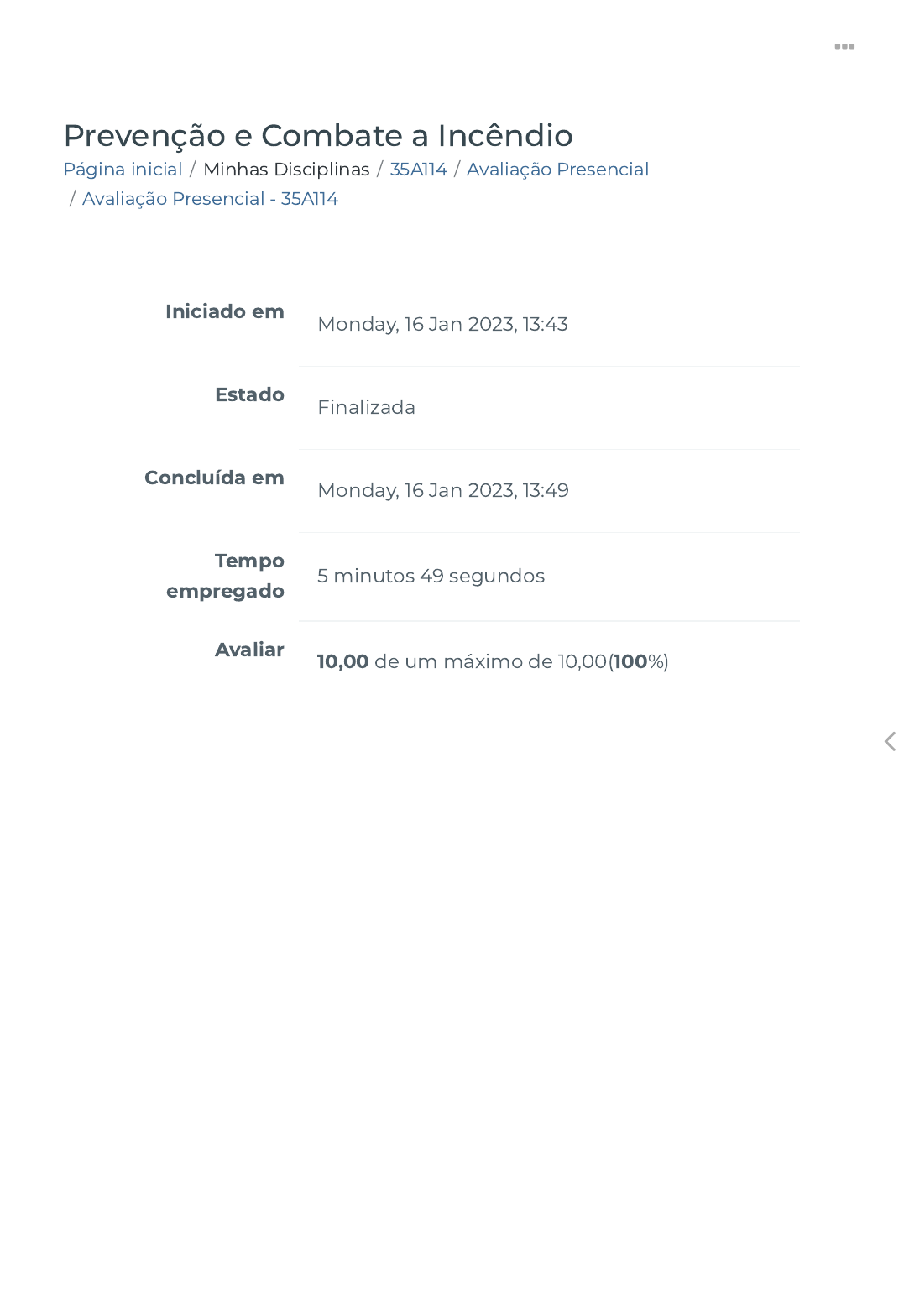 16/01/2023 13:49 Avaliação Presencial - 35A114 https://ava.politecnicabr.com.br/mod/quiz/review.php?attempt=4204434 1/12 Página inicial / Minhas Disciplinas / 35A114 / Avaliação Presencial / Avaliação Presencial - 35A114 Prevenção e Combate a Incêndio Iniciado em Monday, 16 Jan 2023, 13:43 Estado Finalizada Concluída em Monday, 16 Jan 2023, 13:49 Tempo empregado 5 minutos 49 segundos Avaliar 10,00 de um máximo de 10,00(100%) https://ava.politecnicabr.com.br/ https://ava.politecnicabr.com.br/course/view.php?id=1120 https://ava.politecnicabr.com.br/course/view.php?id=1120#section-10 https://ava.politecnicabr.com.br/mod/quiz/view.php?id=28889 https://ava.politecnicabr.com.br/ 16/01/2023 13:49 Avaliação Presencial - 35A114 https://ava.politecnicabr.com.br/mod/quiz/review.php?attempt=4204434 2/12 Questão 1 Completo Atingiu 1,00 de 1,00 Quando você utiliza um agente extintor a base AP, para apagar um incêndio classe “B” e faz uso deste agente extintor na forma jato sólido. O que ocorre com o incêndio? Escolha uma opção: a. Nenhuma das alternativas. b. Apagar o fogo. c. Diminuir o fogo até a sua extinção. d. Diminuir o fogo. e. Aumentar o fogo. https://ava.politecnicabr.com.br/ 16/01/2023 13:49 Avaliação Presencial - 35A114 https://ava.politecnicabr.com.br/mod/quiz/review.php?attempt=4204434 3/12 Questão 2 Completo Atingiu 1,00 de 1,00 Marque a alternativa correta para a extinção de um incêndio: Escolha uma opção: a. Quebra da reação em cadeia: consiste na interrupção da reação em cadeia, bloqueando o seu ciclo contínuo diretamente na área das chamas, com agentes extintores que reajam ao contato com o fogo e eliminem o comburente. b. Abafamento: é a não retirada do comburente (oxigênio), eliminando o elemento que intensi�ca a propagação do fogo e utilizando agentes extintores de origens naturais (areia/terra) ou químicas (bicarbonato de sódio, sulfato de alumínio, gra�te em pó etc.). c. Isolamento: trata-se da retirada do material combustível que ainda foi atingido, evitando, assim, o aumento da área incendiada. d. Resfriamento: consiste na retirada do calor do material combustível, aumentando sua temperatura com a utilização de água. https://ava.politecnicabr.com.br/ 16/01/2023 13:49 Avaliação Presencial - 35A114 https://ava.politecnicabr.com.br/mod/quiz/review.php?attempt=4204434 4/12 Questão 3 Completo Atingiu 1,00 de 1,00 O que é o Ponto de Encontro descrito no Plano de Emergência ? Escolha uma opção: a. Local onde a população da instalação deve reunir-se depois de abandonada a área de risco. O chefe da brigada fará então a chamada para conferência do pessoal. b. Local para carregar o extintor de incêndio próximo à instalação. c. Local para tomar café e almoçar após o teste de abandono ou incêndio. d. Todas as alternativas estão corretas. https://ava.politecnicabr.com.br/ 16/01/2023 13:49 Avaliação Presencial - 35A114 https://ava.politecnicabr.com.br/mod/quiz/review.php?attempt=4204434 5/12 Questão 4 Completo Atingiu 1,00 de 1,00 Qual são os critérios básicos para ser selecionado um Brigadista ? Escolha uma opção: a. Possuir experiência anterior como brigadista. b. Todas as alternativas estão corretas. c. Possuir robustez física e boa saúde. d. Ser alfabetizado, e permanecer a maior parte do tempo na edi�cação. https://ava.politecnicabr.com.br/ 16/01/2023 13:49 Avaliação Presencial - 35A114 https://ava.politecnicabr.com.br/mod/quiz/review.php?attempt=4204434 6/12 Questão 5 Completo Atingiu 1,00 de 1,00 Qual a melhor de�nição para a Brigada Contra Incêndio de uma instalação? Escolha uma opção: a. Grupo de trabalhadores treinados somente para combater incêndios quando a situação for crítica. b. Grupo de pessoas responsáveis em manter em bom estado de uso os equipamentos de combate a incêndios, com a �scalização periódica. c. É um grupo organizado de pessoas voluntárias ou não, treinadas e capacitadas para atuar na prevenção, abandono e combate a um princípio de incêndio e prestar primeiros socorros, dentro de uma área preestabelecida. d. É um grupo de pessoas voluntárias que têm por atribuições básicas a manutenção da segurança no ambiente de trabalho e a promoção do abandono somente em caso de atentado. https://ava.politecnicabr.com.br/ 16/01/2023 13:49 Avaliação Presencial - 35A114 https://ava.politecnicabr.com.br/mod/quiz/review.php?attempt=4204434 7/12 Questão 6 Completo Atingiu 1,00 de 1,00 Quais são os principais riscos encontrados em um incêndio? Escolha uma opção: a. Temperaturas elevadas, fumaça e gases tóxicos. b. Falta de oxigênio, temperaturas elevadas e gases tóxicos. c. Falta de oxigênio, fumaça e gases tóxicos. d. Falta de oxigênio, temperaturas elevadas, fumaça e gases tóxicos. https://ava.politecnicabr.com.br/ 16/01/2023 13:49 Avaliação Presencial - 35A114 https://ava.politecnicabr.com.br/mod/quiz/review.php?attempt=4204434 8/12 Questão 7 Completo Atingiu 1,00 de 1,00 São métodos e�cientes para a extinção do fogo: Escolha uma opção: a. O fogo se estabiliza, utilizando �uídos grachantes. b. Apenas jogar água. c. Isolamento, resfriamento, abafamento e Quebra da reação em cadeia d. Isolamento do combustível. https://ava.politecnicabr.com.br/ 16/01/2023 13:49 Avaliação Presencial - 35A114 https://ava.politecnicabr.com.br/mod/quiz/review.php?attempt=4204434 9/12 Questão 8 Completo Atingiu 1,00 de 1,00 O bombeiro/brigadista deve se equipar com o EPR, observando: Escolha uma opção: a. Validade do teste hidrostático; Vedação a alta pressão; Volante do cilindro; Tirantes e peça facial. b. Alças de transporte e cinto com �velas; Placa de suporte; Conexões das mangueiras. c. Conexão da válvula de demanda; Conexão do cilindro ao redutor de pressão; Cinta que prende o cilindro ao suporte. d. Pressão do cilindro; Funcionamento do manômetro; Alarme. e. Todas as alternativas anteriores estão c