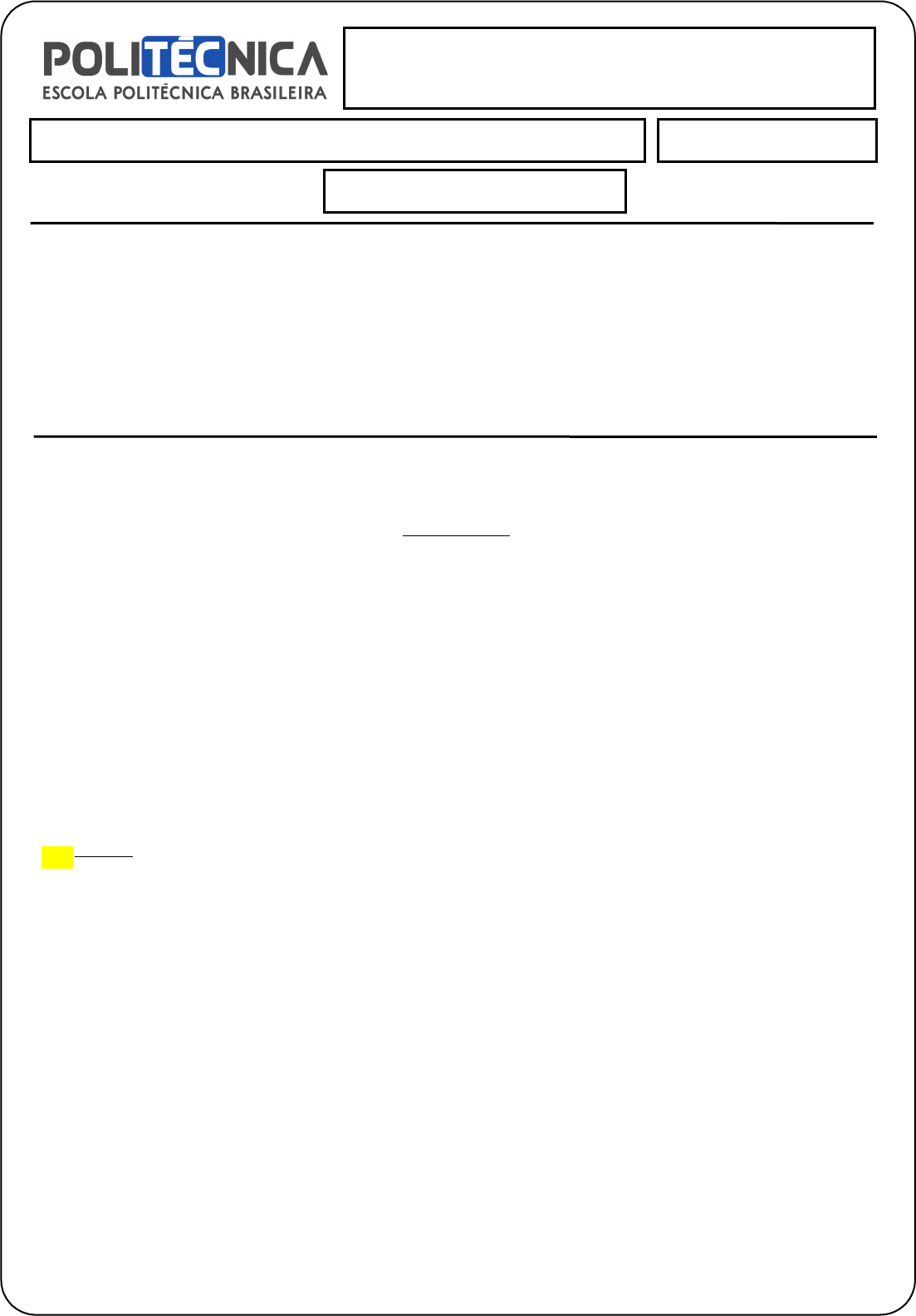 Mecânica dos Fluidos Aluno (a): Fábio Batista de Paiva Data: 14 / 01 / 2023 Atividade de Aprendizagem 01 ORIENTAÇÕES: · Esta Atividade contém 08 questões, totalizando 10 (dez) pontos. · Ler atentamente as instruções contidas no documento é de fundamental importância na realização da avaliação. · Para esta atividade o aluno poderá utilizar-se das ferramentas de pesquisas como: internet, artigos científicos, manuais técnicos, livros e literaturas disponibilizadas em nossa biblioteca. · Você deve preencher dos dados no Cabeçalho para sua identificação - Nome / Data de entrega · Ao terminar grave o arquivo com o nome Atividade de Envio (nome do aluno). · A nota será lançada no sistema. · O prazo de correção é de até 07 (sete) dias úteis. · Envie o arquivo pelo sistema em formato digital em PDF ou WORD. Bons Estudos! Observação: Só será avaliada a questão que apresentar o seu respectivo desenvolvimento. QUESTÕES 1. Descreva como se comporta a distribuição da pressão hidrostática em uma massa fluida? O peso específico desses fluídos permanece constante com a profundidade da massa fluída, o que define os fluídos incompressíveis. A variação da pressão no fluído varia linearmente com a profundidade, fenômeno conhecido como a distribuição da pressão hidrostática, as pressões absolutas de pressões manométricas, levando em consideração o referencial da escala. 2. O que se entende por altura de carga? A altura H (m) é também conhecida como altura de carga e pode ser interpretada como a altura de uma coluna de líquido de peso específico γ (N.m³) necessária para manter uma diferença de pressão. P – P0 h = 3. Explique em uma figura as diferenças entre pressão manométrica e pressão absoluta? 4. Qual a pressão manométrica em kPa em um recipiente contendo óleo cujo tubo piezométrico apresenta uma leitura de 0,30 m. Considere a densidade relativa do óleo igual a 0,9? Di = γi / γágua 0,9= γóleo / 1000 γóleo = 9.000 Pa = γ.h Pa = 9.000 . 0,3 Pa = 2.700 KPa 5. Por que os medidores de pressão mecânicos ou elétricos são mais práticos que os manômetros de coluna de líquido? Porque manômetro de coluna de líquido só pode ser utilizado para medição de pressão em reservatórios com líquidos e nunca com gases, pois esses sairiam pela extremidade e se perderiam na atmosfera. As pressões manométricas a serem medidas devem ser positivas e não podem ser muito elevadas, de modo que a coluna de líquido não possa atingir uma pressão muito elevada pois isso não é razoável para sua construção e nem para a obtenção das leituras. 6. No lado da sucção de uma bomba, um medidor de pressão de Bourdon mede 40 kPa de vácuo. Qual a pressão absoluta equivalente, se a pressão atmosférica absoluta é igual a 100 kPa? Pabs = Prel + P.atm Pabs = -40 + 100 Pabs = 60 KPa 7. Deduza a equação para determinar a pressão no reservatório B em função da pressão no reservatório A da Figura 1.8 da aula 01? Pa + γ1 . h1 + γ2 . h2 = Pb + γ3 . h3 Pb = Pa + γ1 . h1 + γ2 . h2 - γ3 . h3 8. Qual a pressão sobre o casco de um submarino que viaja a 50 m abaixo da superfície livre? Considerando a pressão atmosférica igual a 100 kPa, quantas vezes a pressão sobre o casco é maior do que a pressão atmosférica? P = P.atm + d.g.h P = 108 + (10³ . 10 . 50) P = 600000P = 600 KPa 600/100 = 6 A pressão sobre o casco é 6 vezes maior que a pressão atmosférica. Atividade de Aprendizagem 01: Mecânica dos Fluidos