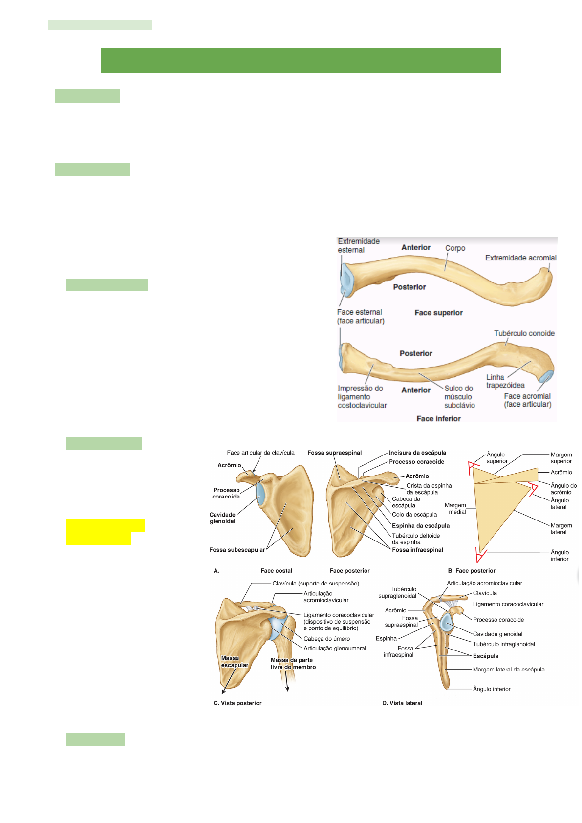 Suellen Atanazio, MED P4 Anatomia topográfica da cintura escapular e membros superiores OBJETIVOS: ● Estudar anatomia topográfica da cintura escapular e membros superiores, e as suas relações anatômicas, em peças no laboratório. ● Verificar os conhecimentos dos discentes, por meio de arguições individuais e/ou em grupo. VISÃO GERAL ● O membro superior é dividido em cíngulo do membro superior e parte livre do membro superior. O cíngulo do membro superior é constituído pela escápula e pela clavícula de cada lado, enquanto a parte livre do membro é dividida, por articulações, em braço, antebraço e mão. TÓPICOS ABORDADOS: 1. CLAVÍCULA ● Extremidade acromial ● Extremidade esternal ● Tubérculo conóide ● Corpo da clavícula ● Face articular acromial ● Face articular esternal ● Impressão do ligamento costoclavicular ● Sulco do músculo subclávio 2. ESCÁPULA ● Margem medial ● Margem lateral ● Ângulo superior ● Ângulo inferior ● Face posterior ● Face costal ● Fossa subescapular ● Acrômio ● Ângulo do acrômio ● Face articular da clavícula ● Processo coracóide ● Espinha da escápula ● Fossa supraespinal ● Fossa infra espinhal ● Incisura da escápula ● Cavidade glenóide ● Tubérculo supraglenoidal ● Tubérculo infraglenoidal ● Colo da escápula 3. ÚMERO Suellen Atanazio, MED P4 ● Cabeça do úmero ● Colo anatômico ● Tubérculo maior ● Tubérculo menor ● Sulco intertubercular ● Colo cirúrgico ● Crista do tubérculo maior ● Crista do tubérculo menor ● Corpo do úmero ● Tuberosidade do músculo deltóide ● Fossa coronóide ● Fossa radial ● Epicôndilo medial do úmero ● Epicôndilo lateral do úmero ● Capítulo do úmero ● Tróclea do úmero ● Côndilo do úmero ● Crista supraepicondilar medial ● Crista supraepicondilar lateral ● Fossa do olécrano ● Sulco do nervo radial ● Sulco do nervo ulnar 4. ULNA ● Olécrano ● Incisura troclear ● Processo coronóide da ulna ● Incisura radial ● Tuberosidade da ulna ● Crista do músculo supinador ● Corpo da ulna ● Margem interóssea ● Cabeça da ulna ● Circunferência articular ● Processo estilóide da ulna 5. RÁDIO Suellen Atanazio, MED P4 ● Cabeça do rádio (circunferência articular) ● Fóvea articular ● Colo do rádio ● Tuberosidade do rádio ● Corpo do rádio ● Margem interóssea ● Processo estilóide do rádio ● Incisura ulnar ● Face articular carpal ● Faces: anterior, posterior e lateral ● Sulcos e cristas ósseas para os tendões dos músculos extensores 6. MÃO 6.1 OSSOS DO CARPO ● Escafóide ● Semilunar ● Piramidal ● Psiforme ● Trapézio ● Trapezóide ● Capitato ● Hamato 6.2 OSSOS DO METACARPO (I ao V) ● Base ● Corpo ● Cabeça 6.3 FALANGES ● Base da falange ● Corpo da falange ● Cabeça da falange ● Tuberosidade (apenas nas falanges distais) ● Proximal ● Média ● Distal Suellen Atanazio, MED P4 Ligamentos, Articulações (membros superiores) e plexo braquial 1. OMBRO ● Ligamento acromioclavicular ● Ligamento coracoacromial ● Ligamentos coracoclaviculares: ○ Ligamento trapezóide ○ Ligamento conóide ● Ligamento transverso superior da escápula e da incisura da escápula ● Ligamento coracoumeral ● Ligamentos glenoumerais ● Ligamento transverso do úmero 2. COTOVELO ● Ligamento colateral ulnar (partes: anterior e posterior) ● Ligamento colateral radial ● Ligamento anular do rádio ● Cápsula articular ● Membrana interóssea 3. PUNHO E MÃO ● VISTA PALMAR ○ Ligamento transverso do carpo ○ Ligamento radiocarpal palmar ○ Ligamento rádio ulnar palmar Suellen Atanazio, MED P4 ○ Ligamento ulnocarpal palmar ○ Ligamento piso-uncinado (piso-hamato) ○ Ligamento pisometacarpal ○ Ligamentos metacarpais palmares ○ Ligamentos carpometacárpicos palmares ○ Ligamento metacarpal transverso profundo ● VISTA DORSAL ○ Ligamento radiocarpal dorsal ○ Ligamento colateral radial do carpo ○ Ligamento colateral ulnar do carpo ○ Ligamentos intercarpais dorsais ○ Ligamentos carpometacarpais dorsais ○ Ligamentos metacarpais dorsais ○ Ligamentos colaterais 4. ARTICULAÇÕES ● Acromioclavicular ● Esternoclavicular ● Escápulo-umeral ● Úmero-ulnar ● Úmero-radial ● Rádio-ulnar proximal ● Rádio-ulnar distal ● Rádiocárpica ● Carpometacárpica ● Cárpica ● Metacarpofalângicas ● Interfalangeanas proximais ● Interfalangeanas distais 5. PLEXO BRAQUIAL ● Raízes: C5, C6, C7, C8 e T1 ● Tronco superior ● Tronco médio ● Tronco inferior ● Fascículo lateral ● Fascículo medial ● Fascículo posterior ● Nervo músculo cutâneo ● Nervo mediano ● Nervo ulnar ● Nervo radial ● Nervo axilar Suellen Atanazio, MED P4