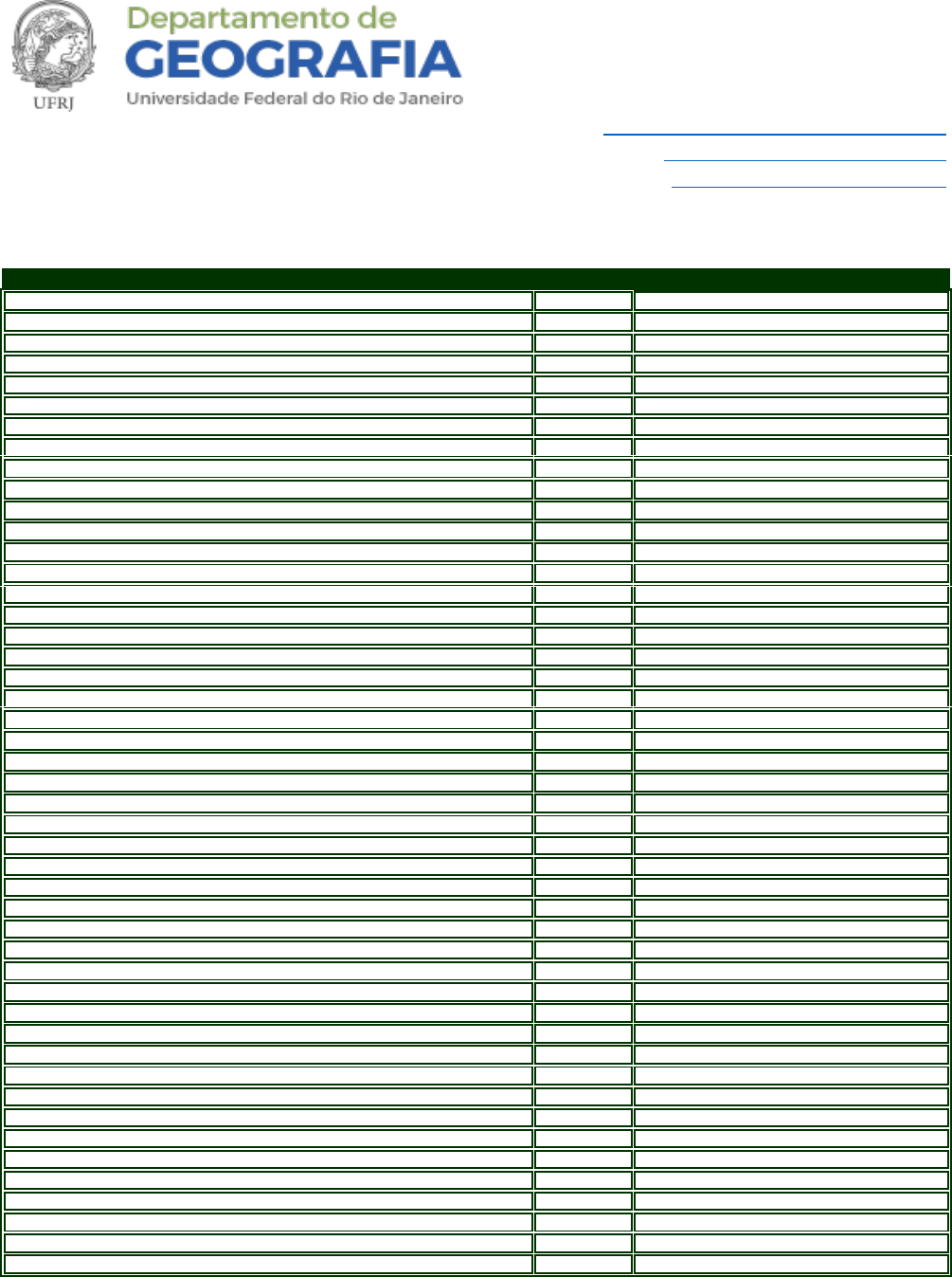 Emitido em: 30/06/2021 as 17:50 UNIVERSIDADE FEDERAL DO RIO DE JANEIRO INSTITUTO DE GEOCIÊNCIAS – IGEO/CCMN DEPARTAMENTO DE GEOGRAFIA Av. Athos da Silveira Ramos, 274, CCMN, Bloco G, CEP 21941-611, Rio de Janeiro – RJ. Tel:(021) 2590-1880; www.geografia.ufrj.br bacharelado.geografia@igeo.ufrj.br licenciatura.geografia@igeo.ufrj.br Nome Matrícula Orientador Acadêmico ACELINO DE AMORIM DE OLIVEIRA 115122923 ANDRÉ DE SOUZA AVELAR ADILIO ARAUJO DE JESUS MOREIRA 110088409 SARAH ALMEIDA DE OLIVEIRA AFONSO DE SOUZA JUNIOR 116153024 SARAH ALMEIDA DE OLIVEIRA AILTON RANGEL RODRIGUES 114164320 SARAH ALMEIDA DE OLIVEIRA ALAN FELIX DE MOURA 115205909 ÊNIO JOSÉ SERRA DOS SANTOS ALAN RIBEIRO PAIVA 119164676 GISLENE APARECIDA DOS SANTOS ALEXANDRA GUIMARÃES DE OLIVEIRA PEREIRA 118194678 EDUARDO JOSÉ PEREIRA MAIA ALEXANDRA GUIMARÃES DE OLIVEIRA PEREIRA 118194678 ÊNIO JOSÉ SERRA DOS SANTOS ALEXIA SERRANO PINTO DO NASCIMENTO 118185514 ÊNIO JOSÉ SERRA DOS SANTOS ALINE BATISTA OLIVEIRA 118142859 SARAH ALMEIDA DE OLIVEIRA ALINE DO NASCIMENTO DE ARAUJO 118167079 EDUARDO JOSÉ PEREIRA MAIA ALLANA MARINHO AVELINO 118183693 ÊNIO JOSÉ SERRA DOS SANTOS ALUAN KLEBER MENDONCA PESSOA 119168874 MARIA NAÍSE DE OLIVEIRA PEIXOTO AMANDA LACERDA REIS 120175622 ANDRÉ DE SOUZA AVELAR AMANDA OLIVEIRA E SILVA 119163581 NÚBIA BERAY ARMOND AMANDA PEREIRA DE LIMA PIMENTEL (COLOU GRAU) 111406715 SARAH ALMEIDA DE OLIVEIRA ANA BEATRIZ SILVA BEDA DOS REIS 117220442 EDUARDO JOSÉ PEREIRA MAIA ANA CAROLINA BARBOSA CESARIO 115152960 SARAH ALMEIDA DE OLIVEIRA ANA CAROLINA DE SOUZA FELIPPE 117249527 ÊNIO JOSÉ SERRA DOS SANTOS ANA CAROLINA PESSOA DA SILVA 120088621 ROBERTO MARQUES ANA FLÁVIA NUNES DE ABREU FERREIRA 118176450 SARAH ALMEIDA DE OLIVEIRA ANA PAULA SILVA FURTADO 116051395 MARIA NAÍSE DE OLIVEIRA PEIXOTO ANDRESSA LIMA MATTOS 120127255 MARCOS PAULO FERREIRA DE GÓIS ANNA CLARA MAGARAO DE MATTOS 114176929 EDUARDO JOSÉ PEREIRA MAIA ANNA LUIZA DO NASCIMENTO PINHEIRO 119153104 GISLENE APARECIDA DOS SANTOS ANTONIA NATRICIA RODRIGUES BARBOSA 119165363 MARIA NAÍSE DE OLIVEIRA PEIXOTO ARTHUR FONSECA DE AVELLAR 119135994 NÚBIA BERAY ARMOND ARTHUR VITOR DO CARMO DA SILVA 120177933 ROBERTO MARQUES ARYANE ALVES DA SILVA 116149863 EDUARDO JOSÉ PEREIRA MAIA BARBARA CRISTINA MACIEIRA FIRMINO 120171872 ANDRÉ DE SOUZA AVELAR BARBARA DE ALMEIDA CARDOSO 115149917 EDUARDO JOSÉ PEREIRA MAIA BARBARA TRISTAO CORDOLINO 118177309 EDUARDO JOSÉ PEREIRA MAIA BEATRIZ BRUM DOMINGUES DETTMANN 120089091 MARCOS PAULO FERREIRA DE GÓIS BEATRIZ GOMES ARAUJO 119138502 GISLENE APARECIDA DOS SANTOS BEATRIZ REBELLO RUZZA DE CARVALHO 116186085 ÊNIO JOSÉ SERRA DOS SANTOS BEATRIZ RODRIGUES CARDOSO PERES 116150953 MARIA NAÍSE DE OLIVEIRA PEIXOTO BEATRIZ VERISSIMO DE SOUZA TAVARES 115160379 ÊNIO JOSÉ SERRA DOS SANTOS BERNARDO DE SOUZA PINTO OBADIA 117239865 MARIA NAÍSE DE OLIVEIRA PEIXOTO BERNARDO JOSÉ ALVAREZ DE CASTRO 118064255 MARIA NAÍSE DE OLIVEIRA PEIXOTO BIANCA ROSA GERALDO RESENDE DE BRITO (COLOU GRAU) 116192858 SARAH ALMEIDA DE OLIVEIRA BIANCA TORRES PECANHA 117219807 SARAH ALMEIDA DE OLIVEIRA BRAYAN DE OLIVEIRA SOUZA 119181165 MARIA NAÍSE DE OLIVEIRA PEIXOTO BRENDA MEL COSMO DE CASTRO 116170490 EDUARDO JOSÉ PEREIRA MAIA BRUNA DE CERQUEIRA RAMOS GODINHO 118192121 ÊNIO JOSÉ SERRA DOS SANTOS BRUNA LUIZA BOA MORTE DE ANDRADE 114135517 ÊNIO JOSÉ SERRA DOS SANTOS BRUNA MARQUES DE AZEVEDO 114156018 MARIA NAÍSE DE OLIVEIRA PEIXOTO BRUNO BARRETO DOS SANTOS 111475170 EDUARDO JOSÉ PEREIRA MAIA Orientação Acadêmica Pagina: 1 de http://www.geografia.ufrj.br/ mailto:bacharelado.geografia@igeo.ufrj.br mailto:licenciatura.geografia@igeo.ufrj.br Emitido em: 30/06/2021 as 17:50 BRUNO MARCENAL DE JESUS 114139082 SARAH ALMEIDA DE OLIVEIRA BRUNO ZANOTTO VIGNA 116144342 ÊNIO JOSÉ SERRA DOS SANTOS BRYAN GOMES DE JESUS 119160151 NÚBIA BERAY ARMOND CAIO BARANDA OLIVEIRA 120138303 MARCOS PAULO FERREIRA DE GÓIS CAIO CESAR BARROS PEREIRA 118173127 SARAH ALMEIDA DE OLIVEIRA CAIO CESAR GOMES MORORO 119169367 GISLENE APARECIDA DOS SANTOS CAIO GABRIEL CABRAL BARBOSA 119154956 MARIA NAÍSE DE OLIVEIRA PEIXOTO CAIO LUCAS ALVES RAPOSO 119132386 NÚBIA BERAY ARMOND CAIO MOUTINHO COSTA DE SANT ANA 118167338 EDUARDO JOSÉ PEREIRA MAIA CAMILA DOS SANTOS CALADO 118177163 ÊNIO JOSÉ SERRA DOS SANTOS CAMILA NASCIMENTO ALVES DA SILVA 120133507 ROBERTO MARQUES CARLOS CLEBER DA SILVA MORAES JUNIOR 118162427 SARAH ALMEIDA DE OLIVEIRA CAROLINA DE OLIVEIRA SILVA 117228076 EDUARDO JOSÉ PEREIRA MAIA CLARA FROSSARD DO PATROCINIO 116166043 MARIA NAÍSE DE OLIVEIRA PEIXOTO CLARA MARINHO CARDOSO GUEDES 120123552 ANDRÉ DE SOUZA AVELAR CLAUDIO VINICIUS DE OLIVEIRA MORAIS 113148054 ÊNIO JOSÉ SERRA DOS SANTOS CRISTIANO ARAUJO DE SOUZA 107431520 SARAH ALMEIDA DE OLIVEIRA DANIEL RIBEIRO GOMES DI SALVO 116162992 SARAH ALMEIDA DE OLIVEIRA DANIEL SANTOS DA SILVA 113144296 MARIA NAÍSE DE OLIVEIRA PEIXOTO DANIEL SUSSUARANA VENTURA 117197461 ÊNIO JOSÉ SERRA DOS SANTOS DANIEL THOME DA COSTA 119150677 GISLENE APARECIDA DOS SANTOS DAVI ALVES LUNA DE OLIVEIRA 120166055 MARCOS PAULO FERREIRA DE GÓIS DAVI CARLOS OLIVEIRA MELO 115197067 MARIA NAÍSE DE OLIVEIRA PEIXOTO DIANA DE SOUZA BESERRA 120132909 ROBERTO MARQUES DIEGO DE LIMA LOPES 117240078 MARIA NAÍSE DE OLIVEIRA PEIXOTO DIEGO MEIRELES ZAO 118184623 EDUARDO JOSÉ PEREIRA MAIA DIEGO ROBERTO CORRÊA DA SILVA 109059154 ÊNIO JOSÉ SERRA DOS SANTOS DIOGO DE LIMA WAGNER 116186378 EDUARDO JOSÉ PEREIRA MAIA DJALMIR SILVA DE SENA 120177983 ANDRÉ DE SOUZA AVELAR DOMYNIQUE DA SILVA SANTOS 119150245 MARIA NAÍSE DE OLIVEIRA PEIXOTO DOUGLAS DOS SANTOS FIGUEIRA 119163793 NÚBIA BERAY ARMOND EDUARDA MORENO DA SILVA 117244187 SARAH ALMEIDA DE OLIVEIRA EDUARDO LUIZ DE QUEIROZ ZEFERINO 118167639 ÊNIO JOSÉ SERRA DOS SANTOS EDUARDO PINHEIRO DE ARAUJO ABREU 116141491 ÊNIO JOSÉ SERRA DOS SANTOS EDUARDO TORRES FERREIRA 117206799 EDUARDO JOSÉ PEREIRA MAIA ELIZABETH DOS SANTOS GONCALVES 120168154 MARCOS PAULO FERREIRA DE GÓIS EME