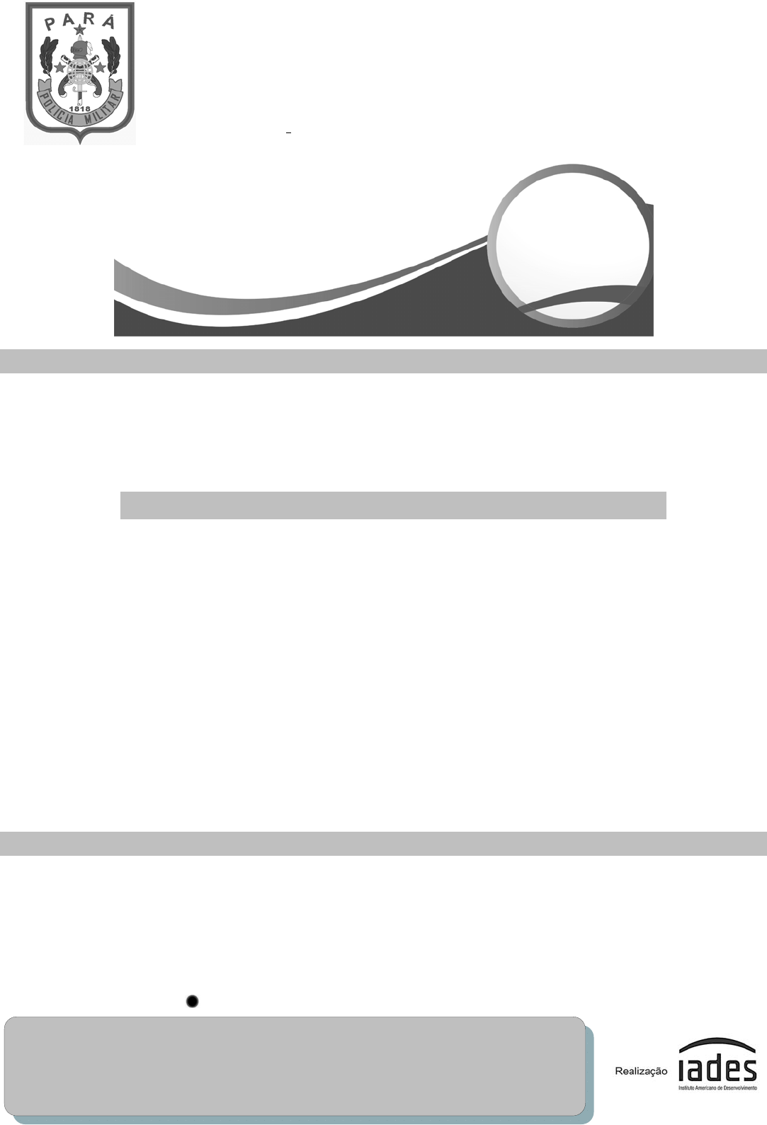 GOVERNO DO ESTADO DO PARÁ POLÍCIA MILITAR DO PARÁ (PMPA) SECRETARIA DE ESTADO DE PLANEJAMENTO E ADMINISTRAÇÃO (SEPLAD) CONCURSO PÚBLICO PARA ADMISSÃO AO CURSO DE FORMAÇÃO DE PRAÇAS - CFP/PMPA/2020 EDITAL No 01-CFP/PMPA/SEPLAD-, DE 12 DE NOVEMBRO DE 2020. CFP/PMPA 201 – MASCULINO Tipo “A” I N S T R U Ç Õ E S Você receberá do fiscal: o um caderno de questões da prova objetiva contendo 60 (sessenta) questões de múltipla escolha, com 5 (cinco) alternativas de resposta cada uma e apenas 1 (uma) alternativa correta; e o uma folha de respostas personalizada da prova objetiva. Quando autorizado pelo fiscal do IADES, no momento da identificação, escreva no espaço apropriado da folha de respostas da prova objetiva, com a sua caligrafia usual, a seguinte frase: A persistência é o caminho do êxito. Verifique se estão corretas a numeração das questões e a paginação do caderno de questões, bem como a codificação da folha de respostas da prova objetiva. Você dispõe de 4 (quatro) horas para fazer a prova objetiva e deve controlar o tempo, pois não haverá prorrogação desse prazo. Esse tempo inclui a marcação da folha de respostas da prova objetiva. Somente 1 (uma) hora após o início da prova, você poderá entregar sua folha de respostas da prova objetiva e o caderno de provas, bem como retirar-se da sala. Somente será permitido levar o caderno de questões da prova objetiva 3 (três) horas e 30 (trinta) minutos após o início da prova. Após o término da prova, entregue ao fiscal do IADES a folha de respostas da prova objetiva, devidamente assinada. Deixe sobre a carteira apenas o documento de identidade e a caneta esferográfica de tinta preta, fabricada com material transparente. Não é permitida a utilização de nenhum aparelho eletrônico ou de comunicação. Não é permitida a consulta a livros, dicionários, apontamentos e (ou) apostilas. Você somente poderá sair e retornar à sala de aplicação de provas na companhia de um fiscal do IADES. Não será permitida a utilização de lápis em nenhuma etapa da prova. Os 3 (três) últimos candidatos de cada sala só poderão sair juntos. Caso algum destes candidatos insista em sair do local de aplicação antes de autorizado pelo fiscal de aplicação, será lavrado Termo de Ocorrência, assinado pelo candidato e testemunhado pelos 2 (dois) outros candidatos, pelo fiscal de aplicação da sala e pelo coordenador do local de provas. I N S T RU Ç Õ E S P A R A A P R O V A O BJ E T I V A Verifique se os seus dados estão corretos na folha de respostas da prova objetiva. Caso haja algum dado incorreto, comunique ao fiscal. Leia atentamente cada questão e assinale, na folha de respostas da prova objetiva, uma única alternativa. A folha de respostas da prova objetiva não pode ser dobrada, amassada, rasurada ou manchada e nem pode conter nenhum registro fora dos locais destinados às respostas. O candidato deverá transcrever, com caneta esferográfica de tinta preta, as respostas da prova objetiva para a folha de respostas. A maneira correta de assinalar a alternativa na folha de respostas da prova objetiva é cobrir, fortemente, com caneta esferográfica de tinta preta, o espaço a ela correspondente. Marque as respostas assim: CONCURSO PÚBLICO – SEPLAD-PMPA-CFP CFP-PMPA – 201 – TIPO “A” PÁGINA 2/15 P R O V A O B J E T I V A RACIOCÍNIO LÓGICO Questões de 1 a 6 QUESTÃO 1 _______________________ Suponha que um extrato do relatório de crimes violentos letais intencionais (CVLI) do estado do Pará apresente os dados a seguir. CVLI 2018 2019 Variação percentual Homicídio doloso 180 198 Latrocínio 150 180 Qual é o valor da soma ? (A) 10% (B) 20% (C) 30% (D) 40% (E) 50% QUESTÃO 2 _______________________ Qual das proposições a seguir apresenta a negação da proposição composta: “O Sgt PM J. B. está na ronda ostensiva e o Sgt PM B. J. está de sargento de dia.”? (A) O Sgt PM J. B. não está na ronda ostensiva e o Sgt PM B. J. não está de sargento de dia. (B) O Sgt PM J. B. não está na ronda ostensiva ou o Sgt PM B. J. não está de sargento de dia. (C) O Sgt PM J. B. está na ronda ostensiva ou o Sgt PM B. J. está de sargento de dia. (D) Se o Sgt PM J. B. está na ronda ostensiva, então o Sgt PM B. J. não está de sargento de dia. (E) O Sgt PM J. B. está na ronda ostensiva se, e somente se, o Sgt PM B. J. estiver de sargento de dia. QUESTÃO 3 _______________________ Suponha que, em determinada cidade, o Batalhão Metropolitano da Polícia Militar possui seis companhias; cada uma dessas companhias possui cinco pelotões e cada um desses pelotões possui seis destacamentos. Quantos destacamentos possui o Batalhão Metropolitano? (A) 17 (B) 120 (C) 150 (D) 180 (E) 200 Área livre QUESTÃO 4 ________________________ Se o Ten PM J. B. está de serviço de oficial-de-dia, então o Sgt PM B. J. não está de serviço de adjunto ao oficial-de-dia. Se o Sgt PM B. J. não está de serviço de adjunto ao oficial-de-dia, então o Sd PM J. J. não está na ronda ostensiva. Se o Sd PM J. J. não está na ronda ostensiva, então o cabo PM B. B. não está de motorista de dia. Se o cabo PM B. B. está de motorista de dia, é correto concluir que o (A) Sgt PM B. J. não está de serviço de adjunto ao oficial-de-dia. (B) Ten PM J. B. não está de serviço de oficial-de-dia. (C) Sd PM J. J. não está na ronda ostensiva. (D) Ten PM J. B. está de serviço de oficial-de-dia e o Sd PM J. J. não está na ronda ostensiva. (E) Ten PM J. B. está de serviço de oficial-de-dia. QUESTÃO 5 ________________________ Para o hasteamento da Bandeira Nacional na formatura matinal do 7o Batalhão de Polícia Motorizada, serão escalados um sargento entre os 12 do batalhão e um cabo entre os 20 do batalhão. Qual é a probabilidade de o Sgt PM J. B. e o cabo PM B. J., que estão lotados no 7o Batalhão de Polícia Motorizada, serem escalados para o hasteamento do Pavilhão Nacional? (A) 1 120 