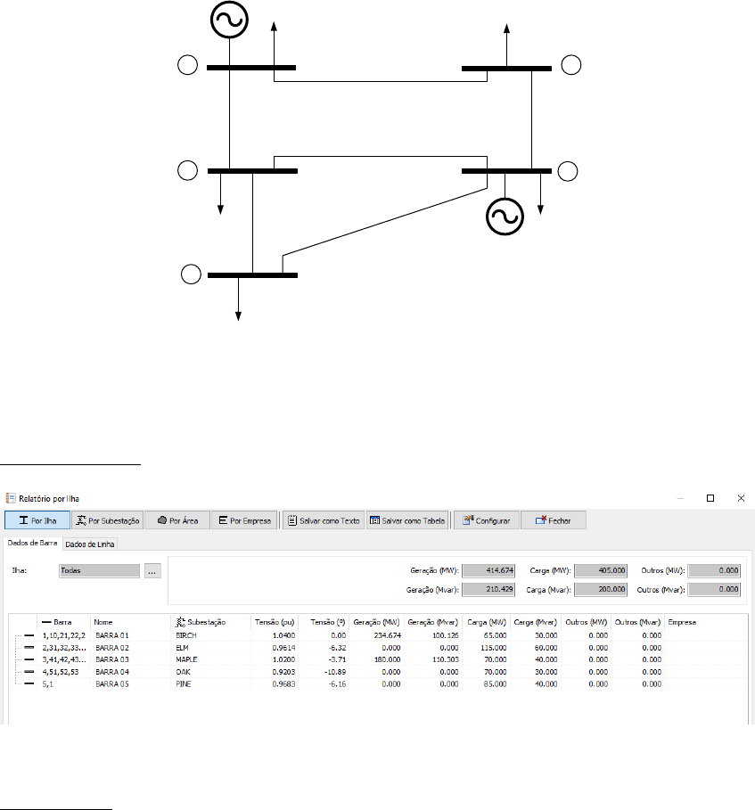 Análise Integrada de Fluxo de Potência e Curto-Circuito no Simulight Este é um exemplo de análise integrada de fluxo de potência e curto-circuito que pode ser feita no software Simulight. O sistema teste é retirado do livro “Elementos de Análise de Sistemas de Potência” de Willian D. Stevenson Jr. (2ª. Edição em Português). Os dados se encontram no Exemplo 8.1 (pág. 214) do capítulo “Soluções e Controle de Fluxo de Carga”e Exemplo 10.4 (pág. 284) do capítulo “Faltas Trifásicas Simétricas”. A Figura 1 mostra o diagrama unifilar do sistema teste. 1 5 2 3 4 Birch Elm Pine Maple Oak Figura 1 – Diagrama unifilar do sistema 5 barras do Stevenson Os dados para rodar o caso no Simulight se encontram no arquivo Exemplo8_1_Stevenson.fdx. Fluxo de Potência Figura 2 – Resultado do fluxo de potência Curto-Circuito A Fig.3 apresenta o resultado do curto-circuito trifásico na Barra 04 (Oak) considerando como tensões pré-falta, as tensões da solução do fluxo de potência apresentado na Fig.2. Diferentemente do Exemplo 10.4 do Stevenson, o resultado considera também os shunts das linhas de transmissão e a impedância das cargas. Figura 3 – Resultado do curto-circuito trifásico na Barra 04 (Oak) considerando as cargas Para se aproximar à solução obtida no Exemplo 10.4 do Stevenson, foi retirada a carga do sistema e os shunts e resistências das linhas de transmissão. Entretanto, as tensões pré-falta continuaram sendo as tensões obtidas da solução do fluxo de potência. Os dados se encontram no arquivo Exemplo8_1_Stevenson_semresist.fdx. A Fig.4 apresenta o novo resultado do curto-circuito na Barra 04. Figura 4 – Resultado do curto-circuito trifásico na Barra 04 (Oak) desconsiderando as cargas e os shunts das linhas de transmissão Algumas observações devem ser feitas na comparação dos resultados da Fig.4 com os resultados do Exemplo 10.4 do Stevenson. As reatâncias equivalentes em destaque na Fig.4 são praticamente idênticas à quarta coluna da matriz Zbarra dada no Stevenson e reproduzida abaixo: [ ] (1) O mesmo não pode ser dito da corrente de curto-circuito e das tensões nas outras barras, uma vez que o Stevenson considera todas as tensões pré-falta iguais a 1,0 pu, enquanto que os resultados do Simulight consideram como tensões pré-falta, as tensões do fluxo de potência. Corrente de Falta do Simulight = 3,965 pu Corrente de Falta do Stevenson = 4,308 pu Tensão na Barra 03 do Simulight = 0,7377 pu Tensão na Barra 03 do Stevenson = 0,6898 pu Tensão na Barra 05 do Simulight = 0,5734 pu Tensão na Barra 05 do Stevenson = 0,5683 pu Calculando-se a razão entre as duas correntes de falta (calculadas pelo Simulight e pelo Stevenson) tem-se a tensão pré-falta da Barra 04, ou seja: É possível conseguir os mesmos resultados obtidos pelo Stevenson com algumas manipulações no Simulight. Todas as cargas devem ser desligadas, as gerações nas barras PV devem ser zeradas e as tensões nas barras Vθ e PV devem ser especificadas em 1,0 pu. Após as modificações roda-se o fluxo de potência e posteriormente o curto-circuito equilibrado. O caso com essas alterações se encontra no arquivo Exemplo8_1_Stevenson_V1pu.fdx (Obs: Não rodar o fluxo de potência para não alterar o estado da rede!). As Figuras 5-9 mostram os resultados do curto-circuito nas Barras 01-05, respectivamente. Figura 5 – Resultado do curto-circuito trifásico na Barra 01 (Birch) com as tensões em 1,0 pu Figura 6 – Resultado do curto-circuito trifásico na Barra 02 (Elm) com as tensões em 1,0 pu Figura 7 – Resultado do curto-circuito trifásico na Barra 03 (Maple) com as tensões em 1,0 pu Figura 8 – Resultado do curto-circuito trifásico na Barra 01 (Oak) com as tensões em 1,0 pu Figura 9 – Resultado do curto-circuito trifásico na Barra 05 (Pine) com as tensões em 1,0 pu Percebe-se que as reatâncias equivalentes destacadas pelo retângulo vermelho nas Figuras 5-9 correspondem exatamente às colunas da matriz Zbarra dada em (1). Destaca-se na Fig.8 a corrente de falta na Barra 04 agora se igualando ao resultado do Stevenson. Referência *1+ W. D. Stevenson Jr., “Elementos de Análise de Sistemas de Potência”, Mc Graw-Hill, 2ª. Edição em Português (4ª. Edição Americana), 1986.