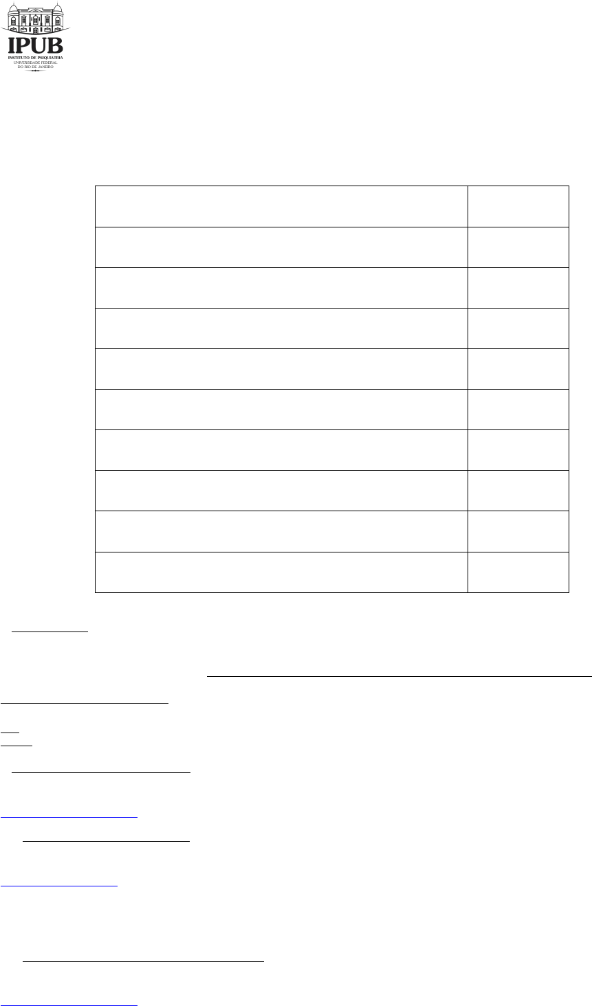 Instituto de Psiquiatria Universidade Federal do Rio de Janeiro Divisão de Ensino – Secretaria Acadêmica CNPJ Nº 33.663.683/0025-93 1 SELEÇÃO - 2022 CURSO DE ESPECIALIZAÇÃO EM PSIQUIATRIA RESULTADO DO RECURSO DA PROVA ESCRITA NOME EM ORDEM ALFABÉTICA PROVA ESCRITA 1. Ana Paula Gomes 8,00 2. Arlindo Marques Ferreira Junior 9,50 3. Aylla Meira Lima 9,00 4. Clara Aline de Oliveira Marinho 7,50 5. Filipe Paiva Rodrigues 7,00 6. Glauber França Henriques de Carvalho 9,50 7. Matheus Dias Coite 8,00 8. Naian Acá Oliveira Mathias 7,50 9. Rodrigo Netto Armando Rangel 7,00 8. DA PROVA ORAL O encontro para os candidatos ao curso, que realizarão a prova oral com a banca examinadora, será presencial e gravado no formato de audio, sem cortes, devidamente aferido pela UFRJ, quanto à idoneidade e confiabilidade. Previamente à gravação, o candidato deverá assinar e enviar, um termo de ciência e concordância de gravação. No caso de recusa da gravação pelo candidato, o mesmo assinará um termo de recusa. DATA DA PROVA ORAL - PRESENCIAL DIA: 22 de julho de 2022 – sexta-feira . Segue abaixo a tabela com a distribuição de horário. LOCAL: Auditório Icema Oliveira 9. DATA DO RESULTADO DA PROVA ORAL O resultado da prova oral será divulgado no 25/07/2022, após às 16:00 horas, no site do Instituto de Psiquiatria da UFRJ - www.ipub.ufrj.br/selecao2022 10.1 DATA DO RECURSO DA PROVA ORAL Os recursos relacionados à prova oral deverão ser enviados por escrito, no dia 26/07/2022, das 09 horas às 12 horas, para o e-mail cursoespeciz@ipub.ufrj.br, com as seguintes informações: o nome do candidato e a questão a ser contestada e o texto da contestação. Os recursos serão julgados tomando-se como referência a gravação no formato de audio, sem cortes, devidamente aferido pela UFRJ. Não serão aceitos recursos apresentados fora deste período. Os recursos serão julgados tomando-se como referência a bibliografia que consta no presente edital. 10.2 DATA DO RESULTADO DO RECURSO DA PROVA ORAL O resultado do recurso da prova oral será divulgado no 27/07/2022, após às 16:00 horas, no site do Instituto de Psiquiatria da UFRJ - www.ipub.ufrj.br/selecao2022. http://www.ipub.ufrj.br/selecao2022 mailto:academica@ipub.ufrj.br, http://www.ipub.ufrj.br Instituto de Psiquiatria Universidade Federal do Rio de Janeiro Divisão de Ensino – Secretaria Acadêmica CNPJ Nº 33.663.683/0025-93 1 DISTRIBUIÇÃO DO HORÁRIO DA PROVA ORAL SELEÇÃO DO CURSO DE ESPECIALIZAÇÃO – 2022 PSIQUIATRIA NOME EM ORDEM DE REALIZAÇÃO HORÁRIO DA PROVA 10. Ana Paula Gomes 09:00 11. Arlindo Marques Ferreira Junior 09:15 12. Aylla Meira Lima 09:30 13. Clara Aline de Oliveira Marinho 09:45 14. Filipe Paiva Rodrigues 10:00 15. Glauber França Henriques de Carvalho 10:15 16. Matheus Dias Coite 10:30 17. Naian Acá Oliveira Mathias 10:45 18. Rodrigo Netto Armando Rangel 11:00 HORA DE PROVA Secretaria Acadêmica, 20 de julho de 2022. APLICAÇÃO DA PROVAS - SELEÇÃO 2022 - Prova oral DIA HORÁRIO PROVA SALA 22/07/2022 A PARTIR 09:00 PSIQUIATRIA AUD. ICEMA DE OLIVEIRA
