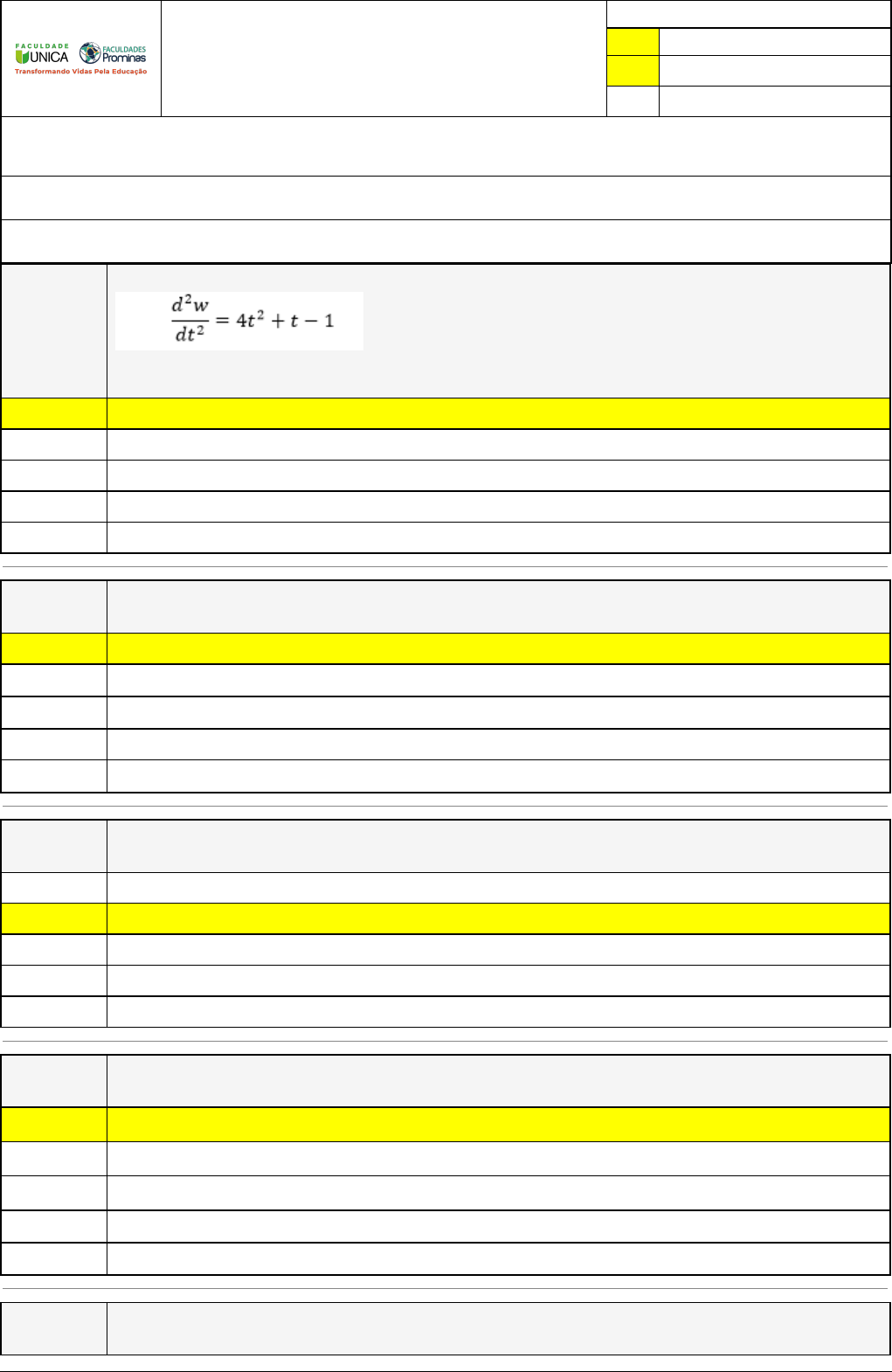 Pincel Atômico - 18/01/2023 16:58:31 1/3 Exercício Caminho do Conhecimento - Etapa 8 (19355) Atividade finalizada em 18/01/2023 13:38:30 (684154 / 2) LEGENDA Resposta correta na questão # Resposta correta - Questão Anulada X Resposta selecionada pelo Aluno Disciplina: PRÁTICA PEDAGÓGICA INTERDISCIPLINAR: EQUAÇÕES DIFERENCIAIS ORDINÁRIAS [789995] - Avaliação com 8 questões, com o peso total de 3,33 pontos [capítulos - 4] Turma: Segunda Graduação: Segunda Graduação 6 meses - Licenciatura em Matemática - Grupo: FPD-FEV2022 - SGegu0A100123 [81529] Aluno(a): 91413296 - SILVANA CRISTINA ELISBON - Respondeu 6 questões corretas, obtendo um total de 2,50 pontos como nota [360347_110774] Questão 001 Veja a expressão abaixo: É uma equação diferencial, pois X possui derivadas representadas na relação. possui integrais representadas na relação. possui zeros representados na relação. possui expoentes inteiros representados na relação. possui raízes representadas na relação. [360347_174107] Questão 002 Das equações abaixo, qual é linear? X y' = 5x+2y y''= 1+(y')2 ey''- xy' + y = 0 y'+ 2xy =cosy x2 yy'- 2xy2 = 0 [360347_174100] Questão 003 A equação y= C1 sen x+C2 cosâ•¡x é uma solução de qual EDO? y'''+ 3y=0 X y''+ y=0 y''+ 2y=0 y'''=0 y'+ y=0 [360347_174103] Questão 004 Qual função abaixo é solução da EDO y''- 3y' + 2y= 0 ? X y= c1 e x + c2 e 2x y=c1 e x y=c2 e 2x y=e2x y= ex [360347_174094] Questão 005 Das equações, qual não é linear? Pincel Atômico - 18/01/2023 16:58:31 2/3 (y'')3 + 2yy' -1= 0 y'=5x + 2y y'''- 3y''+ 2y'- 4y = 2e3x X y' + 2y = cosâ•¡x y(5)-6y(4) +10y'''+ 6y = 0 [360349_110783] Questão 006 Analise a imagem abaixo: Fonte: SILVA, C. B. C; FAGUNDES, B. B; RIBEIRO, J. D.; TONEL, A. P. Forças no sistema de referência acelerado de um pêndulo: estudo teórico e resultados experimentais. Rev. Bras. Ensino Fís. vol.42 São Paulo 2020 Epub Nov 25, 2019. https://doi.org/10.1590/1806-9126-rbef-2019-0085. De acordo com interpretação da imagem, avalie as afirmativas abaixo: I. O movimento realizado pelo balanço e o menino pode ser representado por uma equação diferencial. II. As variáveis que podem ser utilizadas para modelar o movimento do balanço estão restritas unicamente a este. III. Todo movimento igual ao do balanço pode ser expresso por uma equação diferencial de ordem n. É correto o que se afirma em: II e III, apenas. II, apenas. I, II e III. III, apenas. X I, apenas. Pincel Atômico - 18/01/2023 16:58:31 3/3 [360348_110781] Questão 007 Analise a equação diferencial a seguir: f'(t) = a.sen(t+b) De acordo com a expressão acima, avalie as afirmativas abaixo: I. A equação indicada na expressão é do primeiro grau, pois possui expoente 1 na derivada. II. A equação indicada pode representar um modelo físico, uma vez que descreve a taxa de variação de uma variável em relação a outra. III. A equação diferencial indicada possui uma solução geral, a qual pode ser obtida pela integração da mesma. É correto o que se afirma em: X I, II e III. II, apenas. I, apenas. III, apenas. II e III, apenas. [360347_174105] Questão 008 Qual o grau da equação não linear (y'')3 + 2yy' - 1= 0? 3 6 X 2 1 5