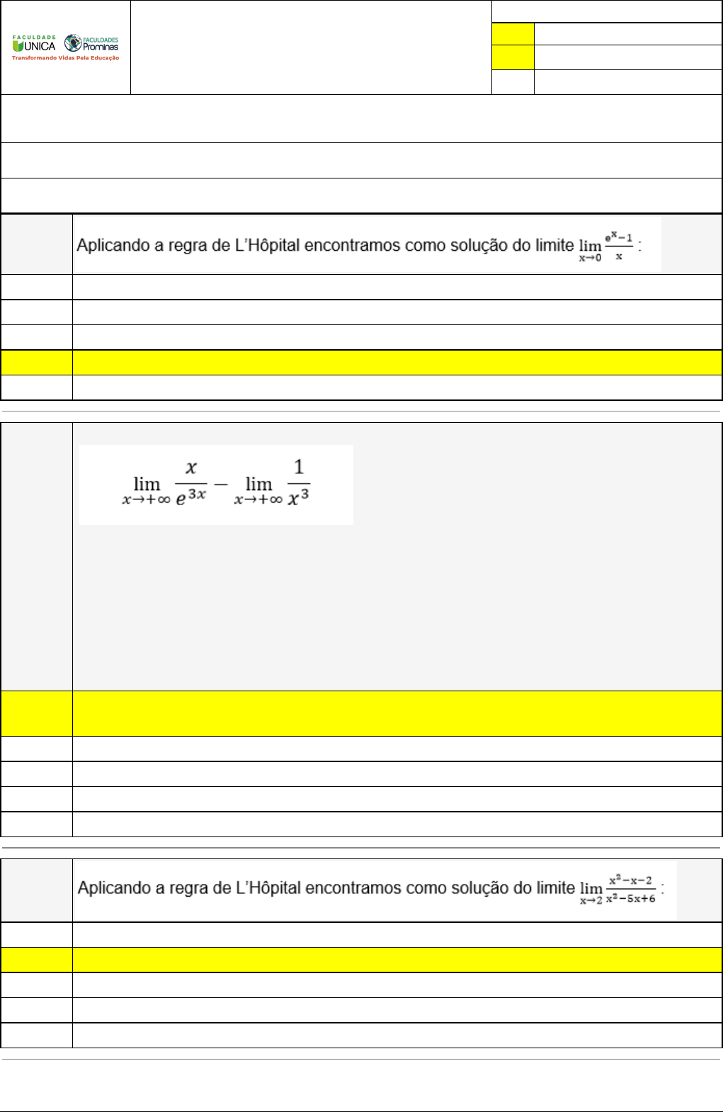 Pincel Atômico - 18/01/2023 17:00:00 1/3 Exercício Caminho do Conhecimento - Etapa 4 (19353) Atividade finalizada em 18/01/2023 12:14:40 (684152 / 1) LEGENDA Resposta correta na questão # Resposta correta - Questão Anulada X Resposta selecionada pelo Aluno Disciplina: PRÁTICA PEDAGÓGICA INTERDISCIPLINAR: EQUAÇÕES DIFERENCIAIS ORDINÁRIAS [789995] - Avaliação com 8 questões, com o peso total de 3,33 pontos [capítulos - 2] Turma: Segunda Graduação: Segunda Graduação 6 meses - Licenciatura em Matemática - Grupo: FPD-FEV2022 - SGegu0A100123 [81529] Aluno(a): 91413296 - SILVANA CRISTINA ELISBON - Respondeu 5 questões corretas, obtendo um total de 2,08 pontos como nota [360347_1740 99] Questão 001 -2 3 2 -1 X 1 [360347_1107 39] Questão 002 Analise a situação abaixo: Considerando a situação apresentada, avalie a seguintes asserções e a relação proposta entre elas. I. A soma dos limites da situação será 0. PORQUE II. O primeiro limite resultará em uma indefinição, sendo necessária a regra de L’Hôpital. Já o segundo converge para 0 na medida em que x aumenta seu valor para infinito. A respeito destas asserções, assinale a opção correta. X As asserções I e II são proposições verdadeiras, e a II eÌ• uma justificativa da I. As asserções I e II são proposições falsas. As asserções I e II são proposições verdadeiras, mas a II não é uma justificativa da I. A asserção I é uma proposição falsa e, a II é uma proposição verdadeira. A asserção I é uma proposição verdadeira e, a II é uma proposição falsa. [360347_1741 01] Questão 003 -1 X -3 0 -2 -4 Pincel Atômico - 18/01/2023 17:00:00 2/3 [360347_1741 08] Questão 004 2 4 5 X 1 3 [360347_1741 02] Questão 005 2/3 4/3 X 2 1 1/3 [360348_1107 41] Questão 006 Veja o limite abaixo: Calculando-o, chega-se em: 6 0 5 -∞ X +∞ [360347_1741 04] Questão 007 4 X 1 3 2 0 [360349_1107 43] Questão 008 Sobre os limites no infinito foram feitas três afirmações: I. Todo limite no infinito pode ser calculado mediante a substituição direta da variável pelo extremo do intervalo superior. II. Quando no limite resultar uma indeterminação dos tipos 0/0 ou (±∞)/(±∞) deve-se considerar a regra de L’Hôpital. III. Os gráficos dos limites no infinito não contribuem para modelos matemáticos de situações reais. É correto o que se afirma em: Pincel Atômico - 18/01/2023 17:00:00 3/3 I e II, apenas. III, apenas. I, apenas. II e III, apenas. X II, apenas.