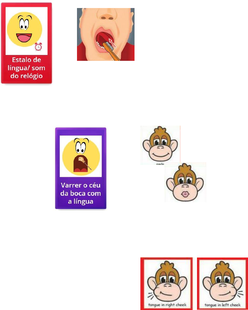 EXERCÍCIOS PARA FORTALECER A LÍNGUA ➔ Escovar a língua com a escova de dente (sem pasta de dente), no sentido da frente para trás. 5 vezes cada lado —------------------------------------------------------------------------------------------------------------------ ➔ Passar doce no Fazer bico e céu da boca: ajuda sorriso com o para que ele saiba canudo entre os onde passar a dentes língua. —------------------------------------------------------------------------------------------------------------------ ➔ Empurrar a bochecha com a língua por dentro da boca (fazer nas duas bochechas). —------------------------------------------------------------------------------------------------------------------ ➔ Treine a língua do sapo (larga/relaxada) e da cobra (fina/contraída): com a ponta da língua para fora da boca deixe ela larga (sapo), depois faça força para deixá-la fina (cobra). Repita esse movimento 10 vezes. ➔ Para treinar a força de língua: posicione a espátula na ponta da língua sem tirar ela para fora da boca e empurre contra ela, faça força com a língua e segure por 8 segundos, descanse e repita 8 vezes