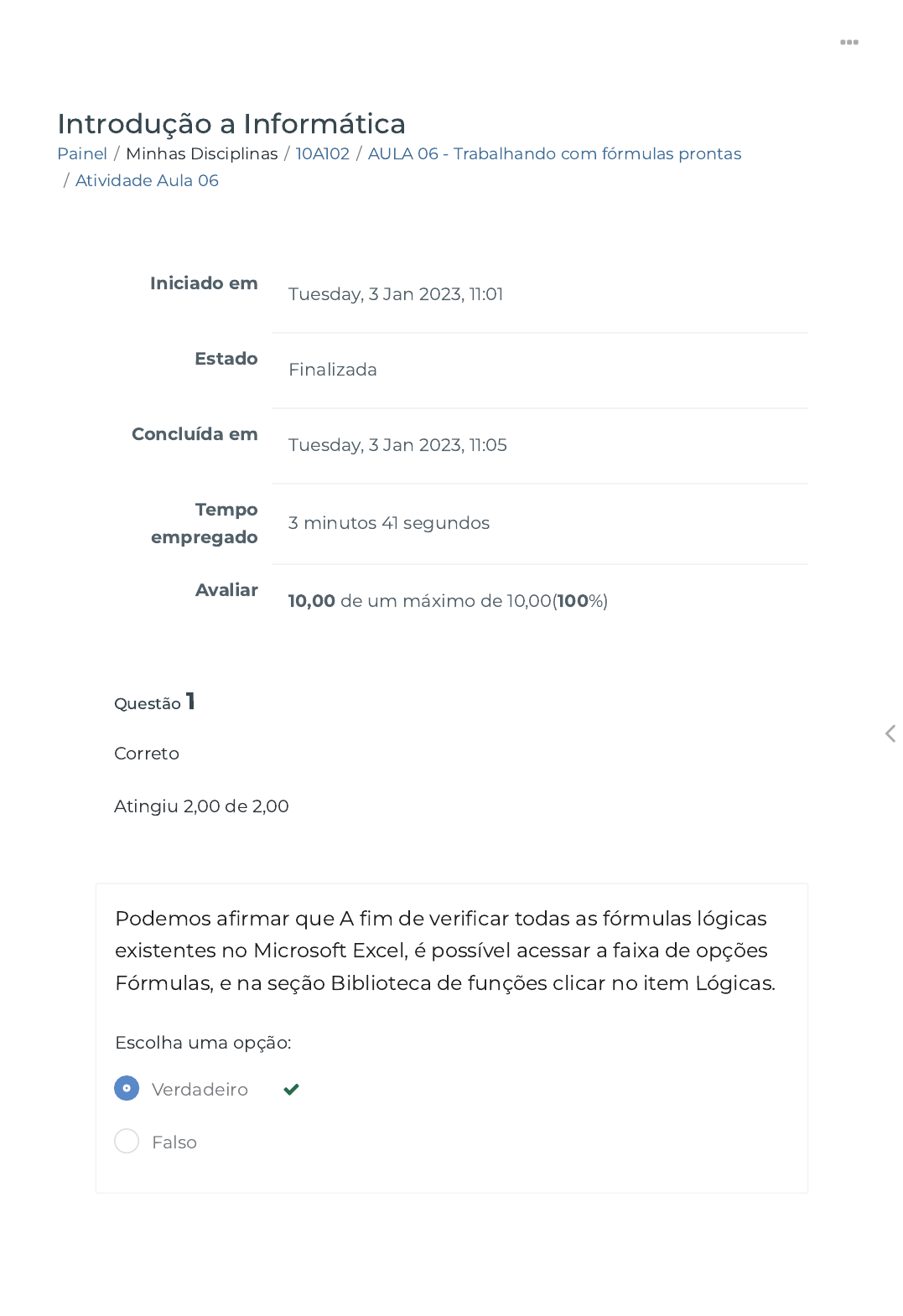 20/01/2023 15:58 Atividade Aula 06 https://ava.politecnicabr.com.br/mod/quiz/review.php?attempt=4135461 1/5 Painel / Minhas Disciplinas / 10A102 / AULA 06 - Trabalhando com fórmulas prontas / Atividade Aula 06 Introdução a Informática Iniciado em Tuesday, 3 Jan 2023, 11:01 Estado Finalizada Concluída em Tuesday, 3 Jan 2023, 11:05 Tempo empregado 3 minutos 41 segundos Avaliar 10,00 de um máximo de 10,00(100%) Questão 1 Correto Atingiu 2,00 de 2,00 Podemos a�rmar que A �m de veri�car todas as fórmulas lógicas existentes no Microsoft Excel, é possível acessar a faixa de opções Fórmulas, e na seção Biblioteca de funções clicar no item Lógicas. Escolha uma opção: Verdadeiro Falso https://ava.politecnicabr.com.br/my/ https://ava.politecnicabr.com.br/course/view.php?id=829 https://ava.politecnicabr.com.br/course/view.php?id=829#section-22 https://ava.politecnicabr.com.br/mod/quiz/view.php?id=38314 https://ava.politecnicabr.com.br/ 20/01/2023 15:58 Atividade Aula 06 https://ava.politecnicabr.com.br/mod/quiz/review.php?attempt=4135461 2/5 Questão 2 Correto Atingiu 2,00 de 2,00 Tratando-se de Segmentação de textos no Excel podemos a�rmar que é possível capturar partes de um texto de acordo com a necessidade, segmentando o seu início, meio ou �m. Escolha uma opção: Questão 3 Correto Atingiu 2,00 de 2,00 Podemos a�rmar que as funções de data e hora são, como o próprio nome sugere, aplicados sobre valores de data. Escolha uma opção: Verdadeiro Falso Verdadeiro Falso https://ava.politecnicabr.com.br/ 20/01/2023 15:58 Atividade Aula 06 https://ava.politecnicabr.com.br/mod/quiz/review.php?attempt=4135461 3/5 Questão 4 Correto Atingiu 2,00 de 2,00 Podemos a�rmar que a �m de solucionar o problema suscitado no exemplo anterior, é possível criar tabelas de valores de referência, e usar funções de pesquisa para localizar e retornar valores. Os Exemplos desse tipo de função são PROCV e PROCH. Escolha uma opção: Verdadeiro Falso https://ava.politecnicabr.com.br/ 20/01/2023 15:58 Atividade Aula 06 https://ava.politecnicabr.com.br/mod/quiz/review.php?attempt=4135461 4/5 Questão 5 Correto Atingiu 2,00 de 2,00 Tratando-se de Fórmulas matemáticas no Excel julgue as a�rmativas a seguir. ( ) Pensando que no trato de planilhas eletrônicas os cálculos matemáticos têm grande importância, as fórmulas matemáticas possuem uma categoria exclusiva, denominada matemática e trigonometria. ( ) O que é fundamental aprender, em termos de fórmulas prontas no Microsoft Excel, é o funcionamento global da aplicação de fórmulas. ( ) Para fazer uso de fórmulas prontas, os de referências relativas e absolutas, bem como os conceitos de copiar e arrastar, continuam valendo. Escolha uma opção: a. F, F, V b. V, V, V c. V, F, V d. V, F, F e. F, V, V Entre em Contato Links Úteis Dicas da nossa Diretora Acadêmica https://soundcloud.com/user-501638417/sets/escola-politecnica-brasileira https://ava.politecnicabr.com.br/ 20/01/2023 15:58 Atividade Aula 06 https://ava.politecnicabr.com.br/mod/quiz/review.php?attempt=4135461 5/5 © 2022 - Escola Politécnica Brasileira https://www.politecnicabr.com.br 0800 084 2627 0800 084 2627 Planner de Estudos Declaração de Matrícula Orientações do AVA Abertura de Ticket Fale com o Tutor Cronograma de Estudos Manual de Estágio Manual de Competência Siga-nos nas redes sociais https://ava.politecnicabr.com.br/mod/quiz/0 https://www.politecnicabr.com.br/ https://storage.googleapis.com/sirius-pubstore/semestre_plannerdeestudo%20poli.pdf https://storage.googleapis.com/sirius-pubstore/declaracao_matricula.pdf https://storage.googleapis.com/sirius-pubstore/orientacoes_ava.pdf https://storage.googleapis.com/sirius-pubstore/abertura_ticket.pdf https://storage.googleapis.com/sirius-pubstore/fale_com_tutor.pdf https://storage.googleapis.com/sirius-pubstore/cronograma_estudos.pdf https://storage.googleapis.com/sirius-pubstore/manual_estagio.pdf https://storage.googleapis.com/sirius-pubstore/manual_competencia.pdf https://www.facebook.com/politecnicabr https://www.instagram.com/politecnicabr_oficial https://ava.politecnicabr.com.br/