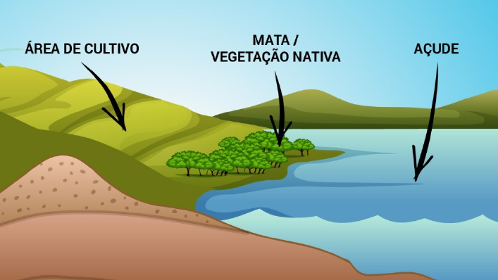 Desafio Você é um engenheiro agrônomo e foi contratado por um produtor rural que pretende iniciar uma grande plantação em uma área que tem as seguintes características: - é suavemente ondulada, estando mesmo assim inclinada; - a inclinação desta área faz com que a parte mais baixa esteja na direção de um grande açude de onde o produtor pretende tirar água para irrigação e criar peixes da espécie da tilápia; - o solo é relativamente pouco permeável, dificultando a entrada de água para o subsolo, mas que pode ser desagregado facilmente com a ação da água; - há uma faixa de vegetação mais densa ao redor do açude (mata ciliar); A figura a seguir ilustra esta área: Você deve indicar os riscos maiores para a plantação e para o açude, considerando ainda a seguinte informação: o sabor da carne de tilápia é negativamente afetado se a água é muito barrenta (cheia de sedimentos). Faça essa indicação e também indique ações de mitigação ou redução destes riscos, tendo como base: - o comportamento da água da chuva após atingir o solo; - a permeabilidade do solo e a sua resistência a desagregação; - o transporte de sedimentos e seus efeitos ao atingir corpos de água; -o efeito da cobertura vegetal; - os procedimentos usados para lidar com problemas de solo; Padrão de resposta esperado O solo, por ser relativamente impermeável, impede a entrada imediata de água para o subsolo, que assim escoa pela superfície (escoamento superficial). Quanto mais água escoa pela superfície, maiores as possibilidades de transportar solo, já que o solo na região tem a tendência de desagregar. Portanto, durante o plantio, com a exposição do solo às chuvas, pode haver a retirada do solo pelo escoamento superficial. Esse fenômeno pode causar a formação de buracos (voçorocas) assim como retirar o material mais fértil. Além disso, o escoamento superficial irá transportar o material retirado até o açude, depositando ali o solo retirado (sedimento) e com isso, progressivamente, reduzindo o volume do açude e, portanto reduzindo o volume de água disponível. O sedimento nas águas pode afetar a vida ali existente, especialmente os peixes como a tilápia, que pode ter o sabor de sua carne afetada pela presença de sedimentos na água. As ações para evitar tais problemas são: - realizar cultivo em curva de nível; - manter a mata ciliar, pois ela ajuda a deter os sedimentos antes de chegar ao açude; - usar métodos de aragem do solo que possam reduzir o risco de transporte dos solo pelas enxurradas.