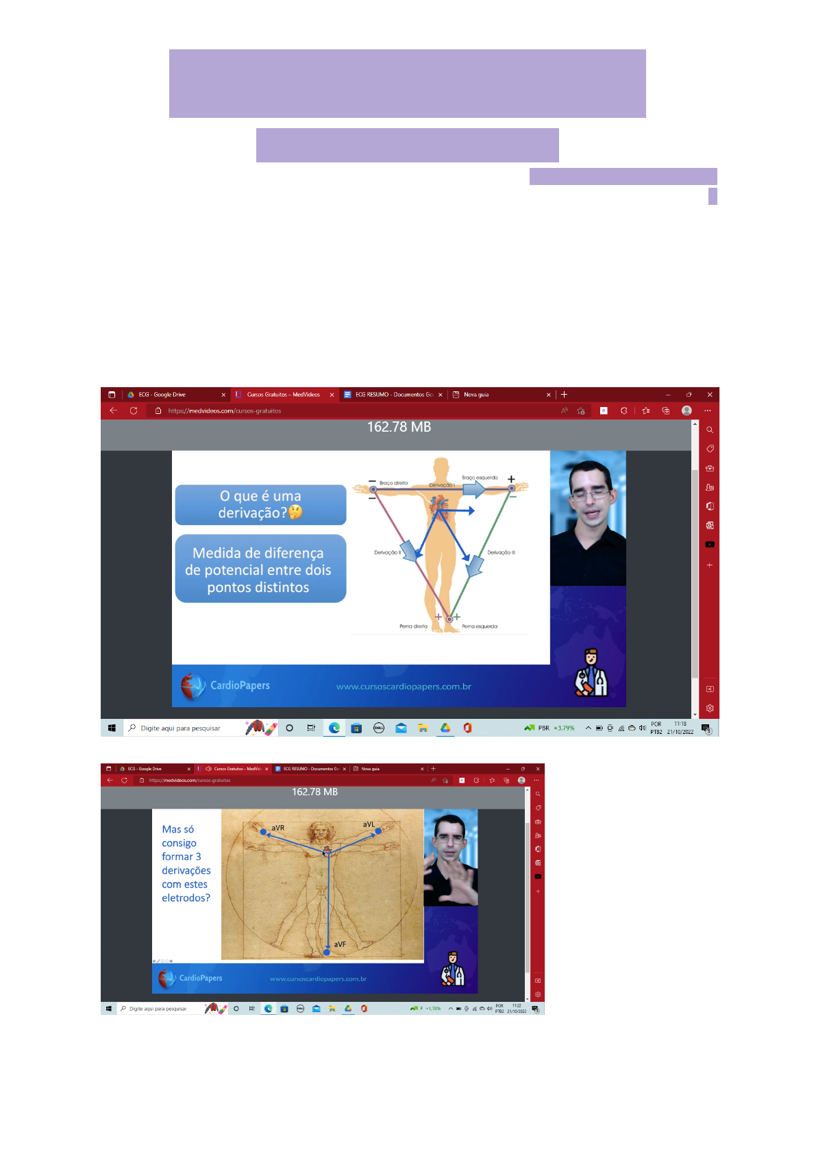 Resumo Eletrocardiograma Ana Silvia Caldas Ferreira Liss 1 ECG- Ana Silvia C. F. Liss 1 COMO COLOCAR ELETRODOS NO PACIENTE Lado DIREITO: Vermelho braço, Preto pé (terra) Lado ESQUERDO: Amarelo braço, Verde pé Derivações periféricas: Localização de estímulos no plano frontal 2 ECG - Ana Silvia C. F. Liss Derivações precordiais / do plano horizontal D1 e D2 e AVR positivo: eixo fisiológico Normal de V1: QRS NEGATIVO Cada quadrinho do ECG de 1mm equivale a 1mv. Cada quadrinho 4mm/s. Velocidade normal: 25mm/s Voltagem normal: N=10mm/mv 2N= 20mm/ mv N/2= 5mm/mv 3 ECG - Ana Silvia C. F. Liss Definição de Ritmo sinusal: - Onda P positiva em D1 e AVF - Onda P de mesma morfologia - Uma onda P para cada QRS - FC entre 50 e 100 em adultos Contagem da frequência cardíaca 1 min = 1500 quadrinhos conta o intervalo entre dois R. 1500/X que é o número de quadrinhos entre esse intervalo SOBRECARGA DE ÁTRIO DIREITO Onda P: despolarização dos átrios Normalidade de 2,5mm de altura Dilatação pode causar aumento da onnda P ONDA P PONTUDA/ALONGADA/ MAIOR QUE 2,5mm EM D2 D3 E AVF SOBRECARGA DE ÁTRIO ESQUERDO Normalidade: onda p até 2/2,5 quadrinhos de largura Onda P com uma valeta no meio ou onda P com 3 quadrinhos ou mais Em V1 a onda P tem que ter 1 quadrinho de altura e largura Índice de morris em V1: Onda P com mais de 1mm de área Sobrecarga biatrial: onda P larga e pontuda! BLOQUEIO ATRIOVENTRICULAR Intervalo PR maior que 200ms em todos os batimentos/mais 5 quadrinhos: bloqueio de primeiro grau 1º Grau = PR > 200 mseg (5 mm); 2º Grau Mobitz I: aumento progressivo de PR até onda P bloqueada; 2º Grau Mobitz II: PR estável com onda P bloqueada subitamente; 2:1: uma onda P conduzida e outra bloqueada; 4 ECG - Ana Silvia C. F. Liss Alto Grau ou Avançado: algumas conduzidas e várias bloqueadas; 3º Grau: dissociação entre ritmo atrial e ventricular SOBRECARGA DE VENTRÍCULO ESQUERDO Sokolov-lyon: R V5 ou V6 + S V1 > 35mm Onda R AVL > 10mm Cornell: R AVL + S V3 Homens: 28 Mulher:20 (onda S grande em v3 mt sugestivo de sbv PADRÃO STREAM: Segmento ST para baixo, onda T invertida e assimétrica 5 ECG - Ana Silvia C. F. Liss SOBRECARGA DE VENTRÍCULO DIREITO ● Índice de Sokolow-Lyon para HVD: R de V1 + S de V5 ou V6 > ou = 11mm ● Índice de Cabrera: R de V1 / R + S de V1 > 0,5 Onda R de grande amplitude em V1 – Desvio do eixo para direita (> +90º em adultos e > +110º em crianças) – Desvio do eixo para frente (QRS positivo em V1) – Ondas S em V5 / V6 ≥ 7mm – Alterações de repolarização – strain de VD BLOQUEIO DE RAMO ESQUERDO QRS MAIOR QUE 120 MS= BLOQUEIO DE RAMO, QLQ UM DELES! cada quadrinho é 40ms TORRE EM V5 V6 AVL BLOQUEIO DE RAMO DIREITO R grande em V1 ORELHA DE COELHO EM V1 ou v2 padrao rsR 6 ECG - Ana Silvia C. F. Liss 7 ECG - Ana Silvia C. F. Liss SUPRA ST Traçando uma linha imaginária do fim da onda P, passando reto ate o R. O segmento ST precisa estar reto nessa linha. Se estiver acima é supra st, se estiver abaixo é infra st (quando a arteria esta semi ocluida). COMO DAR DIAGNÓSTICO DE IAM COM SUPRA: Duas derivações próximas com supra. ex: D2 D3 AVF, D1 AVL 8 ECG - Ana Silvia C. F. Liss 9 ECG - Ana Silvia C. F. Liss FASES DO IAM COM SUPRA 10 ECG - Ana Silvia C. F. Liss Sempre que tem suspeita de infarto de parede inferior, solicitar v3r v4r (infarto de ventriculo direito) supra em d2 d3 e avf 11 ECG - Ana Silvia C. F. Liss infarto posterior Pode nao ter supra de st.. clinica paciente com dor mas sem supra solicitar v7 v8 e v9 para analisar se posterior associado 12 ECG - Ana Silvia C. F. Liss ULTIMA AULA + REVISÃO Arritmia FLUTTER E FIBRILAÇÃO ATRIAL O flutter atrial e a fibrilação atrial (FA) são duas arritmias comuns na prática clínica. Há varias dicas para diferenciá-las. Uma delas a presença de ondas F (maiúscul0) no flutter e a presença de ondas f (minúsculo) na FA. Ambas refletem a despolarização atrial. No flutter, normalmente o circuito da arritmia está localizado no átrio direito e se dá por um mecanismo de macroreentrada. No final das contas isto faz com que os átrios sejam despolarizados sempre com a mesma frequência e pela mesma via. O resultado eletrocardiográfico será a presença de ondas F sempre de mesma morfologia e com intervalo regular entre elas. Já na FA a despolarização atrial ocorre de forma caótica, através de inúmeros focos diferentes de microreentrada localizados no átrio esquerdo. Isto irá gerar ondas f que possuem morfologias diferentes (já que cada uma surge de locais distintos) e com intervalo irregular. 13 ECG - Ana Silvia C. F. Liss Flutter: ausencia de ondas p, ritmo normalmente regular. Olhar principalmente d2 d3 e avf (parede inferior) pois é o melhor lugar para observar. Taquicardia de QRS estreito + FC 150= sempre pensar em flutter Wolff-Parkinson-White 14 ECG - Ana Silvia C. F. Liss Síndrome é um conjunto de sinais e sintomas; para o diagnóstico da síndrome de WPW devemos ter os sintomas relacionados aos episódios de taquiarritmias como palpitações, síncopes, pré-síncope, associados a alterações específicas no ECG. sem sintomas nao é sindrome, apenas uma alteração anatomica Quando são encontradas as 4 alterações características descritas abaixo no eletrocardiograma, chamamos de WPW manifesto: 1- PR curto (menor que 100 milissegundos) 2- Onda delta (Onda Delta: é uma deflexão ascendente e lenta da porção inicial do complexo QRS 3- QRS alargado 4- Alteração de repolarização ventricular VIA ACESSORIA: O IMPULSO sai do no sinusal e nao passa pelo no atrioventricular DIRETO PARA O VENTRICULO, COMO UMA VIA ACESSORIA DE PASSAGEM DO IIMPULSO nunca usa beta em wolf: amiodarona opção.. os que terminam cm ol nao (propanolol) TAQUICARDIA CM QRS ESTREITO <120MS, É SUPRAVENTRICULAR VENTRICULAR: QRS LARGO. RITMO 300. criterios para taquicardia ventricular: brugada e esses outros dois. qrs totalmente positivo ou totalmente negativo nas precordiais Ver
