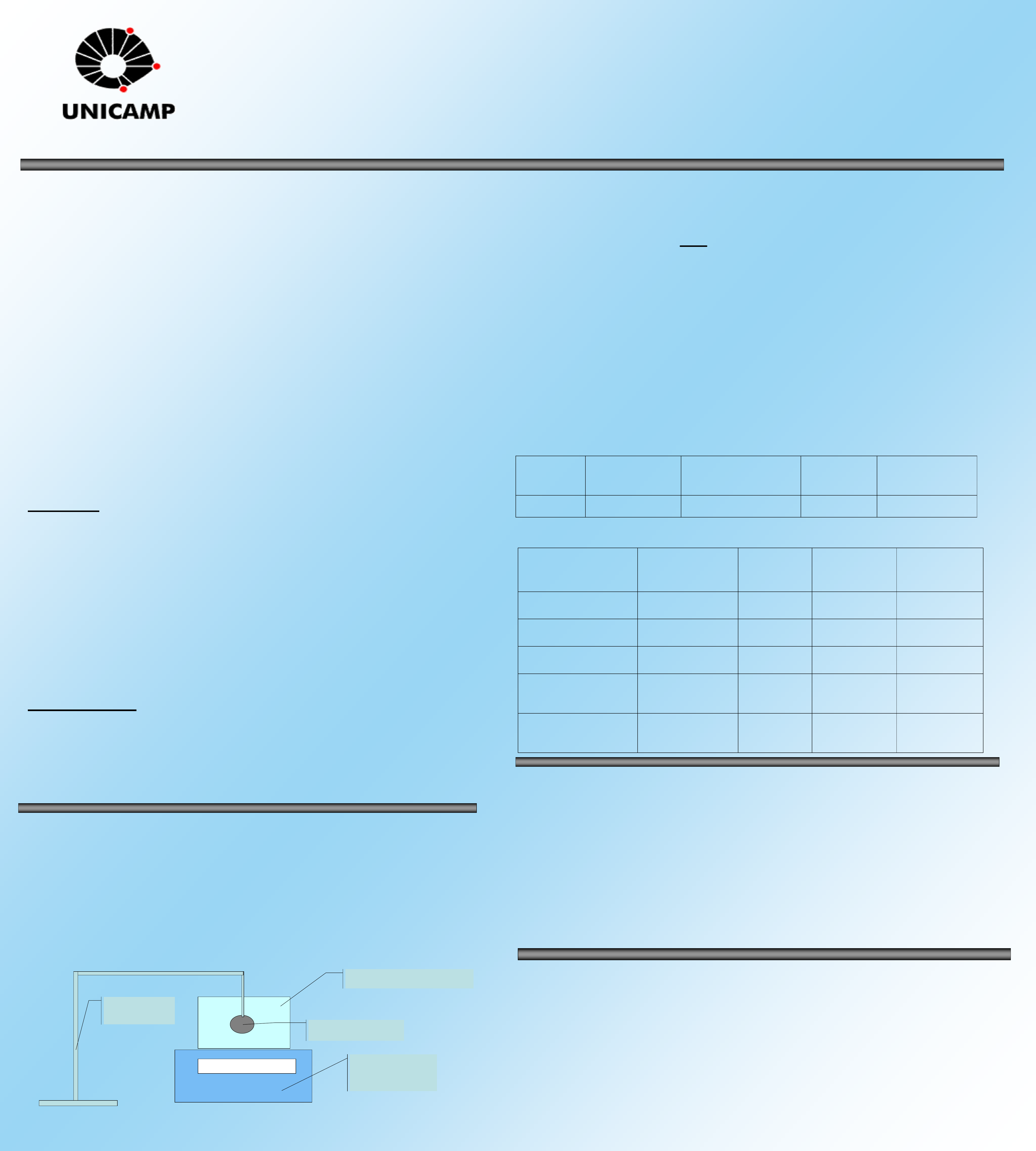 MEDIDOR DE DENSIDADE DE POLMEDIDOR DE DENSIDADE DE POLÍÍMEROSMEROS Erickson Tadashi Hatanaka (erickhatanaka@gmail.com) Prof. João Sinézio C. Campos (sinezio@feq.unicamp.br) Dep. Tecnologia de Polímeros – FEQ – UNICAMP Palavras-chave: Materiais – Polímeros - Densidade 1. Introdu1. Introduççãoão Em todas as áreas de aplicações, os materiais poliméricos, comumente conhecidos como plásticos, vêm ganhando espaço em substituição aos materiais tradicionais (metálicos, madeira e vidro). Neste sentido uma ampla gama de equipamentos tem sido desenvolvida no sentido de auxiliar na caracterização elétrica e mecânica, elucidando assim suas diversas aplicações. Neste trabalho montou-se a técnica da balança hidrostática para medida de densidade de polímeros, utilizando-se uma balança analítica. O procedimento básico é suspender o corpo de prova (amostra) e mergulhá-lo em um líquido de densidade conhecida, o qual colocado sobre uma balança analítica, quantifica-se a força de empuxo resultante. Por meio de equações matemáticas (física básica) obtêm- se os valores de densidades de materiais. Objetivos: -Quantificar a densidade de materiais poliméricos; -Auxiliar no desenvolvimento de alunos em iniciação científica; -Auxiliar medidas de densidade em trabalhos científicos e industriais; -Disponibilizar uma técnica simples de medidas de densidade de materiais; -Auxiliar na formação de pessoal qualificado em ciências; -Dar apoio em linhas de pesquisas envolvendo medidas de densidade. AgradecimentosAgradecimentos Ao CNPq/PIBIC/UNICAMP pela bolsa concedida. 5. Referência Bibliogr5. Referência Bibliográáficasficas Blass, Arno; Processamento de polímeros; Florianópolis: Ed. Da UFSC, 1985; Sears, F.; Zemansky M. W.; Física Vol. 1; Rio de Janeiro, 1973- Traduzido pelo professor José de Lima Accioli; Norton, L. Robert; Machine Design – An integrated Approach, Second Edition, Worcester Polytechnic Institute. 2000. 2. Metodologia2. Metodologia A montagem do sistema é esquematizada na figura 2.1, onde se pode observar a balança analítica, contendo sobre ela um béquer e um suporte onde se coloca a amostra do material, e posteriormente esta é mergulhado no líquido contido no béquer. Ressalta-se que qualquer líquido de interesse pode ser utilizado. Utilizou-se também várias amostras de materiais poliméricos, juntamente com um amostra metálica, de Latão, cuja densidade é muito bem definida. 3. Resultados e Discussões3. Resultados e Discussões (1) A equação acima é a equação utilizada no presente trabalho, onde A é o peso da amostra, E é o empuxo da mesma, ρH2O é a densidade da água e D por sua vez é a densidade da amostra. No sentido de testar o método dado pelo dispositivo aqui montado e da equação desenvolvida para cálculo da densidade de materiais uma amostra de Latão foi utilizada para calibração. A medida de densidade se mostra bastante simples, sendo todos os fatores presentes na equação (1) de fácil obtenção. Justificativas: Equipamento simples e de fácil instalação; Plásticos são de fundamental importância no contexto atual; Caracterização de materiais; 4. Conclusões4. Conclusões Com base nos ensaios experimentais realizados, conclui-se que: -O medidor proposto é um bom aparelho para medição de densidades de compostos poliméricos; -O dispositivo proposto medidas de densidade é confiável e apresenta boa precisão (5%); -A equação matemática desenvolvida satisfaz as condições experimentais; -O dispositivo é de fácil montagem e manuseio. Fig.2.1-Diagrama ilustrativo do aparato experimental. Tabela 2 – Resultados experimentais utilizando materiais poliméricos Balança Analítica Béquer+Líquido Amostra OH E AD 2 Tabela 1- Resultados experimentais utilizando o material Latão 0,38,40,99752,924,4 ∆ρ (g/cm3 ) Ρ (g/cm3) ρH2O (g/cm3) Empuxo (g) Massa (g) 1,480,031,461,50 PBT+Fibra de Vidro 1,840,051,811,88 Nylon + Fibra de Vidro 1,3310,0051,3281,335PBT 0,9120,0020,9100,913PP 0,9160,0080,9100,921PE Média Desvio padrão ρ2 (g/cm3)ρ1 (g/cm3)Polímeros Suporte