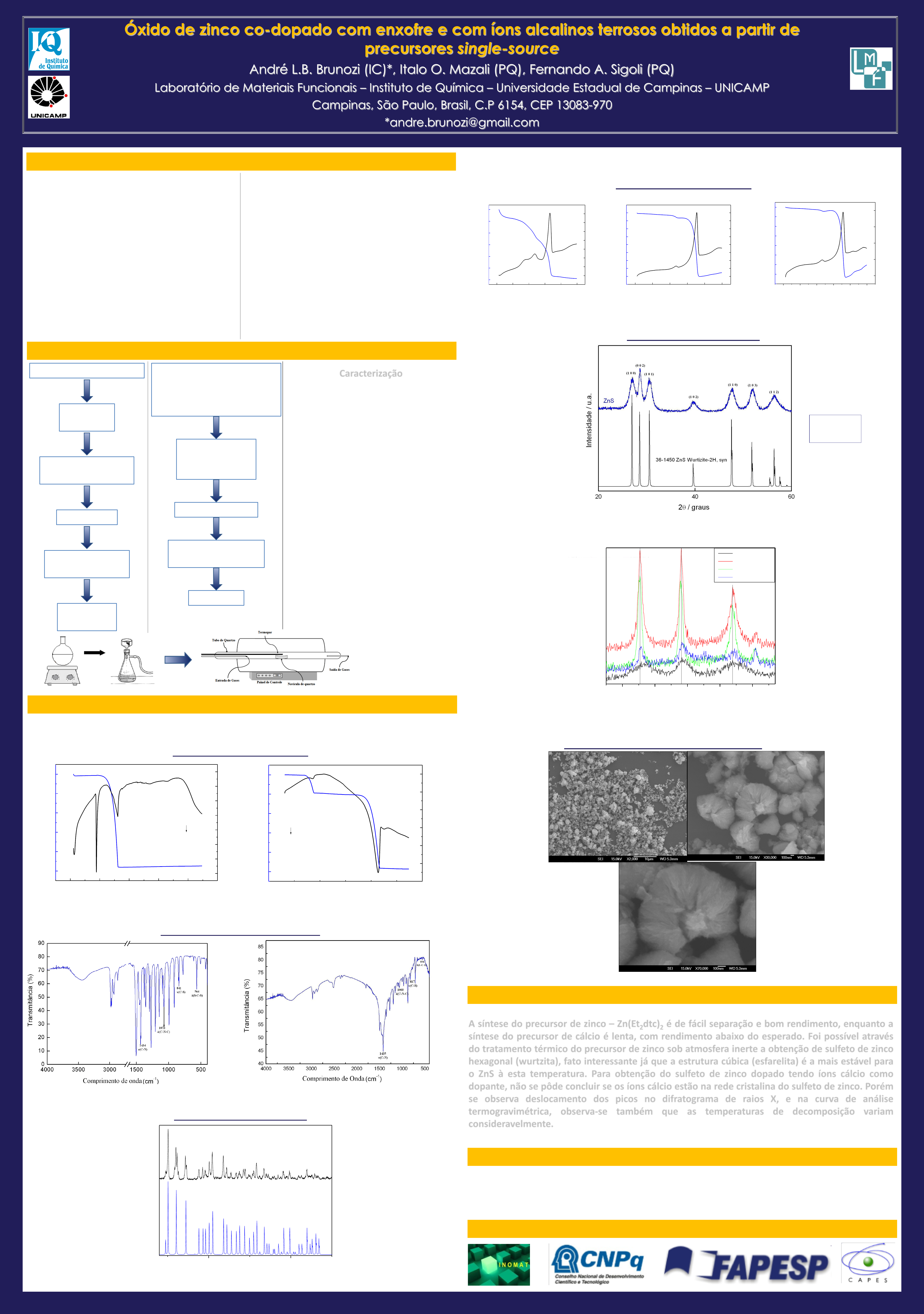 Óxido de zinco co-dopado com enxofre e com íons alcalinos terrosos obtidos a partir de precursores single-source André L.B. Brunozi (IC)*, Italo O. Mazali (PQ), Fernando A. Sigoli (PQ) Laboratório de Materiais Funcionais – Instituto de Química – Universidade Estadual de Campinas – UNICAMP Campinas, São Paulo, Brasil, C.P 6154, CEP 13083-970 *andre.brunozi@gmail.com Introdução Conclusão Procedimento Experimental Resultados e Discussão Referências 1 Pearton, S.J.; Norton, D.P.;IP, K.;Heo,Y.W.; Steiner,T. Recent progress in processing and properties of ZnO. Progress in Materials Science, v. 50, n.3,p.293-340, mar.2005. Agradecimentos Caracterização •Análise Termogravimétrica (TA SDT Q600) • Difração de raios X (Shimatzu XRD-700) •Espectroscopia de infravermelho (FTIR Bomen FTLA 2000) •Microscopia Eletrônica de Varredura (FE-SEM) Na(Et2dtc) (aq) + Zn(Ac)2 (aq) Filtração à vácuo Secagem Dessacador (6h) Zn(Et2dtc)2 Decomposição (325°C, N2, 3h) ZnS (hexagonal) A partir do controle de tamanho e forma das partículas pode-se obter compostos com propriedades químicas e eletrônicas diferenciadas. Neste contexto, o óxido de zinco, um semicondutor intrínseco, voltou a ser o foco de diversas pesquisas, visto que pode ser obtido como nanopartículas com potencial aplicação em campos de óptica não linear, luminescência, eletrônica, catálise, energia solar, dentre outros. O óxido de zinco é não estequiométrico, fato que leva a presença de níveis energéticos intermediários, situados na banda proibida, que facilitam as transições eletrônicas, reforçando a hipótese de que a luminescência do oxido de zinco, seja decorrente do excesso de zinco intersticial, ou vacâncias de oxigênio.1 Dentre os métodos de preparação de semicondutores, destaca-se uma rota sintética para materiais nanoestruturados denominada método do precursor de fonte- única (single-source precursor – SSP ). Estes precursores recebem este nome pois apresentam elementos metálicos e não- metálicos na mesma molécula, e a partir desta se obtém o semicondutor binário de interesse. Precursores – bis(dietilditilcarbamato) de Zinco(II)/Cálcio Análise Termogravimétrica (TG) Figura 1: Análise termogravimétrica da amostra de bis(dietilditiocarbamato) de Zinco(II). Espectroscopia de Infravermelho (IV) Figura 3: Espectro vibracional na região do IV da amostra de bis(dietilditiocarbamato) de zinco(II). Figura 4: Espectro vibracional na região do IV da amostra de bis(dietilditiocarbamato) de cálcio(II). Difratometria de Raios X (DRX) Figura 5: Difratogramas de raios X da amostra de bis(dietilditiocarbamato) de zinco(II). 20 40 Amostra Zn(S 2 CNEt 2 ) 2 - JCPDS 23-1973 In te n s id a d e / u .a . 2 / graus Figura 2: Análise termogravimétrica da amostra de bis(dietilditiocarbamato) de Cálcio(II). 0 200 400 600 800 1000 0 20 40 60 80 100 0 200 400 600 800 1000 -0.8 -0.6 -0.4 -0.2 0.0 0.2 0.4 0.6 322°C 177°C Endo d m /d t (u .a .) M a s s a / % Temperatura / °C 0 200 400 600 800 1000 -50 -40 -30 -20 -10 0 10 754°C 244°C Temperatura / °C d m /d t (u .a .) 50 60 70 80 90 100 Endo M a s s a / % Sulfeto de Zinco (ZnS) Figura 8: : Difratogramas de raios X das amostras de sulfeto de zinco dopadas com 1 mol%, 3 mol%,5% e 10 mol % de íons cálcio. Análise Termogravimétrica (TG) Difratometria de Raios X (DRX) Microscopia Eletrônica de Varredura (FE-SEM) Estrutura Hexagonal 21 22 23 24 25 In te n s id a d e / u .a . 2 / graus ZnS ZnS:Ca 1% ZnS:Ca 5% ZnS:Ca 10% (a) (b) (c) Figura 6: Análises termogravimétricas das amostras de sulfeto de zinco puro (a), e dopado com Ca2+ , 1 mol% (b) e 5 mol% (c) Figura 7: Difratogramas de raios X da amostra de sulfeto de zinco e de seu respectivo padrão (JCPDS: 36-1450) 0 200 400 600 800 1000 70 75 80 85 90 95 100 M a s s a / % Temperatura / °C -20 0 20 40 60 80 100 120 140 160 661°C d m /d t ( V ) 0 200 400 600 800 1000 82 84 86 88 90 92 94 96 98 100 102 M a s s a / % Temperatura / °C -20 0 20 40 60 80 100 120 140 160 180 709°C d m /d t ( V ) 0 200 400 600 800 1000 84 86 88 90 92 94 96 98 100 M a s s a / % Temperatura / °C 0 20 40 60 80715°C d m /d t ( V ) Zn(Et2dtc)2 + (1mol%,5mol% e 10mol%) Ca(Et2dtc)2 em CH2Cl2 Agitação até evaporação do solvente Zn1-x(Et2dtc)2:Cax Decomposição (800°C, N2, 30min) Zn1-xS:Cax A síntese do precursor de zinco – Zn(Et2dtc)2 é de fácil separação e bom rendimento, enquanto a síntese do precursor de cálcio é lenta, com rendimento abaixo do esperado. Foi possível através do tratamento térmico do precursor de zinco sob atmosfera inerte a obtenção de sulfeto de zinco hexagonal (wurtzita), fato interessante já que a estrutura cúbica (esfarelita) é a mais estável para o ZnS à esta temperatura. Para obtenção do sulfeto de zinco dopado tendo íons cálcio como dopante, não se pôde concluir se os íons cálcio estão na rede cristalina do sulfeto de zinco. Porém se observa deslocamento dos picos no difratograma de raios X, e na curva de análise termogravimétrica, observa-se também que as temperaturas de decomposição variam consideravelmente. Figura 9: Micrografias da amostra de sulfeto de zinco não dopado.