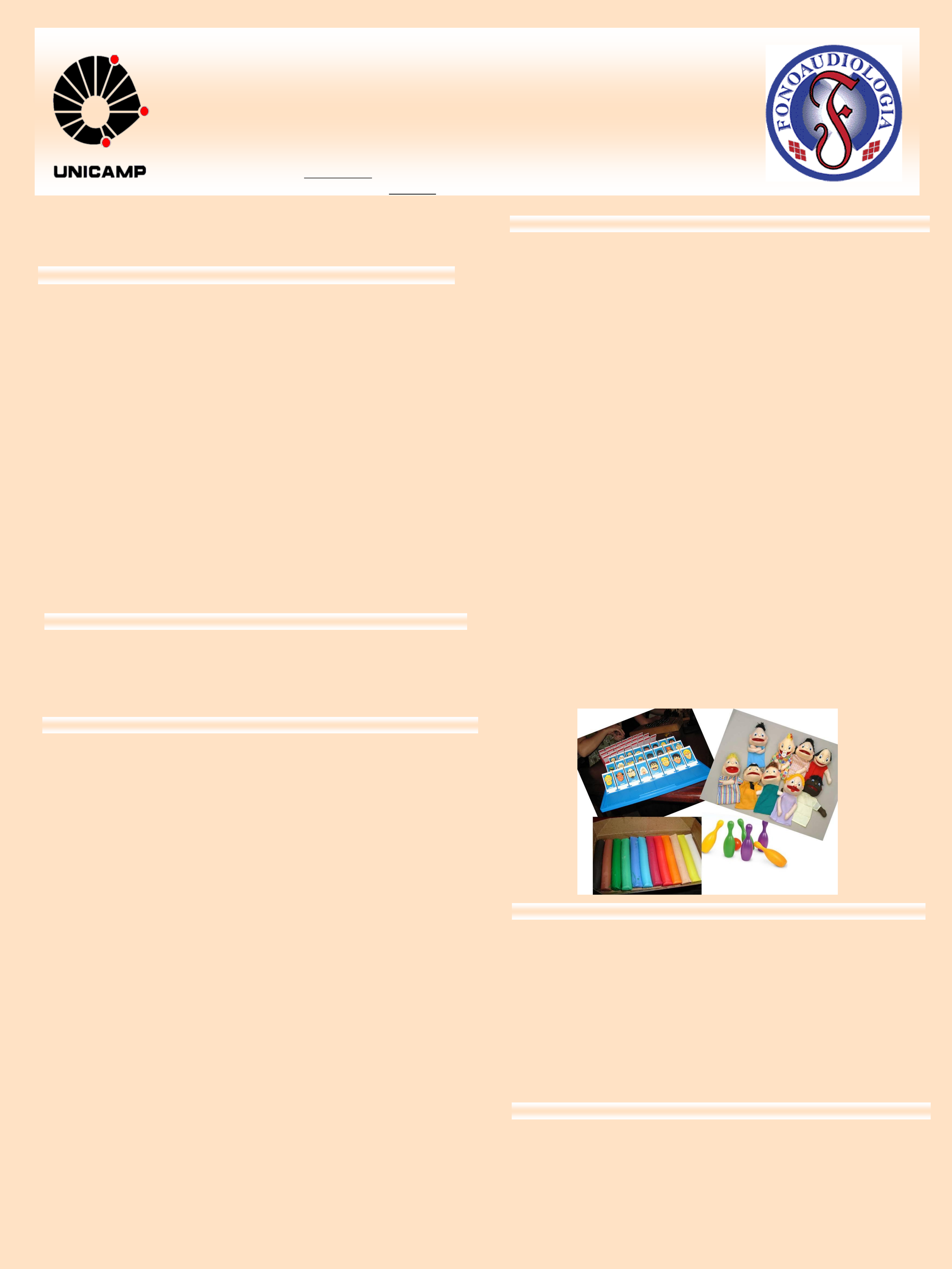 Orientadora: Prof. Dra.Maria Elisabete Rodrigues Freire Gasparetto Bolsista:. Lauriene Franchi Dionísio INTRODUÇÃO O objetivo deste estudo é identificar a percepção de alunos do 4o ano de graduação em fonoaudiologia sobre o uso do brinquedo na terapia fonoaudiológica. CONCLUSÃO REFERÊNCIAS BIBLIOGRÁFICAS OBJETIVO MÉTODO RESULTADOS O desenho deste estudo se caracteriza como pesquisa qualitativa que trabalha com o universo de significados, dos motivos, atitudes, pois o indivíduo se diferencia não só por agir, mas por pensar sobre o que realiza e por interpretar ações a partir da realidade vivida e compartilhada (MINAYO, 2010). Aspectos éticos O projeto foi aprovado pelo Comitê de Ética sob o número 534/2009. Participantes da amostra No ano de 2011, 25 alunos do sexo feminino cursavam o 4o ano do Curso de Graduação em Fonoaudiologia da Faculdade de Ciências Médicas da UNICAMP e estavam inseridos em programas de estágios oferecidos pelo Centro de Estudos e Pesquisas em Reabilitação Prof. Dr. Gabriel Porto da Faculdade de Ciências Médicas da Universidade Estadual de Campinas- Cepre/Fcm/Unicamp. No entanto, somente 16 aceitaram participar da pesquisa e assinaram o Termo de Consentimento Livre e Esclarecido. Coleta de dados Para a coleta de dados foi construído um instrumento com questões semi-estruturadas que foi aplicado por meio de entrevistas. Este instrumento foi desenvolvido por meio da pesquisa exploratória e por meio do pré-teste e foi aplicado a graduandos da Fonoaudiologia que não fizeram parte da amostra final do estudo. Local da coleta de dados As entrevistas foram aplicadas pela pesquisadora no Cepre/Fcm/Unicamp em horários pré- determinados pelos graduandos e cada entrevista teve duração média de 15 minutos. Tratamento das informações Para o tratamento das informações, as entrevistas foram transcritas na íntegra. Análise dos dados Os dados foram analisados e categorizados e os dados discutidos à luz dos recursos teóricos. Considerando que a pesquisa qualitativa lida com sujeitos e sua subjetividade, é possível compreender que o objeto da pesquisa se constitui e é constituído na e pela linguagem. Desse modo, quando se quis compreender além dos significados que os dados apresentaram se fez necessário a utilização da análise de conteúdo. (BARDIN, 2004). Verificou-se nesse estudo, que o brinquedo e as brincadeiras foram utilizados pelos graduandos tanto na avaliação como na realização da terapia fonoaudiológica. A brincadeira é vista pelos alunos como estratégia para entrar no mundo da criança e dessa forma, a terapia vai envolvê-la de forma mais natural possível. Afirmaram também que ao mesmo tempo em que o uso do brinquedo é efetivo ele também é lúdico, visando que o vínculo entre o terapeuta e a criança seja criado e que os objetivos da terapia fonoaudiológica sejam alcançados. O uso do brincar como estratégia de intervenção fonoaudiológica impulsiona o diálogo entre o terapeuta e a criança. E é por meio do diálogo durante o brincar que a criança participa por inteiro, com os olhos e pelo toque das mãos. Desta forma, na formação acadêmica do fonoaudiólogo deve ser contemplada a aquisição de habilidades sobre o tema brinquedos e brincadeiras. Neste sentido, cabe mencionar que o Curso de Graduação em Fonoaudiologia da Unicamp tem trabalhado com essa temática em disciplinas teóricas e práticas e também em oficinas. Agência Financiadora: PIBIC/CNPQ Palavras-Chave: Brinquedo - Terapia Fonoaudiológica - Fonoaudiologia O brinquedo e o brincar são importantes ao desenvolvimento infantil porque é por meio deles que a criança aprende a lidar com diferenças, aprende que todos a sua volta são diferentes e nisso ela tem um maior aprendizado de significados de forma alegre e natural. Dessa forma, há a facilitação de aquisição de conceitos e habilidades, a integração de sentidos, no qual a interação, comunicação e socialização são promovidas (SAMPAIO et al, 2010). O brinquedo permite à criança recriar e recriar-se, sendo uma atividade necessária em sua vida, em todos os estágios do desenvolvimento (BEE, 2003). O brincar possibilita que a criança se conheça, a si própria e aos outros, em suas relações recíprocas e colabora no desenvolvimento infantil (VYGOTSKY, 2007). Durante a formação acadêmica, o brincar tem ocorrido frequentemente nos atendimentos de crianças e esta prática deveria ser assegurada, visto que essa experiência influenciará na atuação do profissional (FUGISAWA, MANZINI, 2006). O uso do brincar como uma estratégia de intervenção fonoaudiológica nos processos de desenvolvimento infantil impulsiona a dialogia e permite ao fonoaudiólogo ter acesso ao funcionamento da linguagem da criança (POLLONIO, 2005). Isso porque já nos anos 70 o brinquedo era usado como facilitador do treino da fala e tinha também o objetivo de favorecer a aquisição de habilidades (FREIRE, 1990). Considerando que o brincar da criança é a maneira mais rica do aprendizado e que fornece respostas por meio das ações, proporcionando o desenvolvimento da comunicação e possibilitando as relações sociais, esta pesquisa visou conhecer a percepção dos graduandos sobre a utilização de brinquedos na terapia fonoaudiológica. Além disso, a pesquisa buscou verificar se o brinquedo é utilizado pelos graduandos na terapia fonoaudiológica, identificar razões para o uso ou não uso do brinquedo e verificar os tipos de brinquedos e de que forma são utilizados na terapia fonoaudiológica. Participaram do estudo 16 graduandos e os dados coletados nas entrevistas foram agrupados três categorias: utilização do brinquedo na terapia fonoaudiológica e razões do uso ou não uso; tipos de brinquedos utilizados e como foram utilizados; percepção dos graduandos quanto aos resultados do uso do brinquedo. Os resultados identificaram a percepção de 16 alunos do 4o ano de g