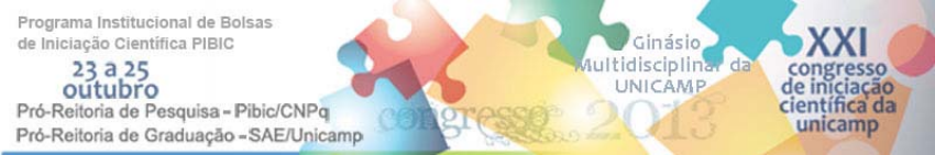 E0616 IDENTIFICAÇÃO/QUANTIFICAÇÃO DE NUCLEOSÍDEOS MODIFICADOS POR LC-MS/MS: DETERMINAÇÃO DE BIOMARCADORES TUMORAIS EM SORO SANGUÍNEO Matheus da Silva Barbosa e Profa. Dra. Ana Valéria Colnaghi Simionato Cantu (Orientadora), Instituto de Química - IQ, UNICAMP Os biomarcadores tumorais são indicadores do estado fisiológico e de alterações que ocorrem durante o processo neoplásico, capazes de identificar a doença em estágios iniciais, elevando a taxa de sobrevida dos pacientes. Este trabalho tem como objetivo o desenvolvimento de um método bioanalítico para quantificação de nucleosídeos (citidina, adenosina, timidina, uridina, 5-metiluridina, guanosina, xantosina, inosina e 8-bromoguanosina) em amostras de soro sanguíneo por LC-MS/MS. Foram testadas 10 combinações de fase orgânica (FO) e fase aquosa (FA) como fase móvel em modo de eluição isocrático e gradiente. Também foi variado a concentração dos reagentes e pH da fase móvel, fase estacionária (C18 e HILIC) e comprimento da coluna (5 cm e 15 cm). As condições de análise que possibilitaram a melhor separação dos nucleosídeos foram: FA com 0,12% de ácido fórmico em água, FO com 0,12% de ácido fórmico em metanol: água 1:1 (v/v), coluna C18 de 15 cm, eluição no modo gradiente, electrospray no modo positivo, tensão de 20kV, energia de colisão de 10 ev e monitoramento dos íons no modo multiple reaction monitoring. Embora alguns pares de nucleosídeos não tenham apresentado resolução acima de 1,5 o resultado obtido foi satisfatório, pois o método MS/MS apresenta boa sensibilidade e confiabilidade na identificação dos analitos. LC-MS/MS - Biomarcadores tumorais - Nucleosídeos IDENTIFICAÇÃO/QUANTIFICAÇÃO DE NUCLEOSÍDEOS MODIFICADOS POR LC-MS/MS: DETERMINAÇÃO DE BIOMARCADORES TUMORAIS EM SORO SANGUÍNEO