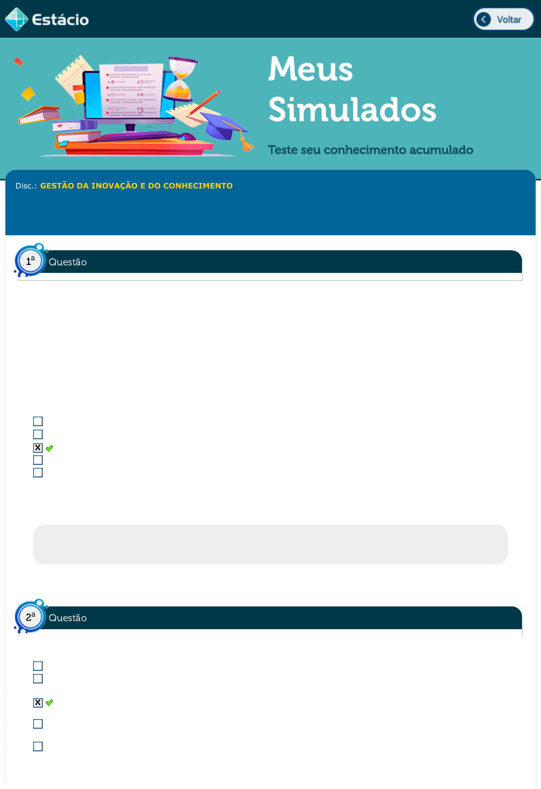 23/01/2023 16:20 Estácio: Alunos https://simulado.estacio.br/bdq_simulados_avaliacao_parcial_resultado.asp?cod_hist_prova=302213344&cod_prova=6007636613&f_cod_disc= 1/4 Meus Simulados Teste seu conhecimento acumulado Disc.: GESTÃO DA INOVAÇÃO E DO CONHECIMENTO Aluno(a): PAULA BEATRIZ PEREIRA DA ROSA 202103099131 Acertos: 8,0 de 10,0 23/01/2023 Acerto: 1,0 / 1,0 Bergoron define gestão do conhecimento como a capacidade de capturar, arquivar e acessar as melhores práticas de conhecimento relacionado ao trabalho e tomada de decisões de funcionários e gerentes para comportamentos individuais e de grupo. Considerando essa definição, avalie as seguintes asserções e a relação proposta entre elas. I - A gestão do conhecimento deve priorizar uma estratégia centrada nas pessoas. PORQUE II - A colaboração entre os funcionários e parceiros é o coração da gestão do conhecimento, sendo mais relevante do que a inclusão de novas tecnologias. A respeito dessas asserções, assinale a alternativa CORRETA: As asserções I e II são proposições falsas. As asserções I e II são proposições verdadeiras, e a II complementa a I. As asserções I e II são proposições verdadeiras, e a II é uma justificativa da I. A asserção I é uma proposição verdadeira, e a II é uma proposição falsa. A asserção I é uma proposição falsa, e a II é uma proposição verdadeira. Respondido em 23/01/2023 16:03:07 Explicação: A resposta certa é: As asserções I e II são proposições verdadeiras, e a II é uma justificativa da I. Acerto: 1,0 / 1,0 Em relação à importância conferida ao capital intelectual, é CORRETO afirmar que: Trata-se de um tema ultrapassado, uma vez que tal termo está em desuso. Trata-se de um tema ainda emergente, que passou a ser priorizado pelas empresas com o advento das redes sociais. Trata-se de um tema recente, mas que já recebe atenção de praticamente todas as empresas em mercados competitivos. Trata-se de um tema antigo, que sempre recebeu atenção de empresas de todos os portes desde a Revolução Industrial. Trata-se de um tema polêmico, que ainda suscita debates sobre sua real importância e aplicabilidade para o mercado. Respondido em 23/01/2023 16:03:58 Questão1 a Questão2 a https://simulado.estacio.br/alunos/inicio.asp javascript:voltar(); 23/01/2023 16:20 Estácio: Alunos https://simulado.estacio.br/bdq_simulados_avaliacao_parcial_resultado.asp?cod_hist_prova=302213344&cod_prova=6007636613&f_cod_disc= 2/4 Explicação: A resposta certa é: Trata-se de um tema recente, mas que já recebe atenção de praticamente todas as empresas em mercados competitivos. Acerto: 1,0 / 1,0 A inovação não é apendas uma invenção. É uma ideia nova que é criada e depois passa a ser implementada num produto ou processo de gerenciamento interno de uma empresa. Para se tornar inovadora, é INCORRETO afirmar que uma empresa precisa: Ter ganhos econômicos e sociais. Ser criativa Estar atenta às mudanças do mercado. Ter um departamento de tecnologia avançado. Gerar impacto positivo para a sociedade. Respondido em 23/01/2023 16:05:00 Explicação: A resposta certa é: Ter um departamento de tecnologia avançado. Acerto: 1,0 / 1,0 Uma empresa baseada no conhecimento reconhece que este elemento é um recurso estratégico. Para tirar o máximo proveito do que isso pode representar em sua gestão e na melhoria de sua competitividade, adota modos diferentes de conversão do conhecimento, com o objetivo de torná-lo disponível na organização. Um dos processos utilizados para a conversão do conhecimento na organização é a: externalização, que se constitui em um processo de transformação do conhecimento tácito em conhecimento explícito. internalização, que é o processo de ampliação do conhecimento explícito realizado pelo próprio funcionário e que possibilita o compartilhamento, com o ambiente externo, dos conhecimentos existentes internamente. adaptação, que é o conhecimento organizacional gerado pelas redes informais e auto-organizadas para sua evolução. socialização, que é um processo de composição de conceitos, que envolve a integração de conjuntos diferentes de conhecimento explícito, em um sistema de conhecimento. combinação, que é um processo de compartilhamento de experiências e, a partir disso, a criação do conhecimento tácito. Respondido em 23/01/2023 16:05:55 Explicação: A resposta correta é: externalização, que se constitui em um processo de transformação do conhecimento tácito em conhecimento explícito. Acerto: 1,0 / 1,0 Uma empresa do setor de seguros iniciou seus esforços de gestão do conhecimento. Uma das primeiras iniciativas foi atualizar e unificar os manuais relativos aos procedimentos de atendimento aos clientes no call Questão3 a Questão4 a Questão5 a 23/01/2023 16:20 Estácio: Alunos https://simulado.estacio.br/bdq_simulados_avaliacao_parcial_resultado.asp?cod_hist_prova=302213344&cod_prova=6007636613&f_cod_disc= 3/4 center com base na legislação atual. Essa iniciativa representou um processo de conversão do conhecimento, no que se refere à dimensão tácito-explícito, chamado de: tangibilização internalização externalização combinação socialização Respondido em 23/01/2023 16:06:57 Explicação: A resposta correta é: externalização Acerto: 0,0 / 1,0 Nos modelos tradicionais sobre o processo de inovação, o progresso passa por diversas etapas. Aquela que se situa mais próximo da inovação propriamente dita é chamada de: Análise Informação Dado Síntese Conhecimento Respondido em 23/01/2023 16:07:42 Explicação: A resposta correta é: Conhecimento Acerto: 0,0 / 1,0 Dentre as opções a seguir, indique aquela que apresenta corretamente os dois estágios do design de serviços consideradas divergentes no diagrama do duplo diamante. Exploração e implementação. Criação e reflexão. Exploração e criação. Exploração e reflexão. Reflexão e implementaç
