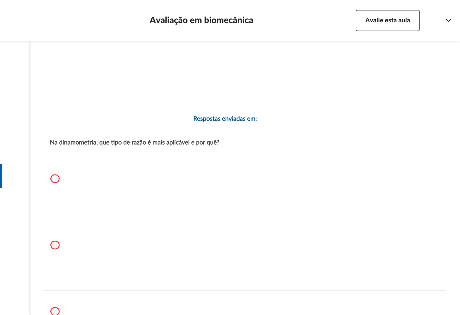 Exercícios Respostas enviadas em: 08/08/2022 21:58 3. Na dinamometria, que �po de razão é mais aplicável e por quê? Resposta incorreta. A. A razão funcional, já que envolve somente o pico de torque concêntrico, tanto de agonistas quanto de antagonistas. A razão funcional envolve o pico de torque excêntrico dos antagonistas. Resposta incorreta. B. A razão convencional, já que esta razão reflete a frenagem que os músculos antagonistas necessitam realizar em determinados gestos. A razão convencional não reflete frenagem, pois não envolve contrações excêntricas. Você não acertou! C. A razão funcional, sendo que a mesma é mais aplicável por envolver em sua fórmula a contração excêntrica dos agonistas, responsável por controlar o Anterior Dica do Professor Próximo Na prá�ca Avaliação em biomecânica Avalie esta aula DS movimento em gestos vigorosos. A razão funcional envolve a contração excêntrica de antagonistas (função de frenagem), e não de agonistas. Resposta incorreta. D. A razão convencional, já que envolve o mesmo �po de contração tanto para agonistas quanto para antagonistas, o que é uma situação com maior aplicabilidade. O fato de a razão convencional envolver o mesmo �po de contração (concêntrica) não lhe confere maior aplicabilidade, até porque é normal a contração concêntrica de um grupo e a contração excêntrica do grupo contrário em gestos de potência. Resposta correta. E. A razão funcional, isto porque, normalmente, ocorrem contrações concêntricas vigorosas do grupo agonista que necessitam de frenagem da musculatura antagonista, com contração excêntrica. Como vimos, a razão funcional, que é a divisão entre o pico de torque excêntrico dos antagonistas pelo pico de torque concêntrico dos agonistas é mais aplicável porque reflete uma situação prá�ca. 3 de 5 perguntas Voltar Próximo Anterior Dica do Professor Próximo Na prá�ca Avaliação em biomecânica Avalie esta aula DS