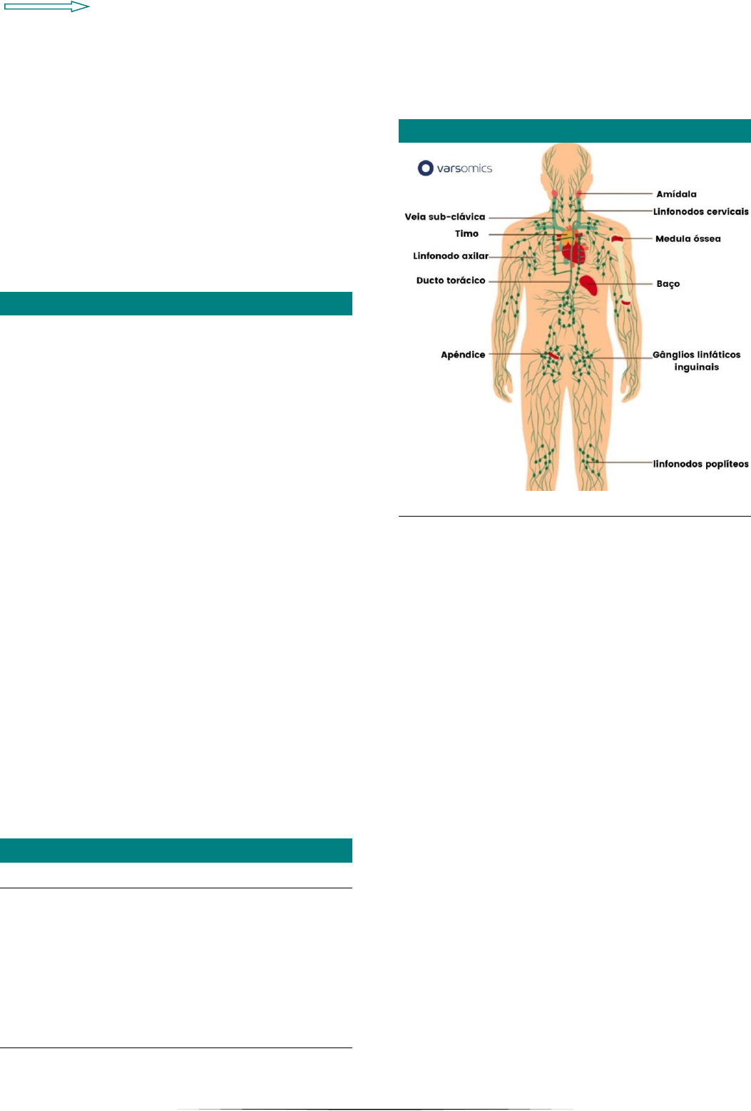 Maria Vitória Videira São João Sistema linfático → é um sistema formado por vasos e órgãos linfoides e nele circula a linfa → é basicamente um sistema auxiliar de drenagem, ou seja, auxiliar do sistema venoso → o sistema linfático por meio de capilares de fundo cego permite drenar o excesso de líquido tecidual e das proteínas plasmáticas que extravasam para a corrente sanguínea, além de resíduos da composição celular e infecção → encontra-se distribuído em todo o corpo, exceto no SNC, medula óssea e músculos esqueléticos Composição Plexos linfáticos → redes de capilares linfáticos de fundo cego que se originam nos espaços extracelulares (intercelulares) da maioria dos tecidos Vasos linfáticos → vasos de paredes finas com muitas válvulas linfáticas que compõem uma rede por quase todo o corpo para drenar a linfa dos capilares linfáticos Troncos linfáticos → são grandes vasos coletores que recebem linfa de múltiplos vasos linfáticos Linfa → é o líquido tecidual que entra nos capilares linfáticos e é conduzido por vasos linfáticos. Linfonodos → pequenas massas de tecido linfático, encontradas ao longo do trajeto dos vasos linfáticos, que filtram a linfa em seu trajeto até o sistema venoso Linfócitos → células circulantes do sistema imune que reagem contra materiais estranhos Órgãos linfoides → existem partes do corpo que produzem linfócitos (timo e medula óssea) e locais onde ocorrem as reações de resposta imunológica contra antígenos (linfonodos, baço, tonsilas e outros agregados de tecido linfoide) Órgãos linfoides primário Timo → órgão linfoide formado por massa irregular → localizado no mediastino superior anterior, atrás do esterno → o timo cresce após o nascimento e atinge seu tamanho máximo até a puberdade, posteriormente começa a regredir e grande parte da sua substância é substituída por tecido fibroso e adiposo Medula óssea → localizada no interior dos ossos longos → é o local de origem dos linfócitos B e T derivados de uma célula tronco linfoide Órgãos linfoides secundário Baço Característica → é uma massa oval, geralmente arroxeada, que tem aproximadamente o mesmo tamanho e o mesmo formato de uma mão fechada → na fase fetal, é capaz de produzir elementos figurados do sangue → é um órgão linfoide que filtra o sangue, destrói hemácias e plaquetas, além de ser um órgão onde estão presentes células de defesa (leucócitos e linfócitos), funcionando na defesa do organismo → é recoberto por uma fina cápsula fibrosa esplênica → sua drenagem venosa é feita para o sistema porta, mesmo não estando relacionada com o sistema digestivo → pode ser identificado no baço: -> 2 faces – diafragmática e visceral -> 2 margens – superior e inferior -> 2 polos – anterior e posterior Hilo → presença de uma estrutura chamada hilo do baço, uma fissura na face visceral, por onde entram e saem vasos sanguíneos e nervos Localização e relação → situa-se no lado esquerdo do corpo, contra o diafragma e protegido pela 9º-11º costela → é um órgão móvel e não palpável, a não ser que esteja muito aumentado “Passado boêmio” Anatomia Maria Vitória Videira São João → está em conexão com o estômago por meio do ligamento gastroesplênico e à parede do rim e do abdome por meio do ligamento frenoesplênico Linfonodos Localização → se encontram interpostos no trajeto dos vasos linfáticos (como ocorre no pescoço, nas cavidades torácica e abdominal e pélvica) e agem como uma barreira ou filtro contra a penetração na corrente sanguínea de microrganismos, toxinas ou substâncias estranhas no organismo Características → são elementos de defesa para o organismo, possuindo em sua composição glóbulos brancos e linfócitos → os linfonodos variam muito de tamanho, forma e coloração, ocorrem geralmente em grupo, embora possam se apresentar isolados → o linfonodo é revestido por uma cápsula fibrosa ausente apenas no hilo e da qual partem trabéculas que septam os linfonodos → como reação a uma inflamação, o linfonodo pode entumecer e se tornar dolorosos, chamado comumente de “íngua” Tecidos linfáticos associados a mucosa (MALT) → são estruturas constituídas por infiltrações de linfócitos e nódulos linfáticos no trato gastrointestinal, respiratório e urinário GALT → localizados no íleo (onde formam agregados linfáticos denominados placas de peyer), sendo constituídos por linfócitos B e T SALT → localizados na pele DALT → localizados nos ductos associados aos gânglios linfáticos BALT → localizados nas paredes dos brônquios NALT → localizados na mucosa nasal Tonsila palatina → são coleções de tecido linfoide localizado um de cada lado da parte oral da faringe no intervalo entre os arcos palatinos → a tonsila ocupa parte da fossa tonsilar, que é composto por músculo, uma lâmina e por uma fáscia Tonsila lingual → localizada na parte posterior da língua, das papilas valadas até a epiglote → são nódulos linfoides subjacentes que conferem a língua uma aparência irregular Tonsila faríngea → encontrado na parte nasal da faringe, situada na parte da túnica mucosa do teto e na parede posterior → quando a tonsila faríngea se encontra aumentada, é comumente chamada de adenoide Diferenças entre o sistema linfático e o cardiovascular → os capilares linfáticos não são contínuos com as artérias, mas sim apresentam fundo cego → o sistema linfático não possui um órgão contrátil- propulsor como o sistema cardiovascular → os vasos linfáticos não desembocam no coração, mas sim em veias → os vasos linfáticos são intercalados por linfonodos Padrão de Drenagem Linfática Capilares → as redes de capilares linfáticos de fundo cego se originam nos espaços extracelulares da maioria dos tecidos → são formados por um endotélio de parede fina e não possuem m