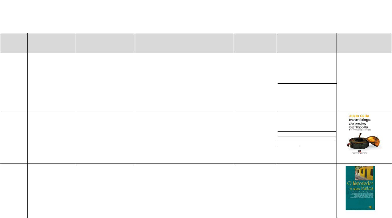 BIBLIOTECA OCTÁVIO IANNI / INSTITUTO DE FILOSOFIA E CIÊNCIAS HUMANAS E-BOOKS IDENTIFICADOS NAS BIBLIOGRAFIAS DOS CURSOS DE GRADUAÇÃO PLATAFORMAS 'MINHA BIBLIOTECA' E 'BIBLIOTECA VIRTUAL PEARSON' CÓDIGO DA DISCPLINA NOME DA DISCIPLINA RESPONSÁVEL PELA DISCIPLINA TÍTULO RECUPERADO PLATAFORMA SITE DE ACESSO (endereço eletrônico do e-book) CAPA DO LIVRO HG753_A Tópicos Especiais de História da Filosofia Moderna V Enéias Júnior Forlin Santiago, H. Espinosa e o cartesianismo – O estabelecimento da ordem nos Princípios de Filosofia Cartesiana. São Paulo, Humanitas, 2004. (Temos acesso pela Pearson ao título: Princípios da filosofia cartesiana e pensamentos metafísicos / Espinosa ; Homero Santiago (trad) ; Luis César Guimarães Oliva (trad). ) PEARSON https://plataforma.bvirtual.com.br/Leitor/Publicacao/36789/pdf/0?code=cAKx/POPk/spOBUfFTPEX3DXjOP8phQbGNC+XCtHJjBRZdWA98ppwXy6i+AOEgjNaamIBlpLfO1rfk2sUCcgdA==INDISPONÍVEL HG861_A Estágio Supervisionado em Filosofia Rafael Rodrigues Garcia Gallo, Sílvio; Metodologia do Ensino de Filosofia - uma didática para o ensino médio. PEARSON http://acervus.unicamp.br/asp/pla taforma_digital.asp?codigo=3033 2401&iIndexSrv=1&obra=115176 5&iIdioma=0 HH092_A Introdução a História (PROFIS) Raquel Gomes LUCA, Tania Regina de; Pinsky, Carla Bassanezi (orgs.); Martins, Ana Luiza ... [et al.]. O Historiador e suas Fontes. Editora Contexto. E-BOOK. (338 p.) PEARSON http://acervus.unicamp.br/asp/pla taforma_digital.asp?codigo=3023 9535&iIndexSrv=1&obra=114234 3&iIdioma=0 HH183_A Introdução ao Estudo de História Rodrigo Camargo de Godoi DUMOULIN, Olivier. O papel social do historiador: da cátedra ao tribunal. São Paulo: Autêntica, 2017. E- BOOK. (1 recurso online). (História e historiografia). ISBN 9788551301876. Disponível em: https://integrada.minhabiblioteca.com.br/books/9788551 301876. Acesso em: 4 Feb. 2021. MINHA BIBLIOTECA http://acervus.unicamp.br/asp/pla taforma_digital.asp?codigo=3018 6965&iIndexSrv=1&obra=113931 2&iIdioma=0 HH186_A Laboratório de História Luana Tvardovskas BITTENCOURT, Circe (org.). O saber histórico na Sala de Aula. São Paulo: Ed. Contexto, 2010. PEARSON https://middleware- bv.am4.com.br/SSO/uecamp/978 8572440714 HH186_A Laboratório de História Luana Tvardovskas PINSKY, Carla Bassanezi (org.). Fontes Históricas. 2 ed. São Paulo: Contexto, 2006. PINSKY, Carla Bassanezi; LUCA, Tania Regina de. O Historiador e suas Fontes. Paulo: Contexto, 2013. PEARSON https://middleware- bv.am4.com.br/SSO/uecamp/978 8572442979 HH186_A Laboratório de História Luana Tvardovskas PINSKY, Carla Bassanezi; LUCA, Tania Regina de (orgs.). O historiador e suas fontes. São Paulo: Contexto, 2012. PEARSON https://middleware- bv.am4.com.br/SSO/uecamp/978 8572444514 HH188_A História da África Lucilene Reginaldo COOPER, Frederick. Histórias de África: Capitalismo, modernidade e globalização MINHA BIBLIOTECA http://acervus.unicamp.br/asp/pla taforma_digital.asp?codigo=3016 6319&iIndexSrv=1&obra=113833 7&iIdioma=0 HH285_A História Medieval Néri de Barros Almeida M. CÂNDIDO DA SILVA, História Medieval PEARSON https://plataforma.bvirtual.com.br/ Leitor/Publicacao/170122/pdf/0?c ode=ArH9mv0fu4lHsoUSNEyajU 64+M0WTUAURtKAJzHw8kJecE kLaCiVJE/OzwjT01yxKrJTUXQX WW2+vxZzqWrS3A== HH483_A História do Brasil II Ricardo Figueiredo Pirola MATTOSO, Katia. Ser escravo no Brasil. São Paulo: Brasiliense, 1982. PEARSON https://middleware- bv.am4.com.br/SSO/uecamp/978 8532652560 HH584_A História do Brasil III Claudio Henrique de Moraes Batalha JANOTTI, Maria de Lourdes Mônaco. “O diálogo convergente: políticos e historiadores no início da República”, in: FREITAS, Marcos Cezar de (org.). Historiografia brasileira em perspectiva. São Paulo: Contexto, 1998. PEARSON https://middleware- bv.am4.com.br/SSO/uecamp/978 8572440882 HH584_A História do Brasil III Claudio Henrique de Moraes Batalha VISCARDI, Cláudia Maria Ribeiro. O teatro das oligarquias: uma revisão da “política do café com leite”. Belo Horizonte: C/Arte, 2001. __________ e ALENCAR, José Almeino de (orgs.). A República revisitada: construção e consolidação do projeto republicano brasileiro. Porto Alegre: ediPUCRS, 2016. PEARSON https://middleware- bv.am4.com.br/SSO/uecamp/978 8539708239 INDISPONÍVEL HH685_A História Contemporânea II Raquel Gomes Histórias de África – capitalismo, modernidade e globalização MINHA BIBLIOTECA https://integrada.minhabiblioteca. com.br/#/books/9789724419749/ epubcfi/6/2%5B%3Bvnd.vst.idref %3DcoverPage%5D!/4/2/2%5Bv st-image-button- 503778%5D%400:0 HH685_A História Contemporânea II Raquel Gomes Irmã outsider PEARSON http://acervus.unicamp.br/asp/pla taforma_digital.asp?codigo=3026 6660&iIndexSrv=1&obra=114576 5&iIdioma=0 HH690_A Estágio Supervisionado em História Aldair Rodrigues BITTENCOURT, Circe Maria Fernandes. O saber histórico na sala de aula PEARSON http://acervus.unicamp.br/asp/logi n.asp?veio_de=midia&tipo_obra= 1&codigo_obra=1142734&codigo _midia=30242649&iBanner=0&iI dioma=0 HH690_A Estágio Supervisionado em História Aldair Rodrigues Karnal, Leandro. A História na sala de aula: conceitos, práticas, propostas PEARSON http://acervus.unicamp.br/asp/logi n.asp?veio_de=midia&tipo_obra= 1&codigo_obra=1142294&codigo _midia=30239143&iBanner=0&iI dioma=0 HH690_A Estágio Supervisionado em História Aldair Rodrigues PINSKY, Carla. Fontes Históricas PEARSON http://acervus.unicamp.br/asp/pla taforma_digital.asp?codigo=3023 9198&iIndexSrv=1&obra=114230 1&iIdioma=0 HH756_A Tópicos Especiais em História LVI Rodrigo Camargo de Godoi John Stuart Mill, Sobre a liberdade MINHA BIBLIOTECA http://acervus.unicamp.br/asp/pla taforma_digital.asp?codigo=3020 0504&iIndexSrv=1&obra=113995 7&iIdioma=0 HH757_A Tópicos Especiais em História LVII Pedro Paulo Abreu Funari FUNARI, Pedro Paulo Abreu. Arqueologia. São Paulo: Contexto, 2006. PEARSON https://middleware- bv.am4.com.br/SSO/uecamp/978 8572442510 HH771_ A Tópicos Es