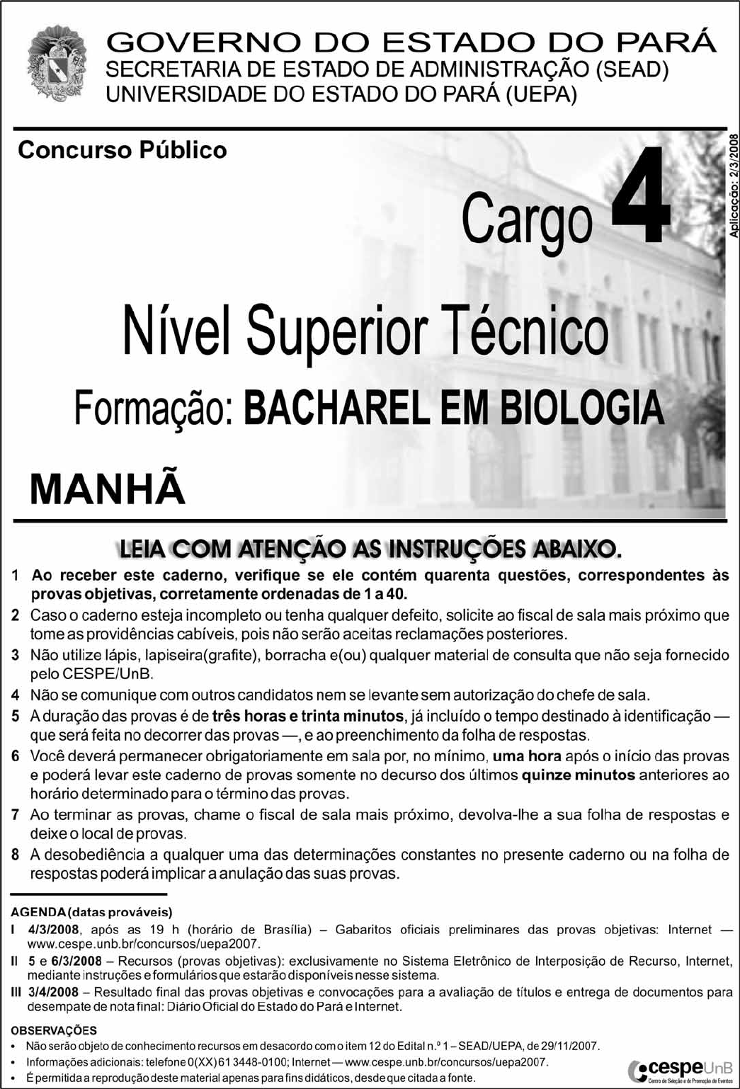 UnB/CESPE – SEAD/UEPA Cargo 4: Nível Superior Técnico – Formação: Bacharel em Biologia – 1 – • Nas questões de 1 a 40, marque, em cada uma, a única opção correta, de acordo com o respectivo comando. Para as devidas marcações, use a folha de respostas, único documento válido para a correção das suas provas. • Nas questões que avaliam Noções de Informática, a menos que seja explicitamente informado o contrário, considere que todos os programas mencionados estão em configuração-padrão, em português, que o mouse está configurado para pessoas destras e que expressões como clicar, clique simples e clique duplo referem-se a cliques com o botão esquerdo do mouse. Considere também que não há restrições de proteção, de funcionamento e de uso em relação aos programas, arquivos, diretórios e equipamentos mencionados. CONHECIMENTOS BÁSICOS Texto para as questões de 1 a 8 Tempo e artista Imagino o artista num anfiteatro1 Onde o tempo é a grande estrela Vejo o tempo obrar a sua arte Tendo o mesmo artista como tela4 Modelando o artista ao seu feitio O tempo, com seu lápis impreciso Põe-lhe rugas ao redor da boca7 Como contrapesos de um sorriso Já vestindo a pele do artista O tempo arrebata-lhe a garganta10 O velho cantor subindo ao palco Apenas abre a voz, e o tempo canta Dança o tempo sem cessar, montando13 O dorso de exausto bailarino Trêmulo, o ator recita um drama Que ainda está por ser escrito16 No anfiteatro, sob o céu de estrelas Um concerto eu imagino Onde, num relance, o tempo alcance a glória19 E o artista, o infinito. Chico Buarque de Holanda. Paratodos. SONOPRESS, BMG, Ariola Discos Ltda. QUESTÃO 1 Considerando as idéias do texto, é correto afirmar que o autor A apresenta o tempo como um inimigo implacável da carreira do artista. B mostra divergências existentes entre a imaginação do artista e a ação do tempo. C relata acontecimentos vividos por um artista através dos tempos. D sustenta que, na sua imaginação, a estrela do espetáculo é o tempo, e não o artista. QUESTÃO 2 Assinale a opção em que o pronome “lhe” não tem o mesmo sentido que em: “O tempo arrebata-lhe a garganta” (v.10). A Afagou-lhe os cabelos com amor. B A luz sempre lhe afugenta o sono. C O marido sempre lhe nega a resposta. D Ajeitou-lhe o colar e saiu mansamente. QUESTÃO 3 O processo de formação da palavra “anfiteatro” (v.1 e 17) é denominado A composição por justaposição. B derivação imprópria. C derivação prefixal. D derivação parassintética. QUESTÃO 4 Assinale a opção em que o verbo arrebatar apresenta o mesmo sentido que ocorre em “O tempo arrebata-lhe a garganta” (v.10). A A atriz arrebatou a cena e dançou. B A beleza do lugar arrebatou sua alma. C A interpretação do pianista arrebatou aplausos. D Flores frágeis, o vento as arrebata. QUESTÃO 5 Na segunda estrofe, o pronome “lhe” em “Põe-lhe rugas ao redor da boca” está empregado em referência a A “artista”. B “feitio”. C “tempo”. D “lápis”. QUESTÃO 6 O autor empregou o pronome relativo “Onde” (v.19) para se referir à palavra “concerto” (v.18). Assinale a opção em que o pronome relativo “onde” foi usado de acordo com a escrita culta padrão. A São pessoas desonestas, pessimistas e individualistas, onde só pensam nelas mesmas. B Por ser interesseiro, casou-se com a rica filha do vizinho onde mais tarde se separou. C As mulheres procuram o caminho mais largo, onde são menos numerosos os espinhos. D Depois de muito refletir, decidiu ser padre onde foi morar num seminário. QUESTÃO 7 O termo em destaque, em “Que ainda está por ser escrito” (v.16), classifica-se como A substantivo. B adjetivo. C advérbio. D verbo. QUESTÃO 8 De acordo com o contexto, em “E o artista, o infinito” (v. 20), a vírgula marca a elipse do verbo A imaginar. B alcançar. C divisar. D lobrigar. UnB/CESPE – SEAD/UEPA Cargo 4: Nível Superior Técnico – Formação: Bacharel em Biologia – 2 – Texto para as questões 9 e 10 O Brasil, ao adensar presença econômica na América do Sul por meios múltiplos — da internacionalização das empresas aos investimentos produtivos e à exportação de produtos com valor agregado, todos fatores nucleares ao entendimento da celebrada folga cambial e redução de vulnerabilidade externa —, não esperava colher apenas louros e palmas dos vizinhos. Há tensões no front. Há choques de interesses, valores e idéias. José Flávio Sombra Saraiva. Uma política à altura dos desafios. In: Folha de S.Paulo, 15/12/2007, p. 3 (com adaptações). QUESTÃO 9 Tomando o texto como referência inicial, assinale a opção correta no que concerne ao papel do Brasil na América do Sul. A O país vem conseguindo impor suas visões de mundo sem contestações dos vizinhos. B A força do Brasil no seu entorno decorre da capacidade econômica e política de empreender projetos produtivos voltados para a integração. C A internacionalização das empresas brasileiras na região tem um papel nefasto aos projetos de desenvolvimento locais. D O Brasil possui poder proporcional ao da Alemanha e da França em capacidade de patrocinar os custos totais da integração na região, sem riscos de debates internos e com recursos para bancá-los. QUESTÃO 10 Ainda considerando o texto como referência inicial, assinale a opção correta. A A Amazônia, por estar no coração do centro-norte da América do Sul, é área de grande interesse para a integração da região. B A Amazônia brasileira, incluída nos novos projetos de investimento energético, como o primeiro leilão para construção de hidrelétrica no rio Madeira, é a área mais dinâmica de integração sul-americana. C A integração sul-americana caminha sem sustos e crises de valores e políticas. D A força do empreendimento sul-americano tem no tema do desenvolvimento sustentável seu eixo estrutural e condição primeira para a aproximação 