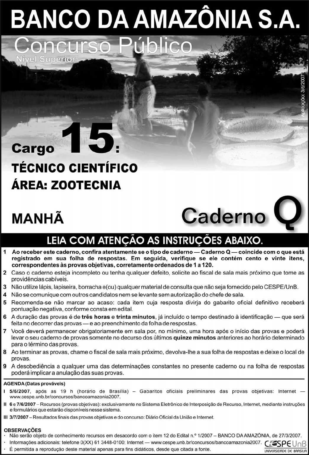 UnB/CESPE – Banco da Amazônia S.A. Caderno Q Cargo 15: Técnico Científico – Área: Zootecnia – 1 – • De acordo com o comando a que cada um dos itens de 1 a 120 se refira, marque, na folha de respostas, para cada item: o campo designado com o código C, caso julgue o item CERTO; ou o campo designado com o código E, caso julgue o item ERRADO. A ausência de marcação ou a marcação de ambos os campos não serão apenadas, ou seja, não receberão pontuação negativa. Para as devidas marcações, use a folha de respostas, único documento válido para a correção das suas provas. • Nos itens que avaliam Noções de Informática, a menos que seja explicitamente informado o contrário, considere que todos os programas mencionados estão em configuração-padrão, em português, que o mouse está configurado para pessoas destras e que expressões como clicar, clique simples e clique duplo referem-se a cliques com o botão esquerdo do mouse. Considere também que não há restrições de proteção, de funcionamento e de uso em relação aos programas, arquivos, diretórios e equipamentos mencionados. CONHECIMENTOS BÁSICOS Texto para os itens de 1 a 15 Existem muitas maneiras de se enxergar uma1 empresa. Uma delas é vê-la como uma máquina. E não se trata de uma analogia nova. A era industrial foi construída com base nesse paradigma, sustentado pelas teorias dos4 cientistas Taylor e Fayol, que acreditavam (e isso fazia sentido para a época em que viveram) que uma empresa tinha de funcionar como um infalível relógio ou como uma7 locomotiva, programada para cumprir, rigorosamente, seus tempos de parada e locomoção, de maneira a garantir o andamento do sistema ferroviário, sem atrasos nem10 acidentes. Para isso, colocaram a produtividade como principal meta, assegurada por um sistema técnico de alta eficiência.13 Uma empresa até pode se parecer com uma máquina, quando existe uma tarefa contínua a ser desempenhada. Nesse caso, a mecanização da tarefa, de16 maneira integralmente repetitiva, pode diminuir a quantidade de erros. O mesmo raciocínio continua valendo, se a empresa estiver situada em um ambiente estável, ou seja, onde os19 fatores externos pouco ou nada interferem no seu desempenho. Ou quando a criatividade, produto mais nobre e valioso do sistema humano, é considerada indesejável.22 Tornar as tarefas repetitivas para eliminar erros é, talvez, o maior equívoco em que se pode incorrer. Afinal, os erros acontecem justamente quando o indivíduo liga o piloto25 automático. E o piloto automático é acionado quando o trabalho a ser feito não traz significado algum para aquele que o executa. Destituído de sentido, o trabalho se28 transforma em tarefa enfadonha, que traz apenas aborrecimento, o que, por sua vez, gera a pressa de acabar logo com aquela tortura, na ânsia de reencontrar a alma31 deixada na porta de entrada da empresa, ao lado do marcador de ponto. Internet: <www.empreendedor.com.br> (com adaptações). Com referência às idéias do texto, julgue os itens a seguir. 1 Alguns líderes querem resolver o problema da produtividade dos funcionários recorrendo a algum sistema técnico infalível e, além disso, reivindicam um plano de recompensa, para remunerar os funcionários com base no que foram capazes de produzir. 2 Produzir o mesmo produto o tempo todo é mais um requisito que sustenta a tese da empresa-máquina ou locomotiva; parte da hipótese de que todas as pessoas são iguais e querem as mesmas coisas. 3 A crença na necessidade de padronizar o trabalho interno, pela mecanização da tarefa, reduzindo-o a atividades mecânicas e repetitivas, que também pasteurizam os produtos, atrai os consumidores desejosos e interessados em pagar cada vez menos. 4 A ausência de significado para o trabalho é um triste denominador comum para quem produz: não se consegue gerar comprometimento nas pessoas que produzem sem estímulo. 5 Seguindo a teoria da infalibilidade, sustentada pelas teorias que exigiam a tolerância-zero-defeito, as organizações passaram anos ensinando aos funcionários tudo o que podiam sobre erros e anomalias, e esses funcionários continuam sem saber nada de acertos. Mantendo-se a correção gramatical do texto, é correto substituir-se 6 “Existem muitas maneiras” (R.1) por Há muitas maneiras. 7 “Uma delas é vê-la como uma máquina” (R.2) por Uma dessas é vê-la tal qual uma máquina. 8 “colocaram a produtividade como principal meta” (R.11-12) por colocaram-lhe na situação de meta principal. 9 “Uma empresa até pode se parecer com uma máquina” (R.14- 15) por Até uma empresa pode assemelhar-se à uma máquina. 10 “onde os fatores externos pouco ou nada interferem no seu desempenho” (R.19-21) por em que os fatores exteriores pouco ou nada influenciam o desempenho empresarial. Acerca das relações sintático-semânticas presentes no texto, julgue os itens subseqüentes. 11 Nas linhas 21 e 22, a passagem “produto mais nobre e valioso do sistema humano” está ligada semanticamente à palavra “criatividade”. 12 Na linha 23, o segmento “as tarefas repetitivas” é o sujeito da forma verbal “Tornar”. 13 Nas linhas 25 e 26, a expressão “piloto automático”, em suas duas ocorrências, exerce a função sintática de complemento do verbo antecedente. 14 O trecho “para aquele que o executa” (R.27-28) classifica-se como oração subordinada e tem o sentido de finalidade. 15 A oração “que traz apenas aborrecimento” (R.29-30) exerce uma função de valor explicativo em relação a “tarefa enfadonha” (R.29). UnB/CESPE – Banco da Amazônia S.A. Caderno Q Cargo 15: Técnico Científico – Área: Zootecnia – 2 – O construtor de pontes Dois irmãos que moravam em fazendas vizinhas,1 separadas apenas por um rio, entraram em conflito. Foi a primeira grande desavença em toda uma vida de trabalho lado a lado. Mas agora tudo havia mudado.4 O que começou com um pequeno ma