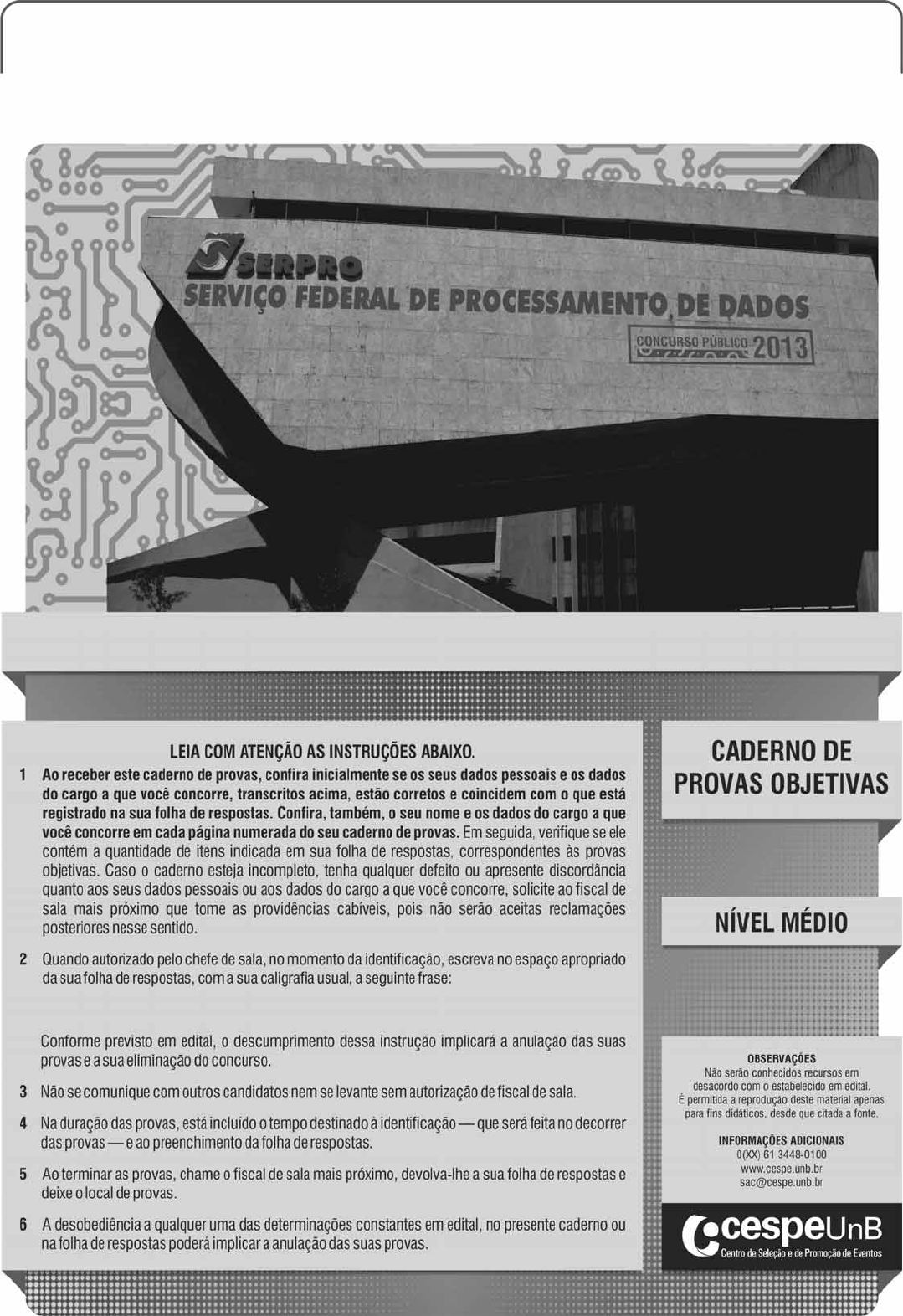 ||SERPRO13_CBNM1_01N152296|| CESPE/UnB – SERPRO/2013 • De acordo com o comando a que cada um dos itens a seguir se refira, marque, na folha de respostas, para cada item: o campo designado com o código C, caso julgue o item CERTO; ou o campo designado com o código E, caso julgue o item ERRADO. A ausência de marcação ou a marcação de ambos os campos não serão apenadas, ou seja, não receberão pontuação negativa. Para as devidas marcações, use a folha de respostas, único documento válido para a correção das suas provas. • Nos itens que avaliam noções de informática, a menos que seja explicitamente informado o contrário, considere que todos os programas mencionados estão em configuração-padrão, em português, e que não há restrições de proteção, de funcionamento e de uso em relação aos programas, arquivos, diretórios, recursos e equipamentos mencionados. CONHECIMENTOS BÁSICOS O Programa SERPRO de Inclusão Digital (PSID)1 busca promover a inclusão digital e social das comunidades excluídas do universo das tecnologias da informação e comunicação (TIC).4 O Serviço Federal de Processamento de Dados (SERPRO), maior empresa de TIC da América Latina, utiliza sua competência tecnológica e seu compromisso social nesse7 programa de uso intensivo da tecnologia da informação para ampliar a cidadania e combater a pobreza, objetivando garantir a inserção do indivíduo na sociedade da informação e o10 fortalecimento do desenvolvimento local. Implantado em 2003, esse programa é uma das ações amparadas pela política de Responsabilidade Social e13 Cidadania da Empresa, em sintonia com o Programa Brasileiro de Inclusão Digital do Governo Federal. O PSID concentra-se em dois eixos principais: utilizar efetivamente o software livre,16 viabilizando o seu uso e a apropriação das novas tecnologias pela sociedade; e propiciar o atendimento das necessidades das comunidades, a formulação de políticas públicas, a criação de19 conhecimentos, a elaboração de conteúdos apropriados e o fortalecimento das capacidades das pessoas e das redes comunitárias.22 Dentre as ações desenvolvidas pela área de inclusão digital do SERPRO, destaca-se a montagem de telecentros comunitários, iniciativa que leva o acesso ao universo25 tecnológico e ao mundo da informação para várias localidades do Brasil. O SERPRO também integra diversas parcerias com28 outros órgãos do governo, desenvolvendo soluções e participando ativamente de ações de governo ligadas à inclusão digital.31 Internet: <https://www4.serpro.gov.br/inclusao> (com adaptações). De acordo com as ideias e estruturas linguísticas do texto acima, julgue os itens de 1 a 7. 1 O texto está estruturado como uma narrativa, dado que são apresentados fatos já ocorridos e o tempo verbal nele predominante é o pretérito. 2 O segmento “maior empresa de TIC da América Latina” (R.6) está entre vírgulas porque constitui um aposto. 3 Depreende-se das informações do texto que o PSID tem o objetivo exclusivo de formar profissionais para seus quadros funcionais, uma vez que o SERPRO é uma empresa que lida com tecnologias da comunicação e da informação. 4 As expressões “nesse programa” (R.7-8) e “esse programa” (R.12) são elementos de coesão textual que retomam o antecedente “Programa SERPRO de Inclusão Digital (PSID)” (R.1). 5 No trecho “ações de governo ligadas à inclusão digital” (R.30-31), o emprego do acento indicativo de crase justifica-se pela presença de artigo definido feminino antes de “inclusão” e pela regência de “ligadas”, que, pelos sentidos do texto, exige complemento regido pela preposição a. 6 Em “concentra-se” (R.15), o emprego do pronome “se” indica que o sujeito da forma verbal é indeterminado. 7 O emprego de vírgulas nas linhas 19 e 20 tem justificativas gramaticais diferentes. Acerta a presidenta Dilma Rousseff ao tentar acelerar1 a retomada do crescimento econômico pela via do investimento em infraestrutura e em inovação tecnológica. Melhor ainda foi ter a presidenta se convencido de que, sem a participação de4 capitais privados, nacionais e estrangeiros, não vai chegar a lugar algum, pelo menos em prazo razoável e a custo aceitável. Para isso, terá de convencer o parceiro arisco e7 exigente de que o país é confiável, não falseia estatísticas, paga as contas em dia, não rasga contratos e não muda as regras do jogo por conveniência política ou por voluntarismos10 palacianos. Trata-se de conhecer e respeitar a regra do jogo. Assim como o dinheiro não aceita desaforo, as empresas pautam-se pela lógica simples de gastar o mínimo para13 produzir o máximo, agregar constantemente valor ao capital empregado e compensar satisfatoriamente quem correu o risco do negócio.16 Nesse sentido, o Brasil vai bem. Afinal, não é pela nossa simpatia nem pela exuberância de nossa natureza tropical que as principais agências classificadoras de risco de crédito19 têm elevado o nível de confiança internacional no país. Editorial, Correio Braziliense, 18/3/2013 (com adaptações). Em relação às ideias e estruturas linguísticas do texto acima, julgue os itens que se seguem. 8 A forma verbal “têm” (R.20) está no plural porque concorda com “classificadoras” (R.19). 9 Depreende-se dos argumentos e das informações do texto que a opinião do articulista é favorável às posições que a presidenta Dilma está tomando em relação à gerência dos investimentos para desenvolver o país. 10 A expressão “parceiro arisco e exigente” (R.7-8) refere-se a qualquer agente econômico, seja ele nacional ou estrangeiro, que possa vir a investir capital privado no Brasil. – 1 – ||SERPRO13_CBNM1_01N152296|| CESPE/UnB – SERPRO/2013 Nos últimos dez anos, o comércio exterior brasileiro1 foi rebocado pelo crescimento chinês baseado em uma rápida urbanização e em pesados investimentos em infraestrutura