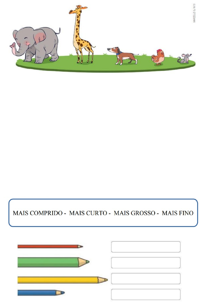 ATIVIDADE DE MATEMÁTICA 1. OBSERVE OS ANIMAIS DA FAZENDINHA DO SENHOR JOAQUIM E A) QUAL É O ANIMAL MAIS ALTO DA FAZENDA? __________________________________________ B) E O ANIMAL MAIS BAIXO? __________________________________________ C) QUAL É O ANIMAL QUE TEM O PESCOÇO MAIS COMPRIDO? __________________________________________ D) E O ANIMAL QUE TEM O RABO MAIS CURTO? __________________________________________ 2. OBSERVE OS LÁPIS COLORIDOS E ESCREVA NOS ESPAÇOS EM BRANCO AS 3. OBSERVE OS ANIMAIS A SEGUIR E FAÇA UM: · RETÂNGULO NO ANIMAL MAIS ALTO · CÍRCULO NO MAIS PESADO · QUADRADO NO MAIS LEVE 4. VOCE JÁ MEDIU ALGUNS OBJETOS USANDO AS MÃOS COMO MEDIDA? A) QUAL É A ALTURA DA MESA DA SUA SALA? UTILIZE O PALMO DA SUA MÃO COMO MEDIDA. __________________________________________________________ __________________________________________________________ B) E A ALTURA DO SEU LÁPIS? USE O SEU POLEGAR? __________________________________________________________ __________________________________________________________ 5. AS CAIXAS DE LIVROS PARA A BIBLIOTECA DA ESCOLA JÁ CHEGARAM E FORAM EMPILHADAS. A) QUANTAS CAIXAS TEMOS EM CADA PILHA? ______________________________________ B) MARQUE COM UM ( x ) A MENOR PILHA DE CAIXAS. ______________________________________ C) QUANTAS CAIXAS TEM NAS TRÊS PILHAS? FAÇA OS CÁLCULOS. ______________________________________ 6. PARA MEDIR COMPRIMENTO USAMOS O METRO. RESPONDA COM ATENÇÃO: A) MARQUE O QUE COMPRAMOS POR METRO: B) QUANTOS OBJETOS TEM NA IMAGEM AO LADO? _______________________________ 7. COMO INSTRUMENTO PARA MEDIR A MASSA, USAMOS A BALANÇA. HOJE ALGUMAS CRIANÇAS MEDIRAM SUAS MASSAS, VEJA: A) QUEM TEM MASSA MENOR? ( ) KARLA ( ) CLARICE ( ) LAURO ( ) LÉLIO B) QUEM TEM MASSA MAIOR? ( ) KARLA ( ) CLARICE ( ) LAURO ( ) LÉLIO C) COMPARE AS MASSAS DE CLARICE E KARLA. QUEM TEM A MAIOR MASSA? D) E VOCÊ, SABE QUAL É A SUA MASSA? 8. QUAL CONJUNTO DE LARANJAS DEVEMOS USAR PARA QUE CADA RECIPIENTE FIQUE CHEIO? MARQUE COM A LETRA CORRESPONDENTE. 9. NUMA FAZENDA HAVIA 8 VAQUINHAS E 3 BOIS. QUANTOS ANIMAIS A FAZENDA TINHA NO TOTAL? 10. LO AQUÁRIO DE ALICE POSSUI 5 PEIXINHOS DOURADOS E 4 PEIXES PALHAÇO. QUANTOS PEIXES NO TOTAL ALICE TEM? 11. PEDRO TEM 7 CARRINHOS E FÁBIO TEM 6. JUNTOS ELES TEM QUANTOS CARRINHOS? 12. LARA COMPROU UMA BONECA DE 9 REAIS E UMA BOLA QUE CUSTOU 5 REAIS. QUANTO ELA GASTOU? 13. RITA TINHA 10 LÁPIS, MAS PERDEU 3. QUANTOS RESTARAM? 14. SEU JOÃO LEVOU 9 BALÕES PARA VENDER NA PRAÇA. NO MEIO DO CAMINHO 2 ESTOURARAM. QUANTOS BALÕES SOBRARAM? 15. A TURMA DO 1o ANO TEM 15 MENINOS. MAS HOJE, 5 FALTARAM. QUANTOS MENINOS FORAM PARA A ESCOLA? 16. TIAGO COMPROU 6 BRIGADEIROS. ELE JÁ COMEU 4. QUANTOS BRIGADEIROS AINDA RESTAM?