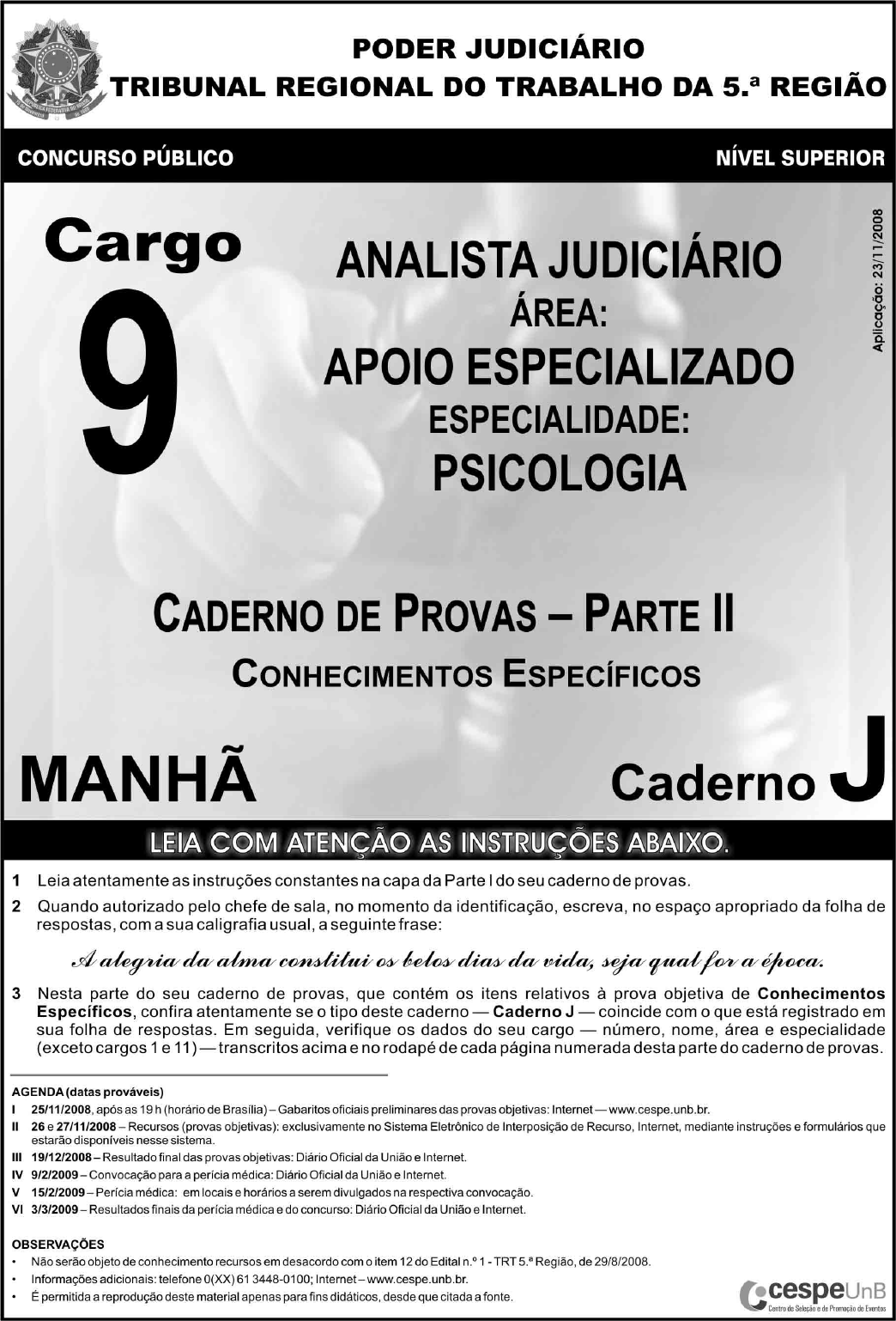 UnB/CESPE – TRT 5.a Região Caderno J Cargo 9: Analista Judiciário – Área: Apoio Especializado – Especialidade: Psicologia – 1 – De acordo com o comando a que cada um dos itens de 51 a 120 se refira, marque, na folha de respostas, para cada item: o campo designado com o código C, caso julgue o item CERTO; ou o campo designado com o código E, caso julgue o item ERRADO. A ausência de marcação ou a marcação de ambos os campos não serão apenadas, ou seja, não receberão pontuação negativa. Para as devidas marcações, use a folha de respostas, único documento válido para a correção das suas provas. CONHECIMENTOS ESPECÍFICOS Considere que o psicólogo de um órgão público atende, em parceria com um psiquiatra e um cardiologista, servidores com queixa de transtorno do pânico. A respeito desse serviço e das respectivas técnicas de atendimento, julgue os itens a seguir. 51 A técnica de reestruturação cognitiva pode ser eficaz no tratamento psicológico da síndrome do pânico. 52 Um paciente com padrão de enfrentamento focado no problema tem poucas chances de evoluir no automanejo dos ataques de pânico com técnicas comportamentais. 53 Para os pacientes que tiverem síndrome do pânico com agorafobia, o psicólogo não poderá utilizar a técnica de exposição interoceptiva sem o acordo do cardiologista. 54 Para treinar o paciente com agorafobia a fazer a auto- exposição, é adequado que o psicólogo solicite ao psiquiatra a suspensão da medicação ansiolítica durante o período de realização do procedimento. 55 O paciente em terapia por exposição deve ser orientado, em caso de ataque de pânico fora de casa, a não se locomover imediatamente até um lugar que ele considere seguro, mas, sim, a permanecer na situação fóbica até que os sintomas desapareçam. 56 Tanto o transtorno do pânico quanto um cargo de chefia podem ser fatores de estresse, e o estresse implica a produção de hormônios nocivos à saúde cardiovascular. Alguns pacientes que são assistidos por um psicólogo, um cardiologista e um psiquiatra no órgão público em que trabalham assinaram termo de consentimento livre e esclarecido para participar de estudo proposto pelo psicólogo. O objetivo do estudo é investigar a possível relação entre transtornos de ansiedade e a qualidade da saúde cardiovascular de pessoas que ocupam cargos de chefia. Acerca dessa situação hipotética e do trabalho em equipe de saúde, julgue os itens subseqüentes. 57 O psicólogo deve discutir as implicações psicológicas das condições clínicas dos pacientes com o psiquiatra, mas não necessariamente com o cardiologista, porque este não é um profissional de saúde mental. 58 Em se tratando de trabalho realizado no âmbito do órgão onde o servidor está lotado e sendo este diretamente beneficiado pelos objetivos do estudo, o psicólogo pode incluir compulsoriamente todos os chefes de serviço na amostra estudada, sem a necessidade de pedir o termo de consentimento livre e esclarecido. 59 Ao final do estudo, o psicólogo deverá garantir que o órgão em questão tenha acesso aos resultados conforme desejar, preservando o anonimato dos participantes e assumindo a responsabilidade pelos riscos da divulgação dos resultados. 60 Se, por qualquer motivo, o psicólogo deixar de trabalhar no órgão em questão, deverá levar, sob sua responsabilidade, os dados dos pacientes que participaram do estudo ou incinerar o material antes mesmo de deixar o cargo. Luiz sofre de claustrofobia e trabalha no 15.º andar de um prédio. Ele evita qualquer situação que envolva ou possa acarretar confinamento, incluindo viagens de metrô e de avião. Há três anos, ele não usa elevadores e, com medo de ficar preso, sobe diariamente as escadas dos quinze andares para trabalhar. Mesmo com o reasseguramento de colegas e familiares de que o elevador da empresa é seguro, que nunca parou, Luiz rebate com o argumento de que já ficou preso pelo menos cinco vezes em outras situações e que prefere não correr o risco novamente, que teme perder o controle, desmaiar ou não ser capaz de respirar se ficar preso dentro do elevador. Há poucos dias, Luiz apresentou sério problema no joelho, ficando impossibilitado de subir escadas. Na iminência de perder o emprego por esse motivo, ele aproveitou uma licença médica de 30 dias e procurou a ajuda de um psicólogo. Considerando essa situação hipotética, julgue os itens que se seguem. 61 Para pessoas portadoras de fobia específica como Luiz, a técnica de exposição ao vivo traz melhores resultados do que a exposição por imaginação. 62 Do fato de Luiz ter ficado preso em elevadores cinco vezes infere-se que ele entrava em elevadores, ou seja, já havia se submetido à exposição, e essa técnica não havia funcionado. 63 Para Luiz, pode ser adequado usar o período de licença médica para se submeter a sessões diárias de exposição ao vivo, com várias sessões de longa duração, intercaladas por curtos intervalos de tempo. 64 A evitação, presente no comportamento de Luiz, é reforçada negativamente quando ele usa as escadas e impede o confronto do medo com a realidade se, de fato, ficar preso em um elevador. 65 Nas sessões de exposição ao vivo devem ser introduzidos, sistematicamente e sem que o paciente espere, vários estímulos ansiogênicos, de modo que ele tenha de administrar altos graus de ansiedade a cada sessão. 66 Os temores referidos por Luiz caracterizam o pensamento catastrófico típico de portadores de fobia, que, de modo geral, apresentam, ainda, outro tipo de pensamento disfuncional, denominado superestimação da probabilidade. UnB/CESPE – TRT 5.a Região Caderno J Cargo 9: Analista Judiciário – Área: Apoio Especializado – Especialidade: Psicologia – 2 – Julgue os itens a seguir, acerca de transtornos psicológicos e do trabalho do psicólogo. 67 Uma pessoa que fica refém de bandidos em um assalto, é ameaçada