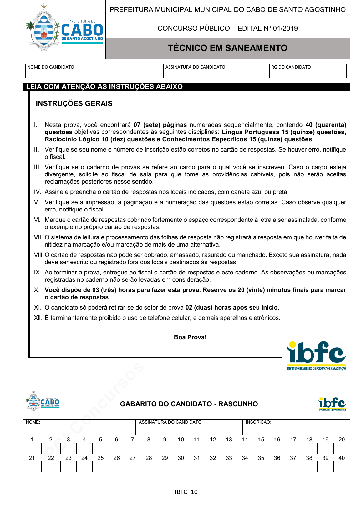pcimarkpci MDAwMDowMDAwOjAwMDA6MDAwMDowMDAwOmZmZmY6OGE2MTo0MGUy:RnJpLCAxMyBEZWMgMjAxOSAxMTo0MDowMCAtMDMwMA== IBFC_10 PREFEITURA MUNICIPAL MUNICIPAL DO CABO DE SANTO AGOSTINHO CONCURSO PÚBLICO – EDITAL Nº 01/2019 TÉCNICO EM SANEAMENTO LEIA COM ATENÇÃO AS INSTRUÇÕES ABAIXO INSTRUÇÕES GERAIS I. Nesta prova, você encontrará 07 (sete) páginas numeradas sequencialmente, contendo 40 (quarenta) questões objetivas correspondentes às seguintes disciplinas: Língua Portuguesa 15 (quinze) questões, Raciocínio Lógico 10 (dez) questões e Conhecimentos Específicos 15 (quinze) questões. II. Verifique se seu nome e número de inscrição estão corretos no cartão de respostas. Se houver erro, notifique o fiscal. III. Verifique se o caderno de provas se refere ao cargo para o qual você se inscreveu. Caso o cargo esteja divergente, solicite ao fiscal de sala para que tome as providências cabíveis, pois não serão aceitas reclamações posteriores nesse sentido. IV. Assine e preencha o cartão de respostas nos locais indicados, com caneta azul ou preta. V. Verifique se a impressão, a paginação e a numeração das questões estão corretas. Caso observe qualquer erro, notifique o fiscal. VI. Marque o cartão de respostas cobrindo fortemente o espaço correspondente à letra a ser assinalada, conforme o exemplo no próprio cartão de respostas. VII. O sistema de leitura e processamento das folhas de resposta não registrará a resposta em que houver falta de nitidez na marcação e/ou marcação de mais de uma alternativa. VIII. O cartão de respostas não pode ser dobrado, amassado, rasurado ou manchado. Exceto sua assinatura, nada deve ser escrito ou registrado fora dos locais destinados às respostas. IX. Ao terminar a prova, entregue ao fiscal o cartão de respostas e este caderno. As observações ou marcações registradas no caderno não serão levadas em consideração. X. Você dispõe de 03 (três) horas para fazer esta prova. Reserve os 20 (vinte) minutos finais para marcar o cartão de respostas. XI. O candidato só poderá retirar-se do setor de prova 02 (duas) horas após seu início. XII. É terminantemente proibido o uso de telefone celular, e demais aparelhos eletrônicos. Boa Prova! GABARITO DO CANDIDATO - RASCUNHO NOME: ASSINATURA DO CANDIDATO: INSCRIÇÃO: 1 2 3 4 5 6 7 8 9 10 11 12 13 14 15 16 17 18 19 20 21 22 23 24 25 26 27 28 29 30 31 32 33 34 35 36 37 38 39 40 NOME DO CANDIDATO ASSINATURA DO CANDIDATO RG DO CANDIDATO pcimarkpci MDAwMDowMDAwOjAwMDA6MDAwMDowMDAwOmZmZmY6OGE2MTo0MGUy:RnJpLCAxMyBEZWMgMjAxOSAxMTo0MDowMCAtMDMwMA== RASCUNHO pcimarkpci MDAwMDowMDAwOjAwMDA6MDAwMDowMDAwOmZmZmY6OGE2MTo0MGUy:RnJpLCAxMyBEZWMgMjAxOSAxMTo0MDowMCAtMDMwMA== IBFC_10 1 LÍNGUA PORTUGUESA Leia o texto abaixo para responder as questões 1 a 5. Hino da Independência do Brasil Já podeis, da Pátria filhos, Ver contente a mãe gentil; Já raiou a liberdade No horizonte do Brasil. Brava gente brasileira! Longe vá... temor servil: Ou ficar a pátria livre Ou morrer pelo Brasil. Os grilhões que nos forjava Da perfídia astuto ardil... Houve mão mais poderosa: Zombou deles o Brasil. Não temais ímpias falanges, Que apresentam face hostil; Vossos peitos, vossos braços São muralhas do Brasil. [...] Evaristo Ferreira da Veiga 1) De acordo com o texto, analise as afirmativas e assinale a alternativa correta. I. O texto é um hino de exaltação ao povo brasileiro e comemora um momento marcante para a história do país. Marca o fim de um tempo de servidão à coroa portuguesa. II. “Os grilhões que nos forjava / Da perfídia astuto ardil...” As palavras destacadas significam respectivamente: algemas, lealdade, penhor. III. “Vossos peitos, vossos braços / São muralhas do Brasil.” O termo destacado carrega o sentido de que os brasileiros são capazes de proteger e guardar o país. a) As afirmativas I, II e III estão corretas. b) Apenas as afirmativas II e III estão corretas. c) Apenas as afirmativas I e III estão corretas. d) Apenas as afirmativas I e II estão corretas. 2) Observe: “Já podeis, da Pátria filhos,/Ver contente a mãe gentil;”. Assinale a alternativa que apresenta a correta classificação sintática da expressão destacada. a) Substantivo. b) Sujeito Composto. c) Sujeito Simples. d) Vocativo. 3) Analise os versos a seguir: “Já raiou a liberdade / No horizonte do Brasil” e assinale a alternativa correta. a) O núcleo do sujeito determinado simples é a palavra liberdade. b) O verbo “raiou” é transitivo indireto e “a liberdade” é o objeto indireto. c) “No horizonte do Brasil” é um adjunto adnominal. d) O complemento nominal do verbo “raiou” é “a liberdade”. 4) Observe os versos a seguir: “Ou ficar a pátria livre /Ou morrer pelo Brasil.” Quanto à relação e expressão das conjunções destacadas, assinale a alternativa correta. a) Oposição. b) Alternância. c) Explicação. d) Consequência. 5) As palavras: ímpias e perfídia, utilizadas no texto, são acentuadas de acordo com a mesma regra. Nesse sentido, assinale a alternativa que preencha correta e respectivamente as lacunas de acordo com a norma brasileira utilizada. “Estas palavras podem ser _____ ou _____ e são terminadas em _____ ou ______; assim, devem ser acentuadas.” a) proparoxítonas / oxítonas / vogal / semivogal b) oxítona / paroxítona / ditongo decrescente / semivogal c) paroxítona / proparoxítona / ditongo crescente / hiato d) proparoxítonas / oxítona / ditongo crescente / hiato 6) Assinale a alternativa em que há apenas uma palavra grafada incorretamente. a) realizar, concretisar, pesquisar, comercialisar b) humanizar, analizar, deslizar, suavizar c) problematizar, hospitalisar, canalizar, amenisar d) contabilisar, visualisar, paralisar, avisar 7) Observe o enunciado abaixo. “Vou-me embora pra Pasárgada, lá sou amigo do Rei”. (M.Bandeira) Quanto à regra de colocação pronominal utilizada, assinale a alternativa correta. a) Ê
