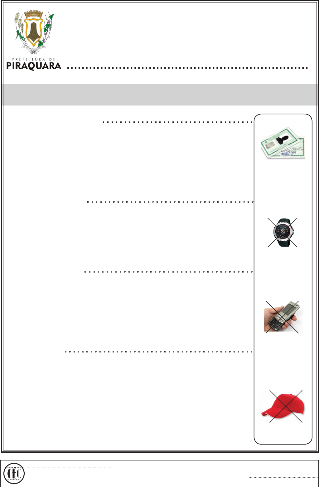 FISCAL Elaboração: CEC – Núcleo de Concursos É permitida a reprodução desse material, apenas para fins didáticos, desde que citada a fonte. APLICAÇÃO: 19/10/2014 INSTRUÇÕES [Estas instruções passam a fazer parte do Edital n.º 057/2014 da Prefeitura Municipal de Piraquara.] 01. Deixe sobre a carteira escolar apenas o material estritamente necessário para a realização da prova (caneta, lápis, borracha e apontador) e a Cédula de Identidade. 02. No decorrer da prova, você assinará a lista de presença. 03. Você receberá do Fiscal os seguintes materiais: a) este caderno de prova; e b) a folha de respostas. CADERNO DE PROVA 04. Este caderno de prova deve conter 40 (quarenta) questões, numeradas de 01 a 40. Con- fira-o antes de iniciar a prova. Caso encontre algum defeito, levante o braço e aguarde a chegada do Fiscal. Após a prova ser iniciada, não será aceita qualquer reclamação sobre falhas na impressão e/ou montagem. 05. Em cada questão, somente UMA alternativa será aceita como resposta. 06. A interpretação das questões é parte integrante da prova. Evite perguntas. 07. A prova é individual. É vedada a comunicação entre os candidatos durante a prova. FOLHA DE RESPOSTAS 08. Confira se o seu nome, número de inscrição e número de sua identidade estão corre- tos na folha de respostas. Caso contrário, notifique imediatamente o Fiscal. 09. Não amasse, nem dobre a folha de respostas. Preencha-a com caneta esferográfica azul ou preta, escrita grossa. Não faça uso de borracha ou corretivo. 10. A marcação na folha de respostas é de inteira responsabilidade do candidato. 11. Procure responder a todas as questões. As questões não respondidas, com mais de uma resposta ou preenchidas em desacordo com as instruções da folha de respostas serão con- sideradas nulas. 12. Ao terminar a prova, devolva ao Fiscal a folha de respostas. Após a entrega, retire-se do local de prova. 13. Duração da prova: 03h (três horas), já incluído o tempo destinado à identificação do can- didato e ao preenchimento da folha de respostas. 14. Guarde o seu relógio antes do início da prova. O tempo de realização da prova será con- trolado pelo Fiscal de sala. 15. Desligue o seu telefone celular antes do início da prova e guarde-o. 16. Você somente poderá retirar-se da sala de provas após decorrida 1 (uma) hora de seu início. 17. Você poderá levar o seu caderno de prova somente após duas horas do início da prova. 18. Os 03 (três) últimos candidatos de cada sala deverão entregar a folha de respostas ao mesmo tempo, assinar o Termo de Encerramento de Prova e retirar-se, todos juntos, da sala. 19. A desobediência a qualquer uma das determinações destas instruções ou das constantes da folha de respostas poderá implicar a anulação da sua prova. Identidade com foto sobre a carteira escolar Não use Não use Não use PREFEITURA MUNICIPAL DE PIRAQUARA ESTADO DO PARANÁ EDITAL DE CONCURSO PÚBLICO N.o 057/2014 CONCURSO PÚBLICO – PREFEITURA DO MUNICÍPIO DE PIRAQUARA APLICAÇÃO: 19/10/2014 Elaboração: CEC – Núcleo de Concursos É permitida a reprodução, desde q ue citada a fonte. Folha 1/14 LÍNGUA PORTUGUESA O texto a seguir servirá de base para você respon- der às questões de 1 a 5. O MAPA DO CÉREBRO Drauzio Varella O cérebro humano é a estrutura mais complexa do Universo. Decifrar os mecanismos por meio dos quais ele consegue criar movimentos, percepções, pensa- mentos, memórias e a consciência é o maior desafio científico de todos os tempos. Está prestes a ser criado o BAM – Brain Activity Map (Mapa da Atividade Cerebral) –, um megaprojeto organizado para desenvolver novas gerações de técni- cas que permitam mapear a atividade de neurônio por neurônio, com precisão de milissegundos. Parece pretensão paranoide, mas não é. A neuro- ciência tem feito enormes avanços na tecnologia que tor- nou possível estudar as funções de neurônios isolados. Imagens do cérebro em ação podem ser obtidas através da ressonância magnética funcional, método que consiste em injetar na veia glicose marcada com isótopos radioativos, e analisar através da ressonância sua distribuição pelas diferentes áreas cerebrais, en- quanto a pessoa realiza funções como andar, rir, olhar para figuras que despertam compaixão, raiva, atração sexual, solidariedade. Apesar desses avanços, os mecanismos respon- sáveis pela percepção, cognição e ação permanecem misteriosos porque resultam de interações em tempo real de grande número de neurônios, conectados em redes que formam circuitos de altíssima complexidade. O projeto BAM propõe construir pontes que permi- tam descrever e manipular as atividades desses circui- tos e redes de neurônios e até de cérebros inteiros, com a precisão em microescala de neurônio por neurônio. O programa tem três objetivos: 1) Construir ferramentas capazes de, a um só tempo, obter imagens da maioria ou de todos os neurô- nios que fazem parte de cada circuito envolvido nas funções cerebrais; 2) Desenvolver métodos para interferir com o funcio- namento de cada neurônio, desses circuitos; 3) Entender as funções essenciais de circuito por cir- cuito. Para atingir tais objetivos, é necessário criar pro- gramas de informática capazes de armazenar, mani- pular e compartilhar dados de imagens e propriedades fisiológicas, em larga escala, que serão compartilhados com todos os investigadores participantes. Será obriga- toriamente um esforço de colaboração internacional en- tre neurocientistas, físicos, engenheiros e teóricos que trabalham na academia ou na indústria. Dentro de cinco anos, vai ser possível monitorar ou controlar dezenas de milhares de neurônios. Ao redor dos dez anos, esse número terá sido multiplicado por dez. Aos 15 anos, já poderemos observar a ação si- multânea de um milhão de neurônios. Nessa fase, es- taremos aptos a avaliar a função do cé